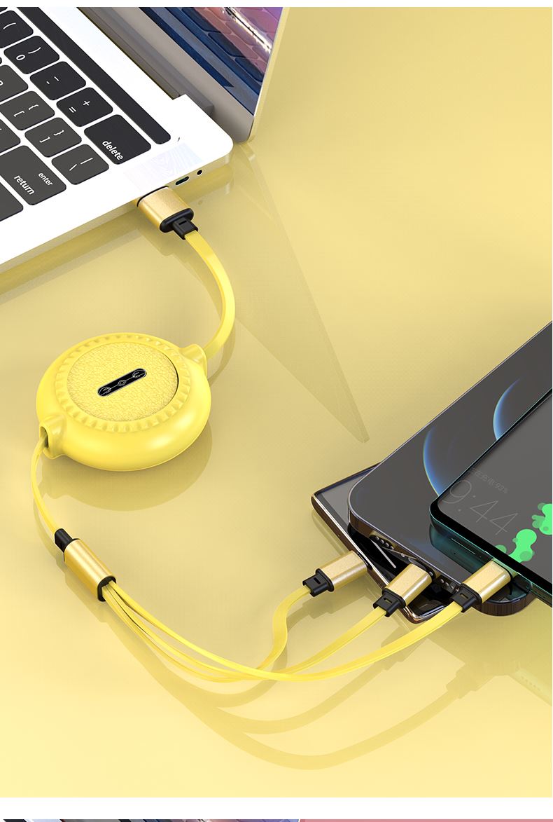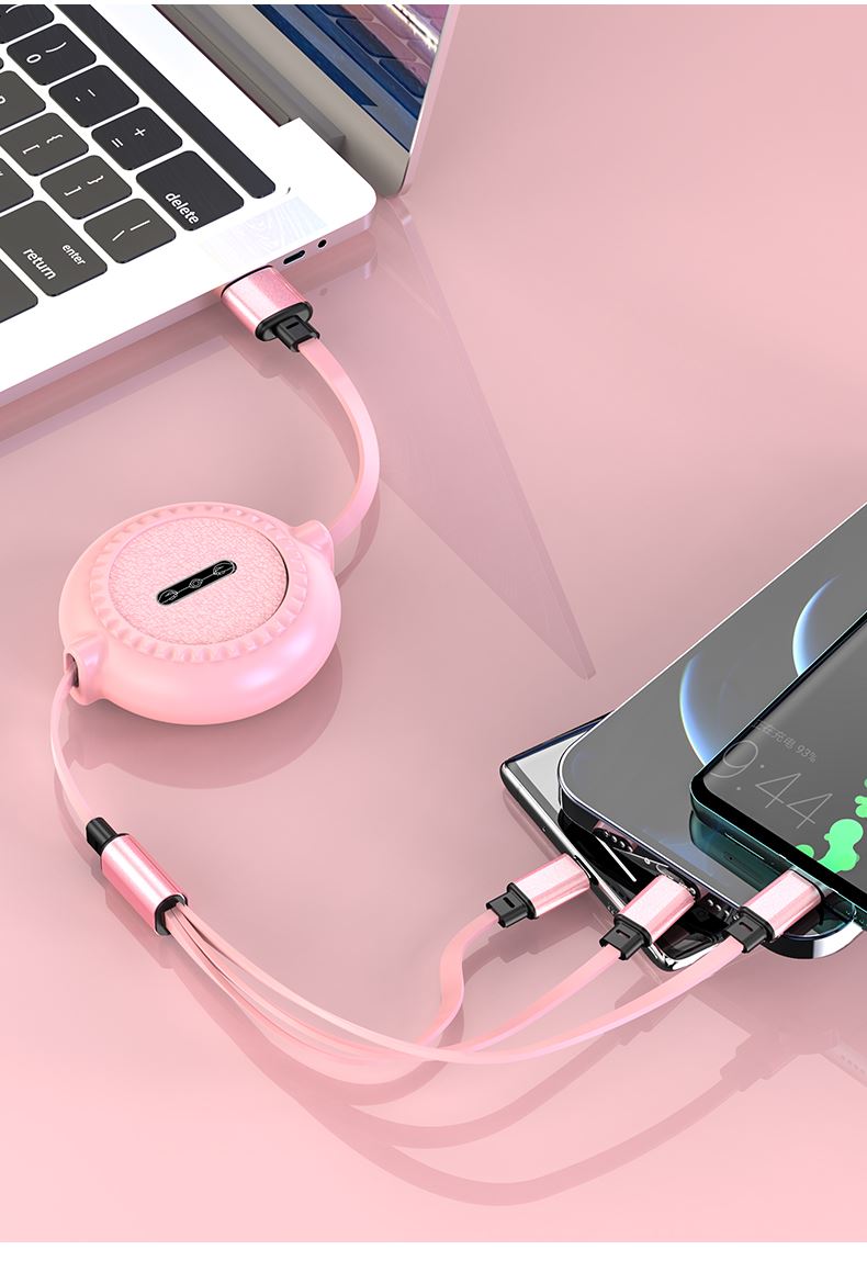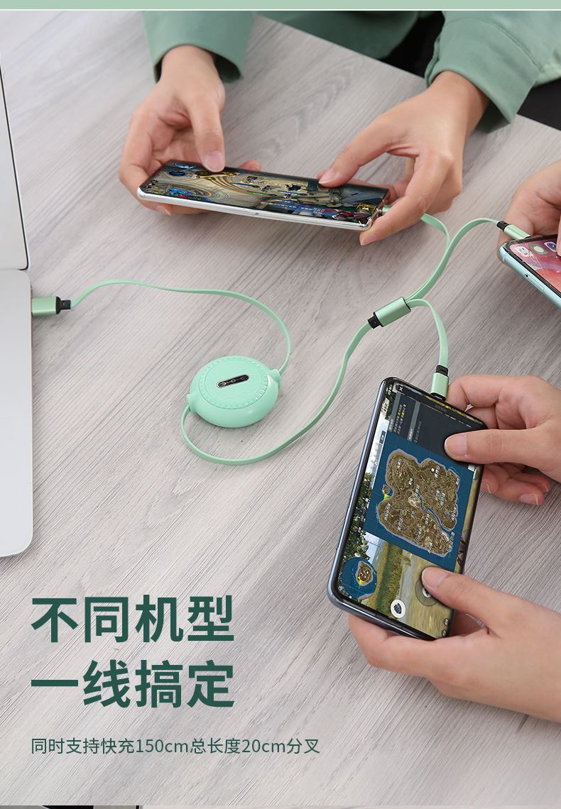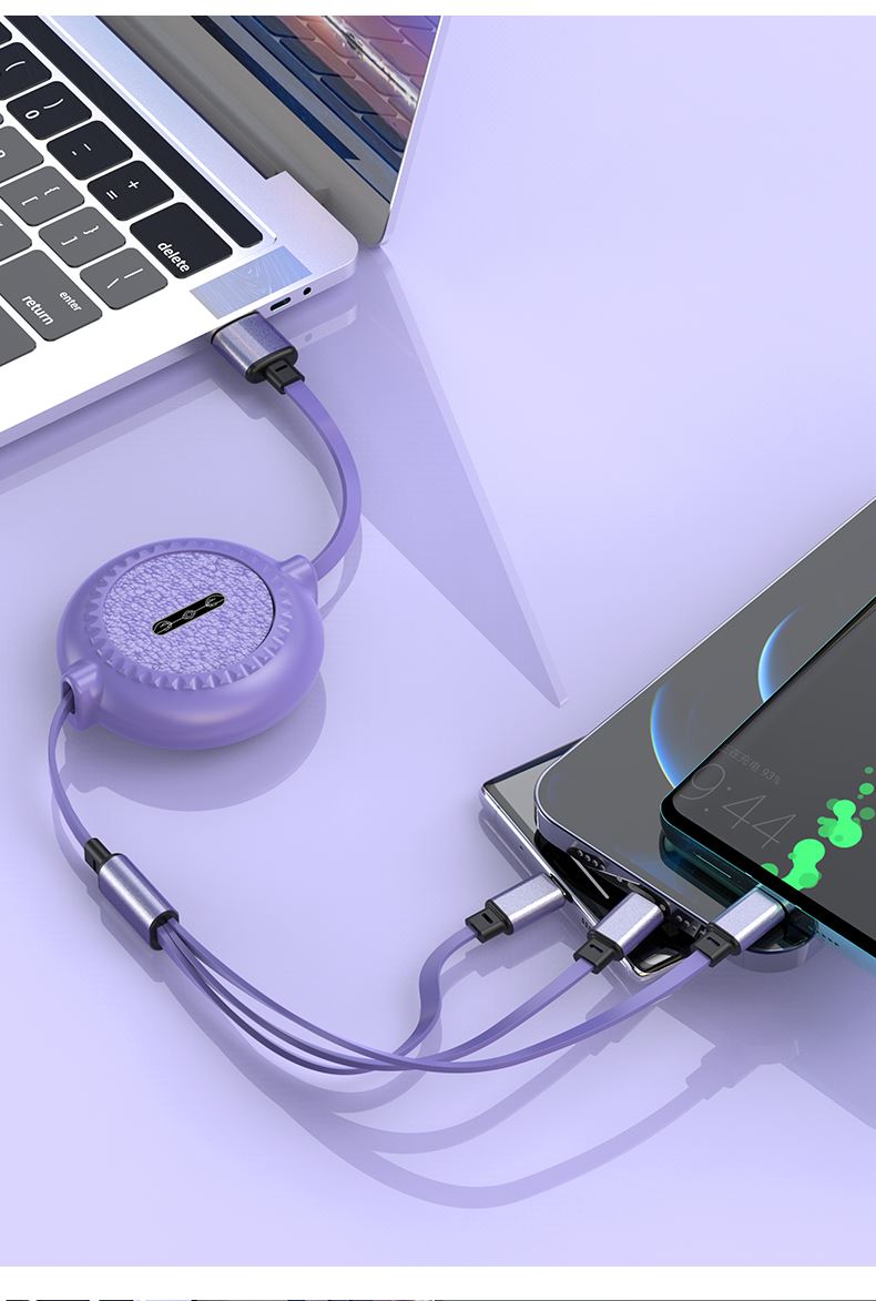 彩虹一拖三数据线 颜色:蓝 粉 绿 黑 红 黄 材质:TPE线 尺寸:1.1M 包装:彩盒包装 【功能特点】: 3A快充数据线,充电更快 三种接口满足各种手机 1.1米长度设计,使用方便 TPE材质耐用,不易折断 马卡龙配色多种选择 五档伸缩调节