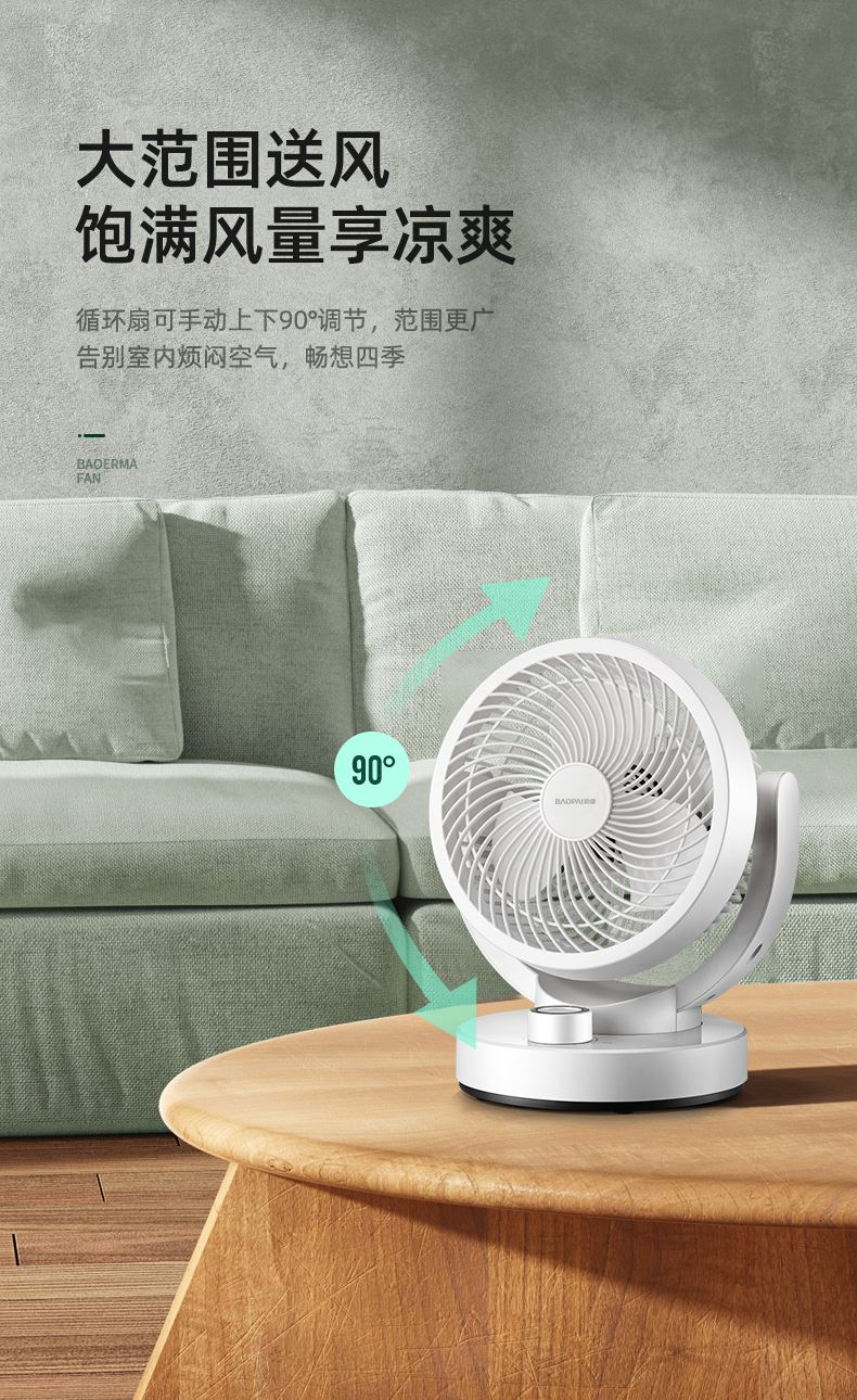 3档风速,满足不同风力需求 旋钮控制,使用方便 40W低功率,节能省电 上下90º送风角度手动可调节 电机低摩擦运行,低噪音,安静不打扰 加大风叶设计,风力更强劲 产品材质:ABS+PP 额定电压: 220V~ 额定频率:50Hz 额定功率: 40W 档位:三档风力 产品尺寸: 270*200*320mm 包装尺寸: 280*210*325mm 外箱尺寸:590*450*353mm 产品毛重: 1.7KG