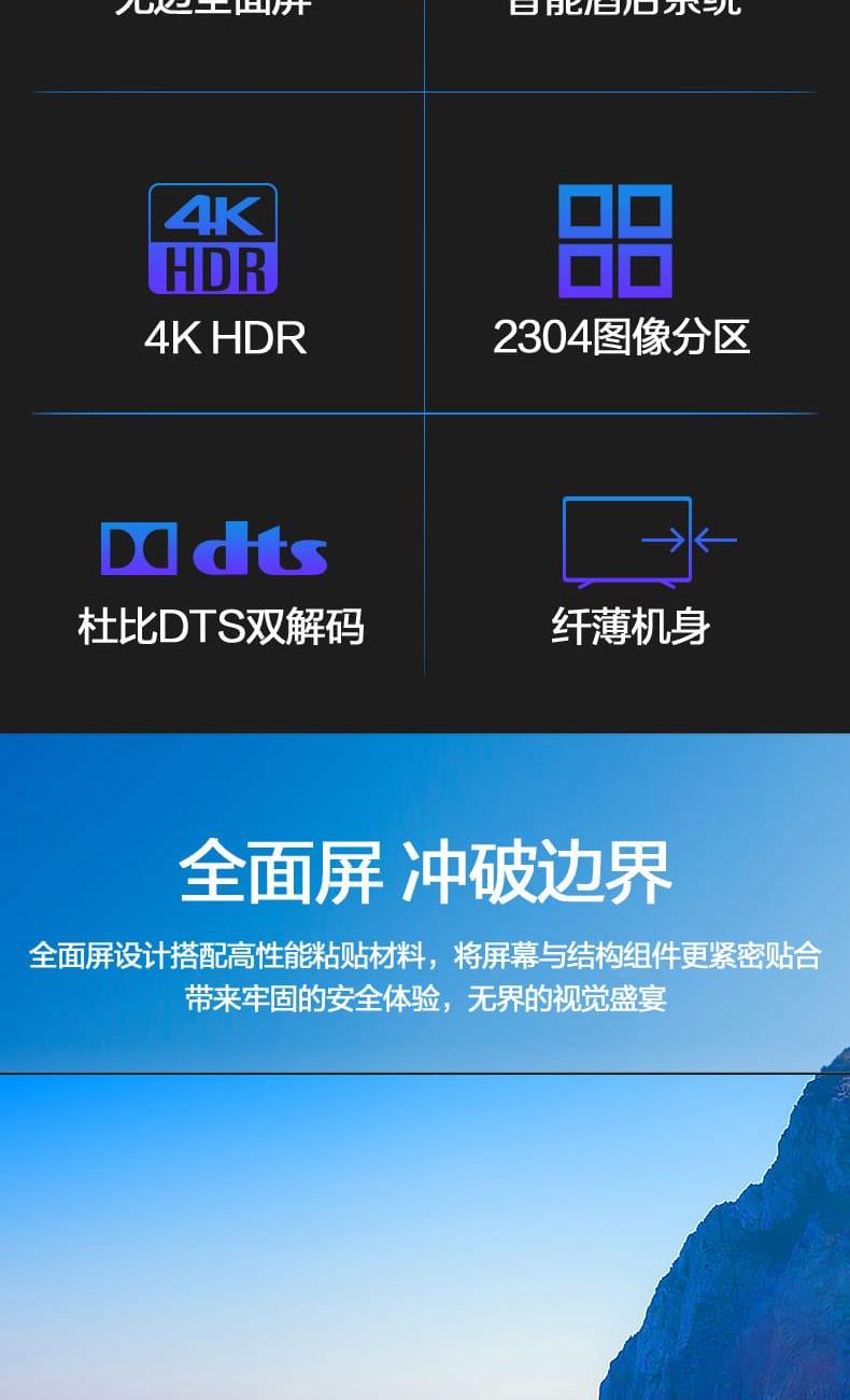 全面屏设计:上左右三边无边,视觉无边界,颜值高、显大气,百搭各种装修风格。