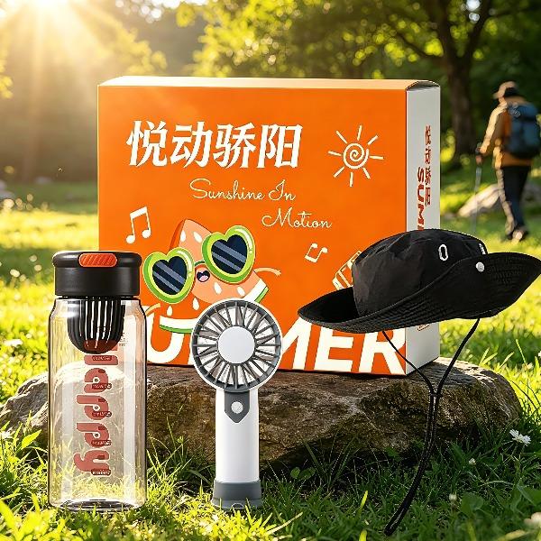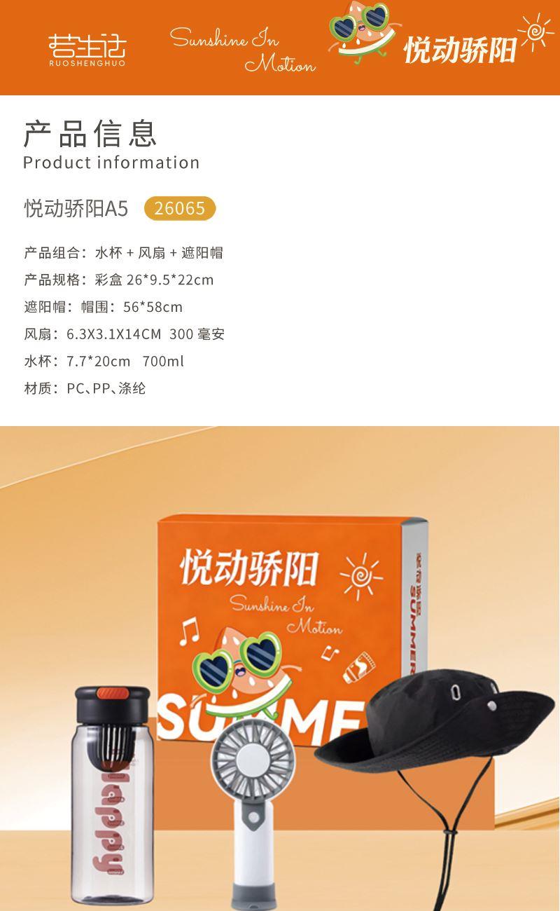 产品组合:水杯+风扇+遮阳帽 遮阳帽:帽围:56*58cm 风扇:6.3X3.1X14CM 300毫安 水杯:7.7*20cm 700ml 材质:PC、PP、涤纶 包装:彩盒