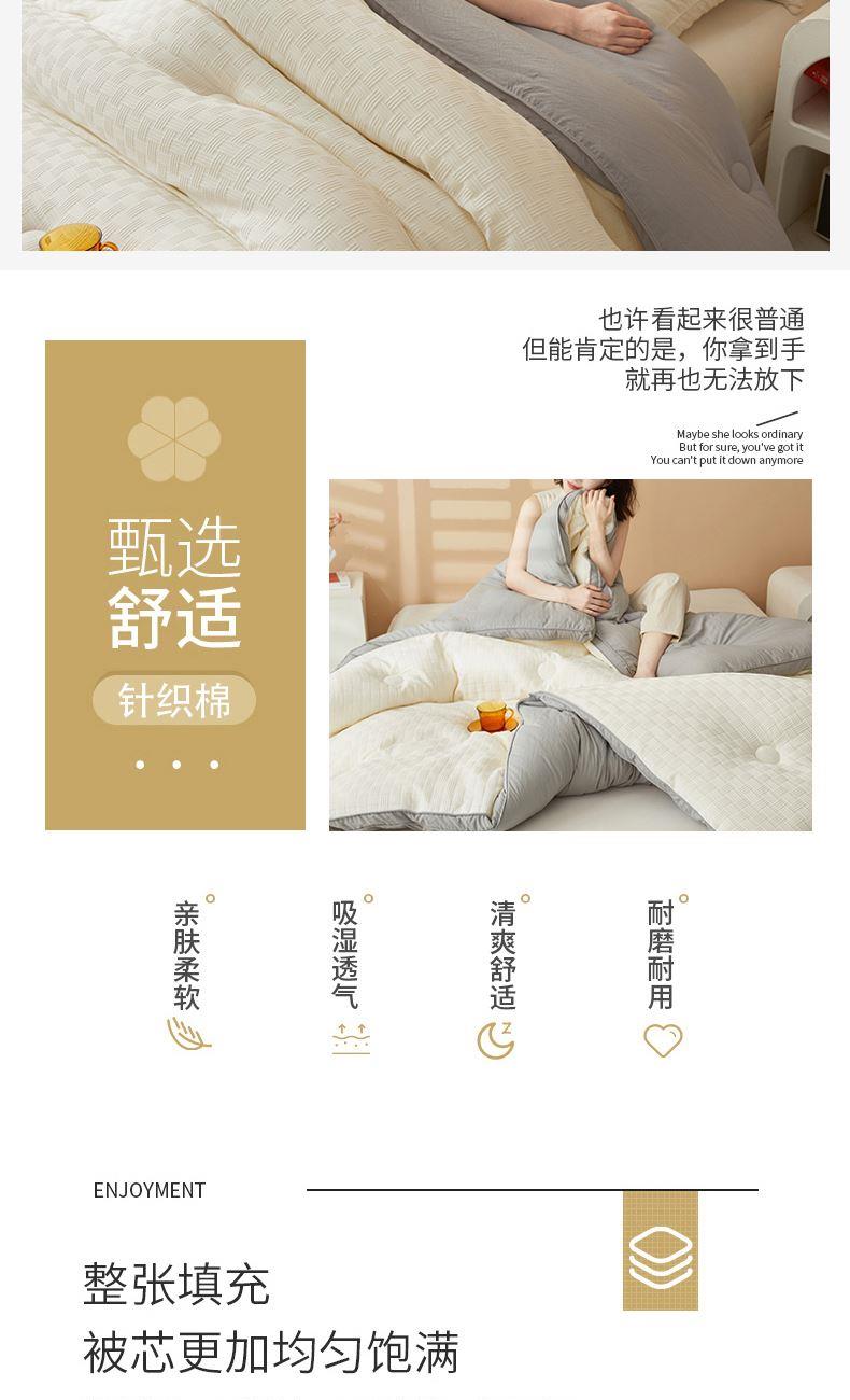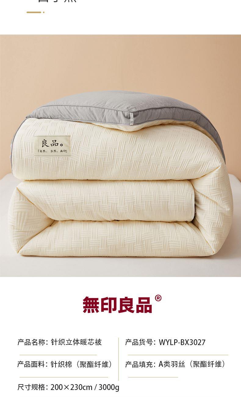 规 格:200×230cm 克重:3000g 面 料:针织棉(聚酯纤维) 填 充:A类羽丝(聚酯纤维) “無印良品”大染无印,优良品质的产品是年轻人喜欢的,“無印”设计, 优雅 , 质朴 , 自然 , 是無印良品的初心与追求。让体验更舒适。享受简约健康生活,走进無印,上善若水,大爱无疆,创新让生活更精彩。