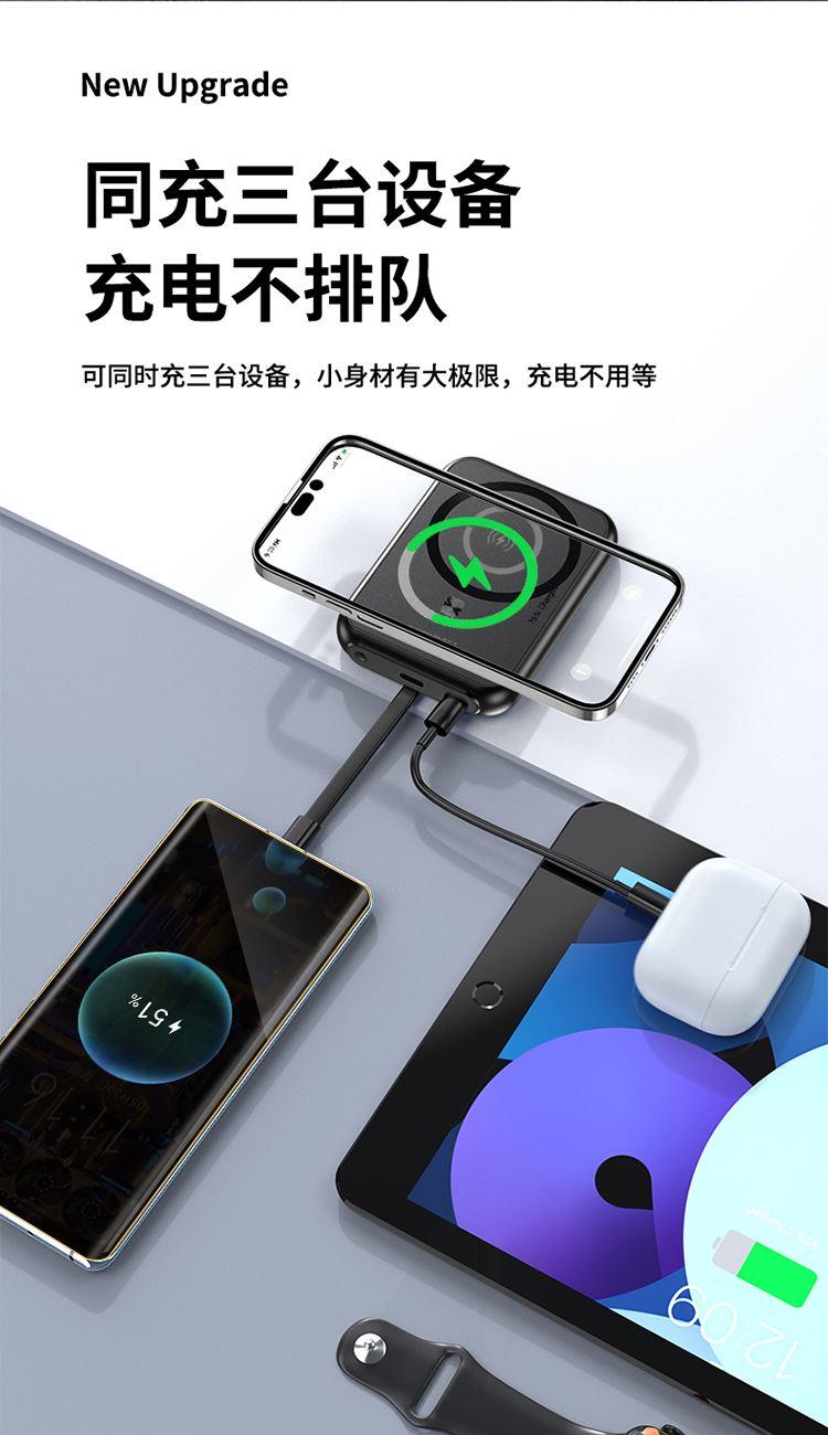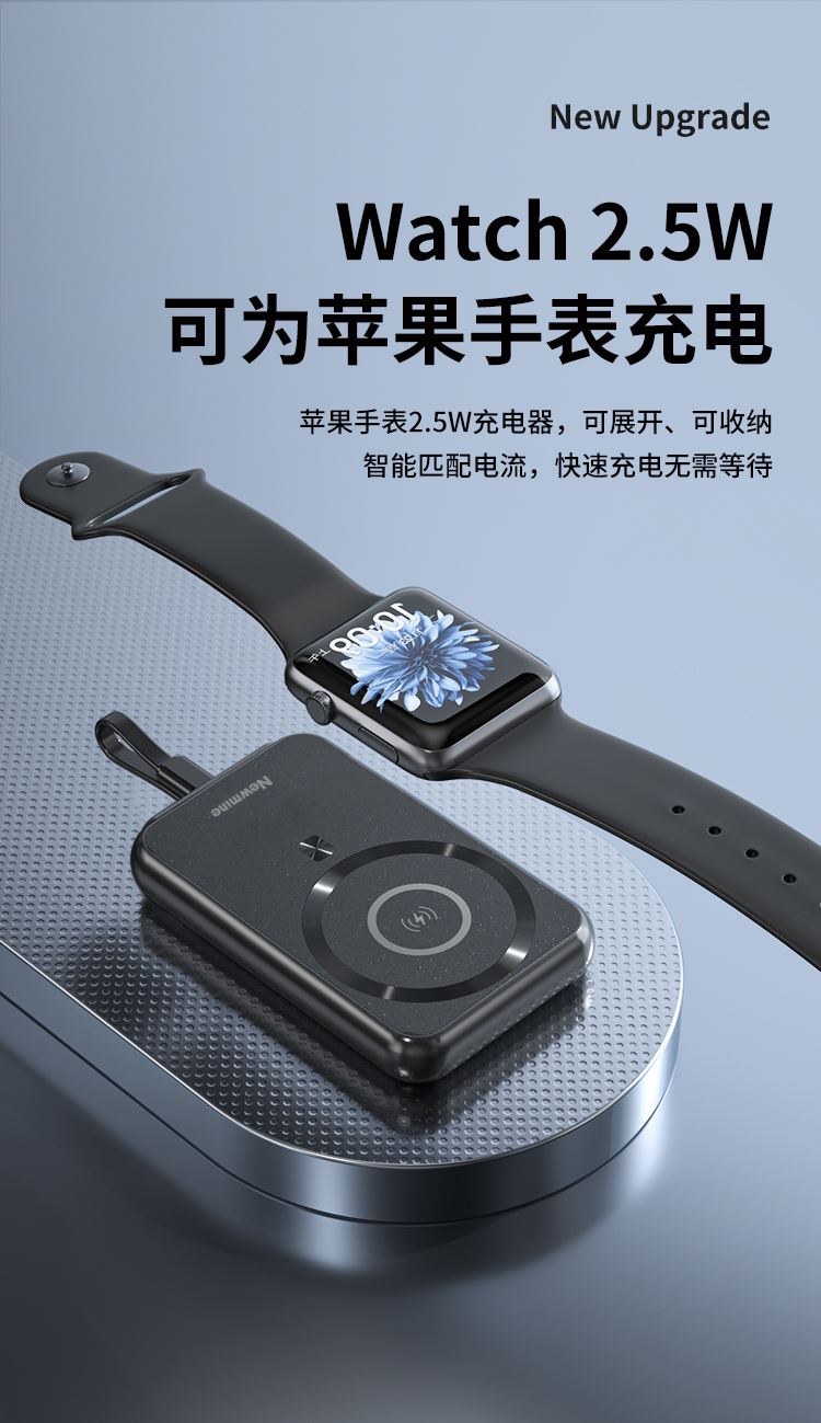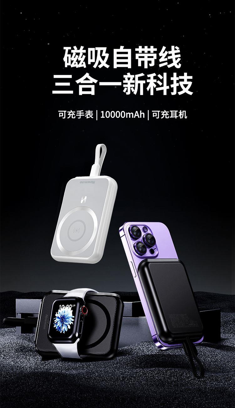 磁吸无线充,自带双向快充线,,10000毫安移动电源,支持手表无线充,天地盖礼盒包装。 电池容量:10000mAh,聚合物 输入:Type-c口/线:5V/3A,9V/2A,12V/1.5A 输出::ype-c口/线:5V/3A,9V/2.22A,12V/1.67A 手机无线充输出:15W(max) 手表无线充输出:2.5W(max) 总输出:5V-3A