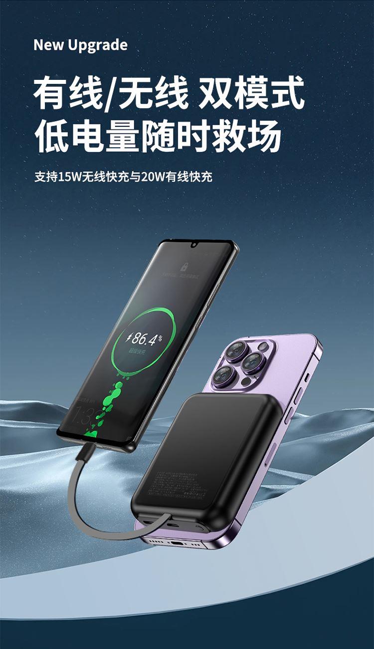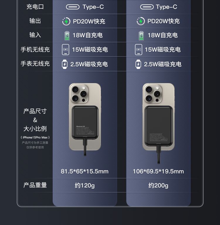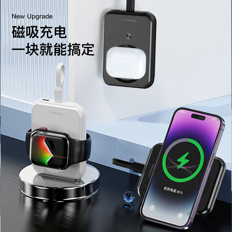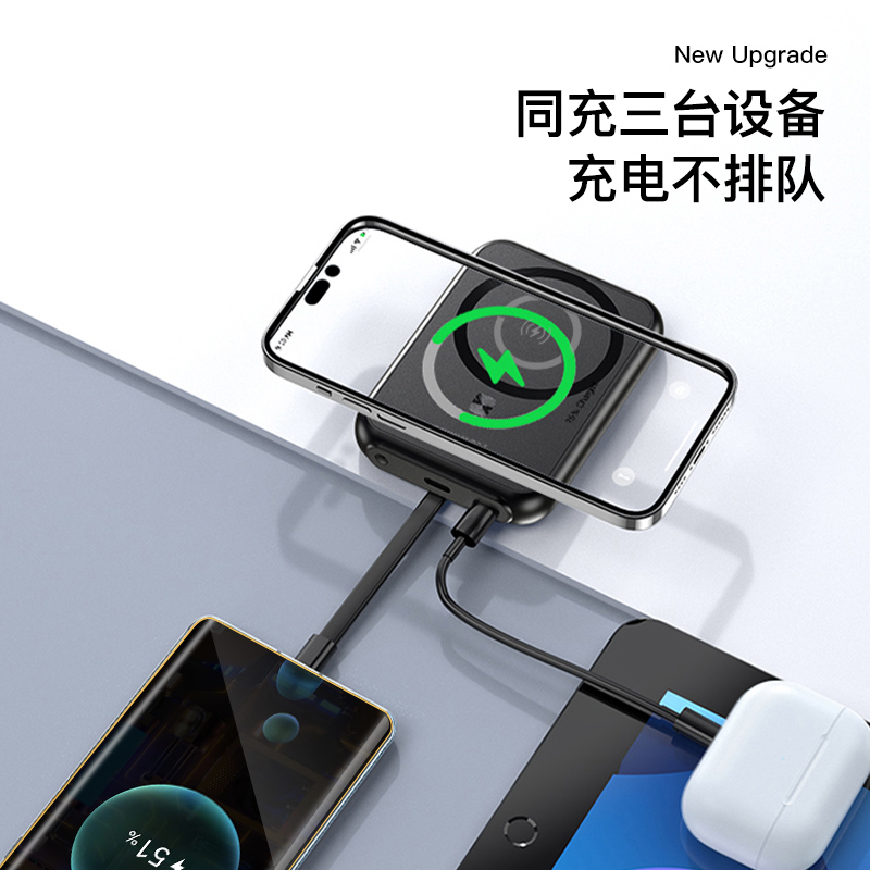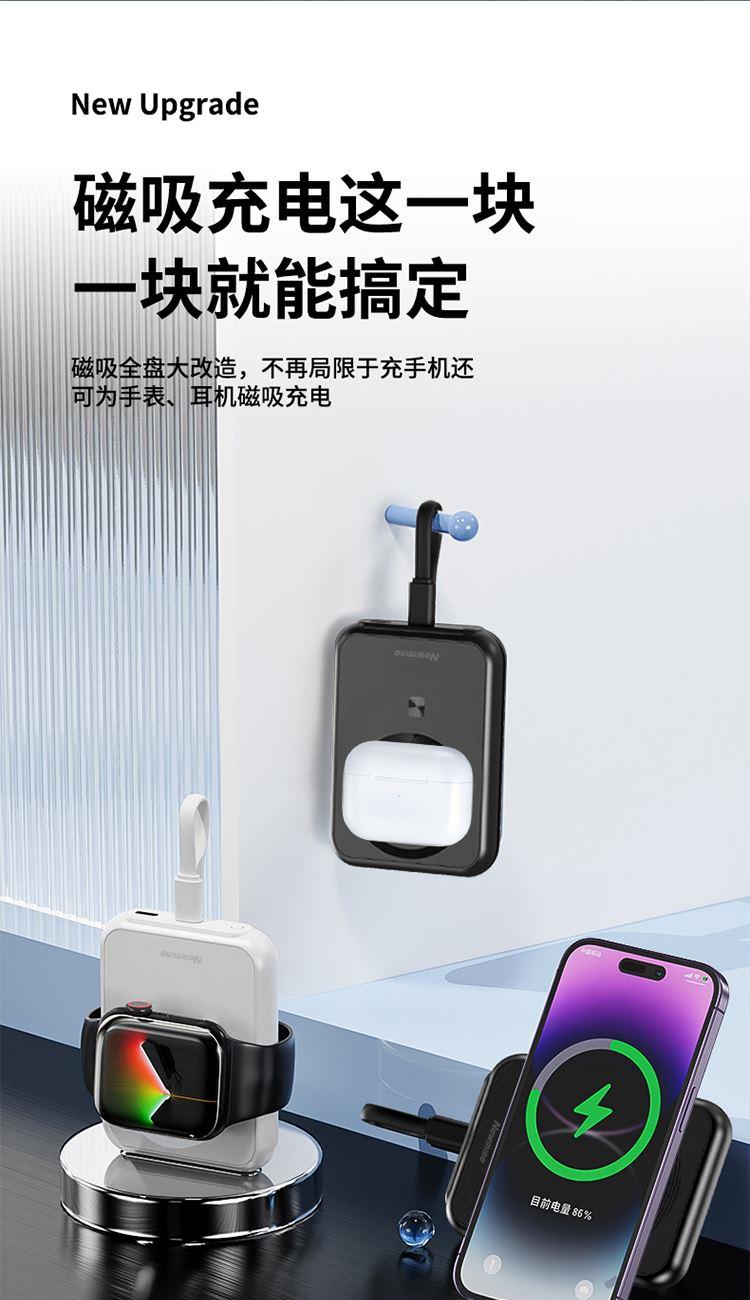 磁吸无线充,自带双向快充线,,10000毫安移动电源,支持手表无线充,天地盖礼盒包装。 电池容量:10000mAh,聚合物 输入:Type-c口/线:5V/3A,9V/2A,12V/1.5A 输出::ype-c口/线:5V/3A,9V/2.22A,12V/1.67A 手机无线充输出:15W(max) 手表无线充输出:2.5W(max) 总输出:5V-3A