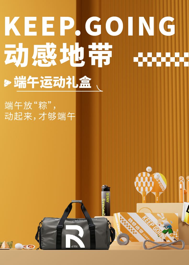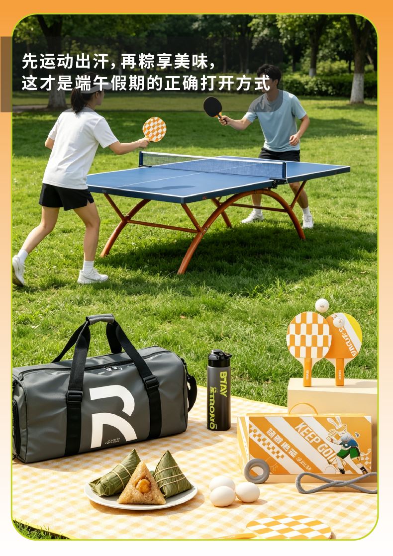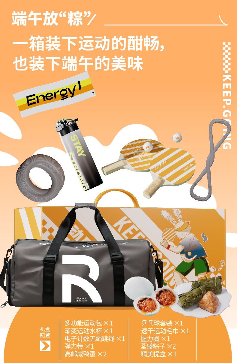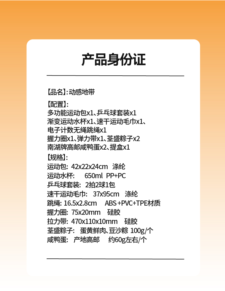 礼盒配置:多功能运动包*1、乒乓球套装*1 渐变运动水杯*1、速干运动毛巾*1、 电子计数无绳跳绳*1 握力圈*1、弹力带*1、荃盛粽子*2 南湖牌高邮咸鸭蛋*2、提盒*1