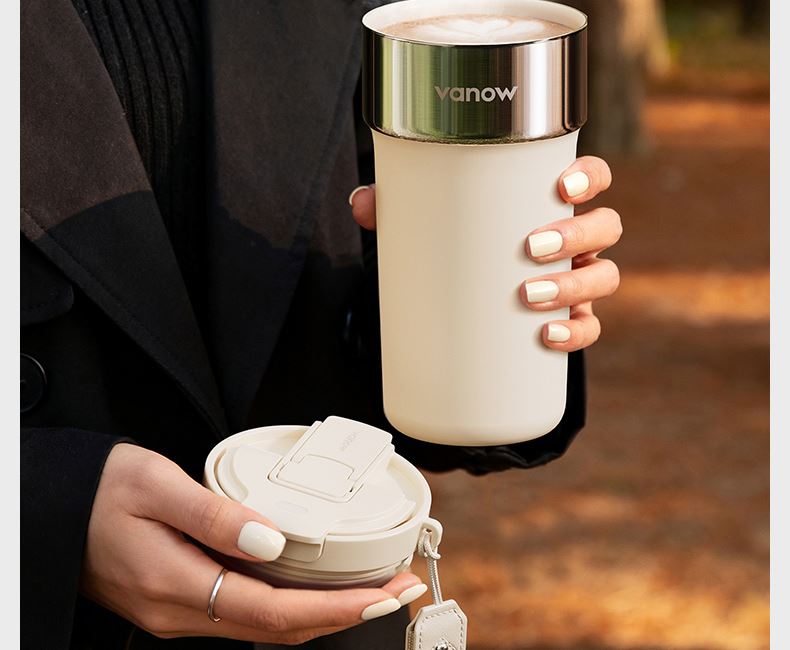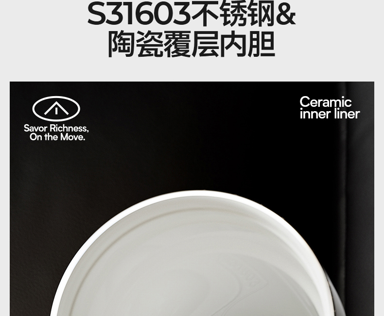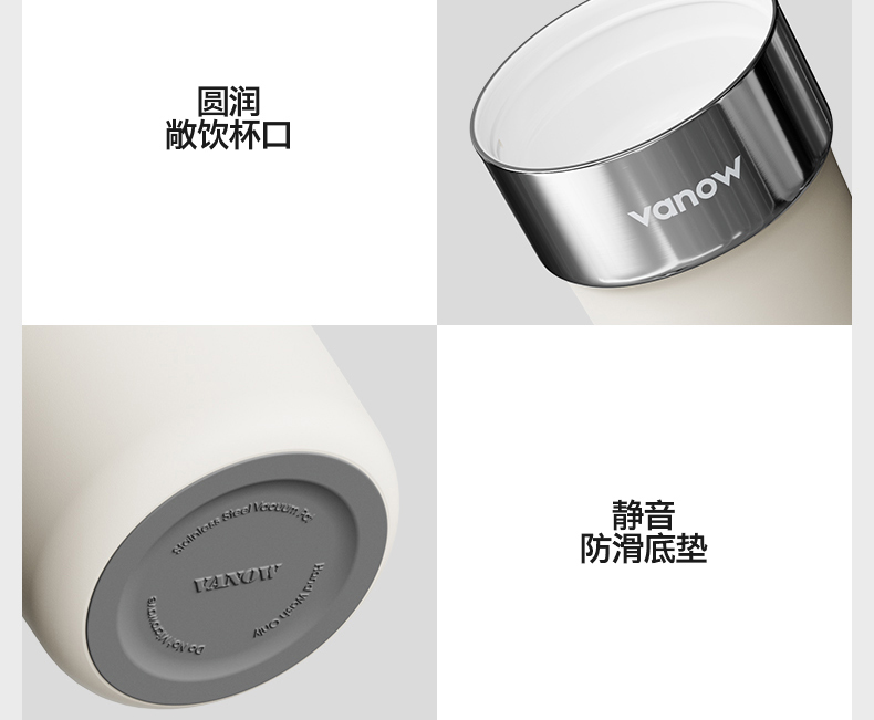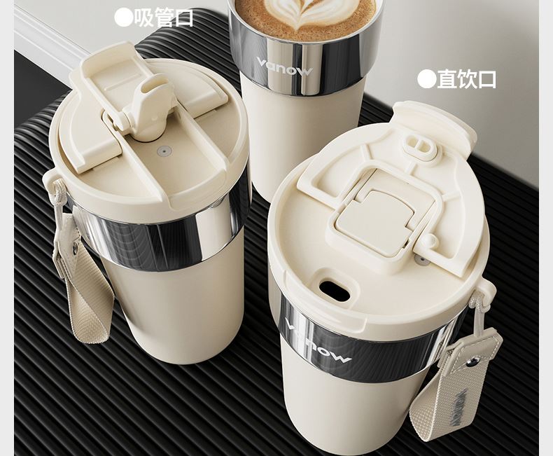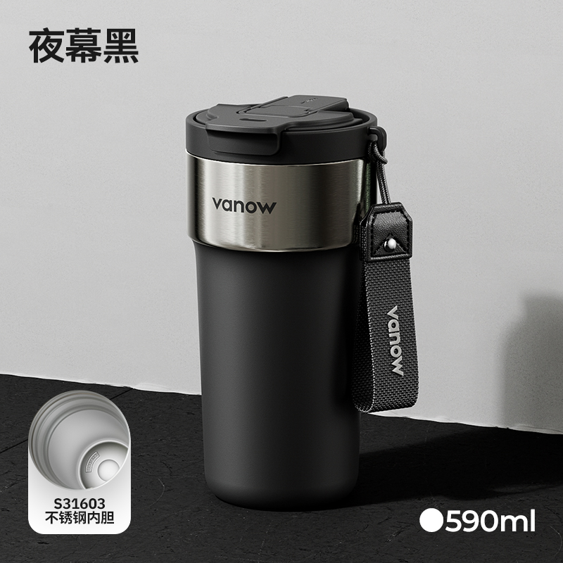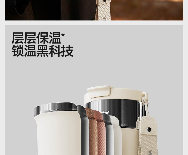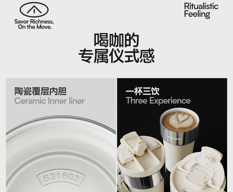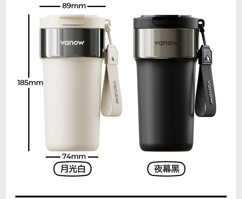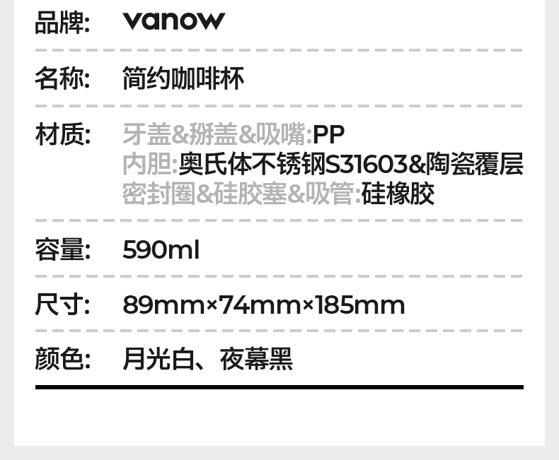 型号:VO-JY59WKF、VO-JY59WKF-C 颜色:月光白,夜慕黑 容量:590ml 尺寸:89*74*185mm 材质:SUS316不锈钢内胆/陶瓷覆层内胆,硅橡胶,pp 1.三饮切换,喝法不重样 2.长效保温,守护原始口味 3.密封防漏,倒置角度hold住 4.柔软触感,高颜便携提绳