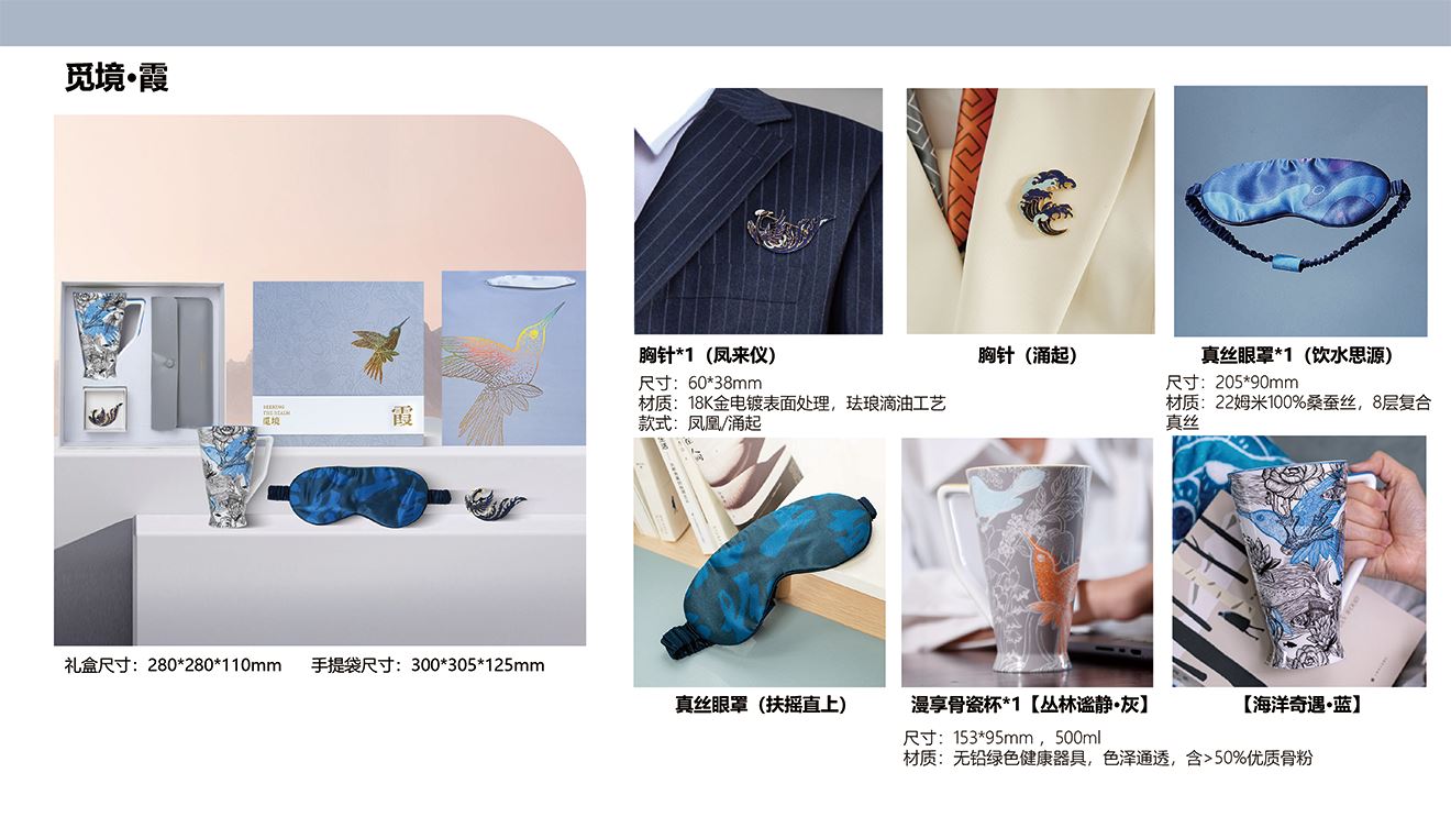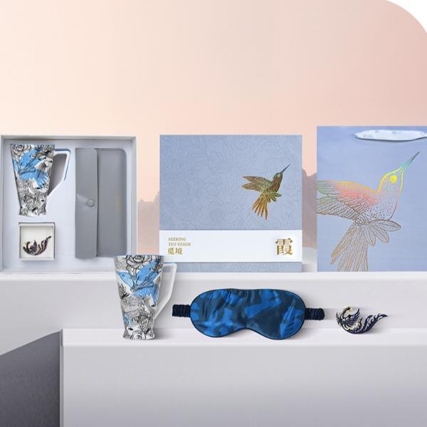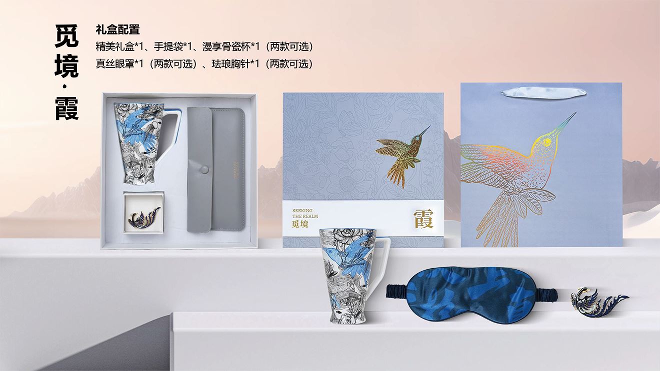 精美礼盒*1 手提袋*1 漫享骨瓷杯*1(两款可选) 真丝眼罩*1(两款可选) 珐琅胸针*1(两款可选)