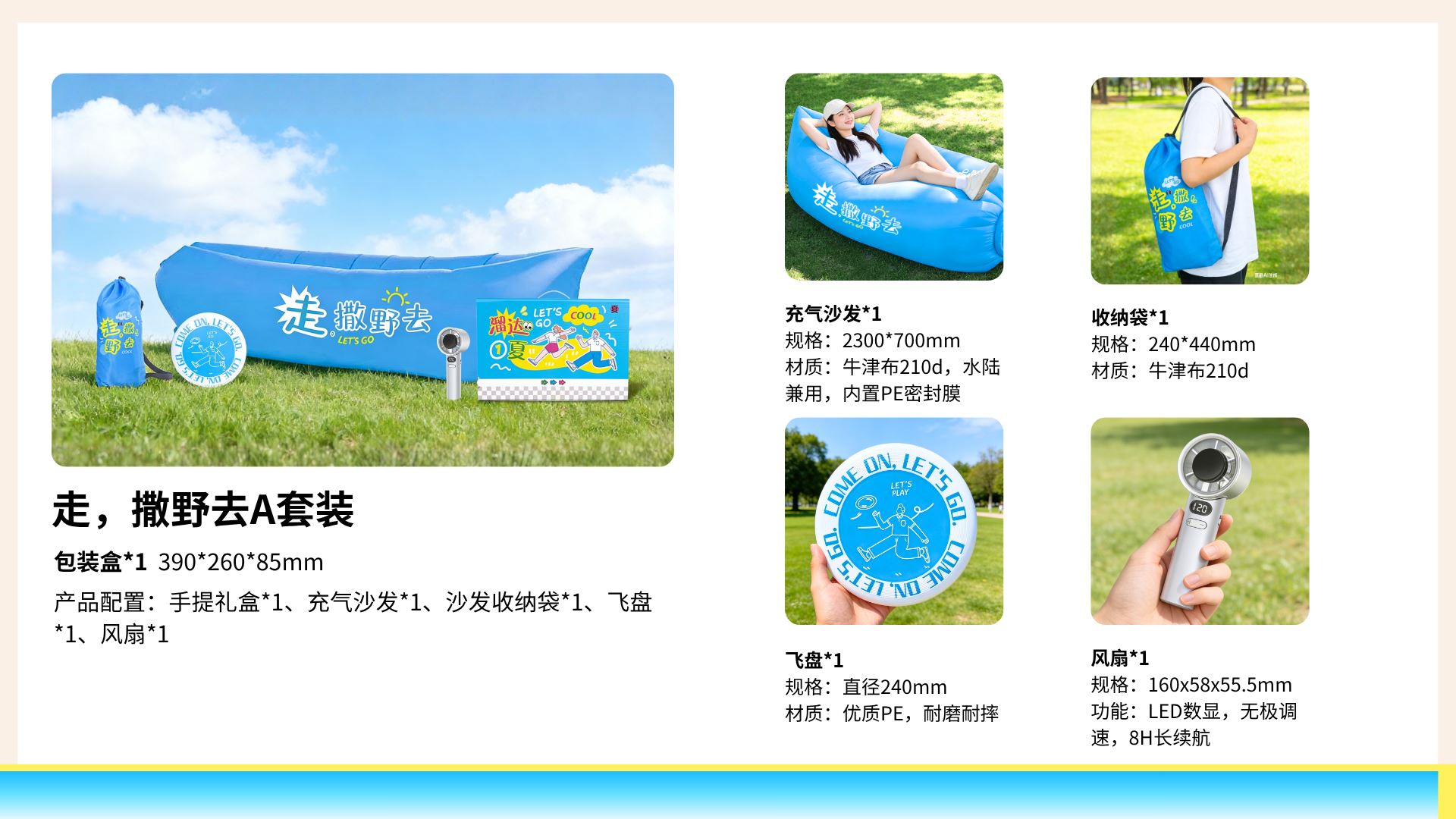 包装盒*1 390*260*85mm 产品配置:手提礼盒*1、充气沙发*1、沙发收纳袋*1、飞盘*1、风扇*1