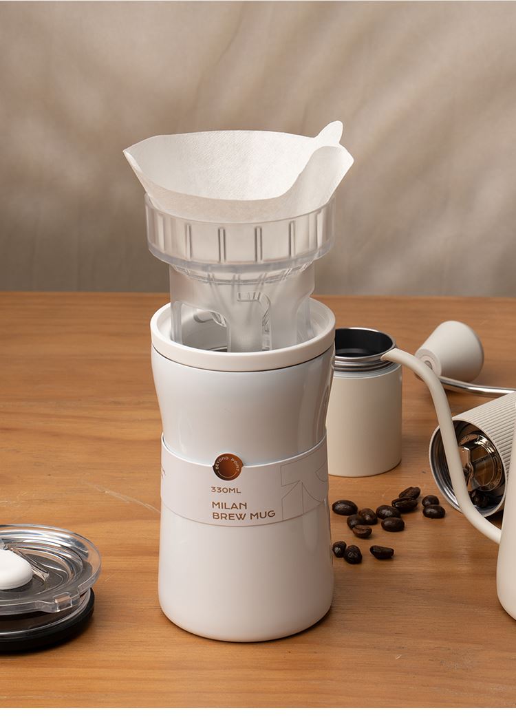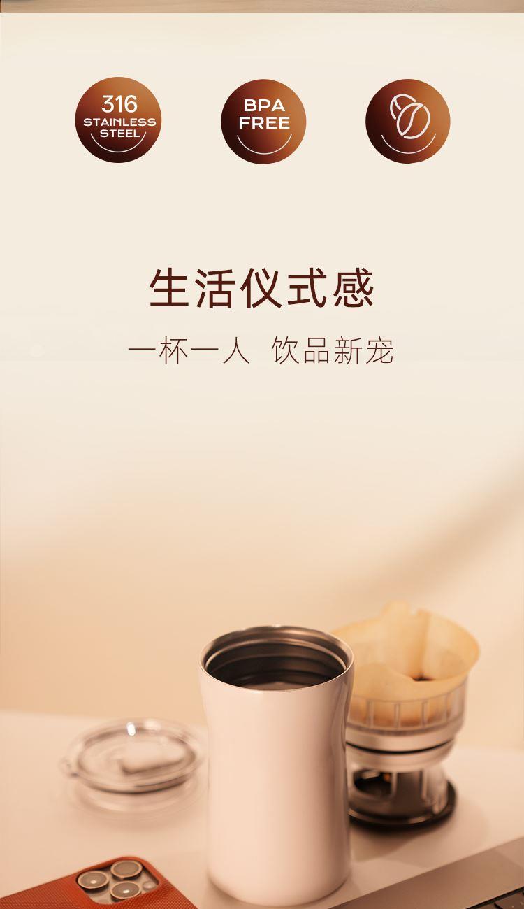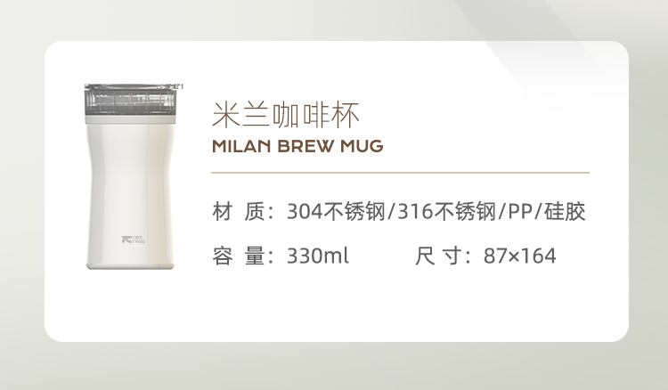 产品:VIBE-TRIBE米兰咖啡杯 产品尺寸:87*164 mm 彩盒尺寸:85*85*170 mm 产品材质:304不锈钢、316不锈钢、PP、Tritan、硅胶 核心卖点: 1. 将传统手冲咖啡所需的滤杯、壶身、保温杯功能整合为一体;一杯覆盖「冲 - 滤 - 饮 - 存」全流程;完成冲泡分享; 2. 双层316不锈钢内胆保温保冷,Tritan 滤杯耐摔透亮; 3.单手可握,居家、办公、户外一杯解锁全场景,分享咖啡。