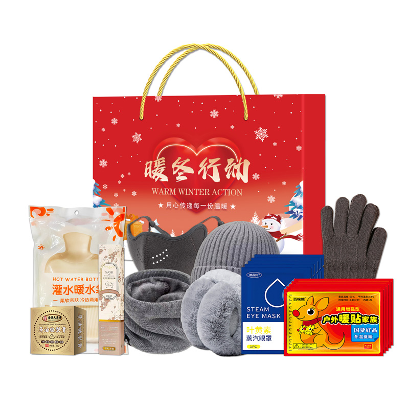 礼盒尺寸:32*8.5*24.5cm 包装尺寸:66*46.5*51CM 产品配置:(香型随机) 保暖手套(五指触屏) 保暖加绒围脖 云羔绒保暖口罩(澳绒透气) 保暖耳罩(可折叠) 香港大药房马油皲裂膏(50g) 暖水袋(500ml) 暖宝宝(1片装/袋)*5袋 叶黄素蒸汽眼罩(1片装/袋)*5袋 NAXR香氛护手霜(75g) 精美礼盒