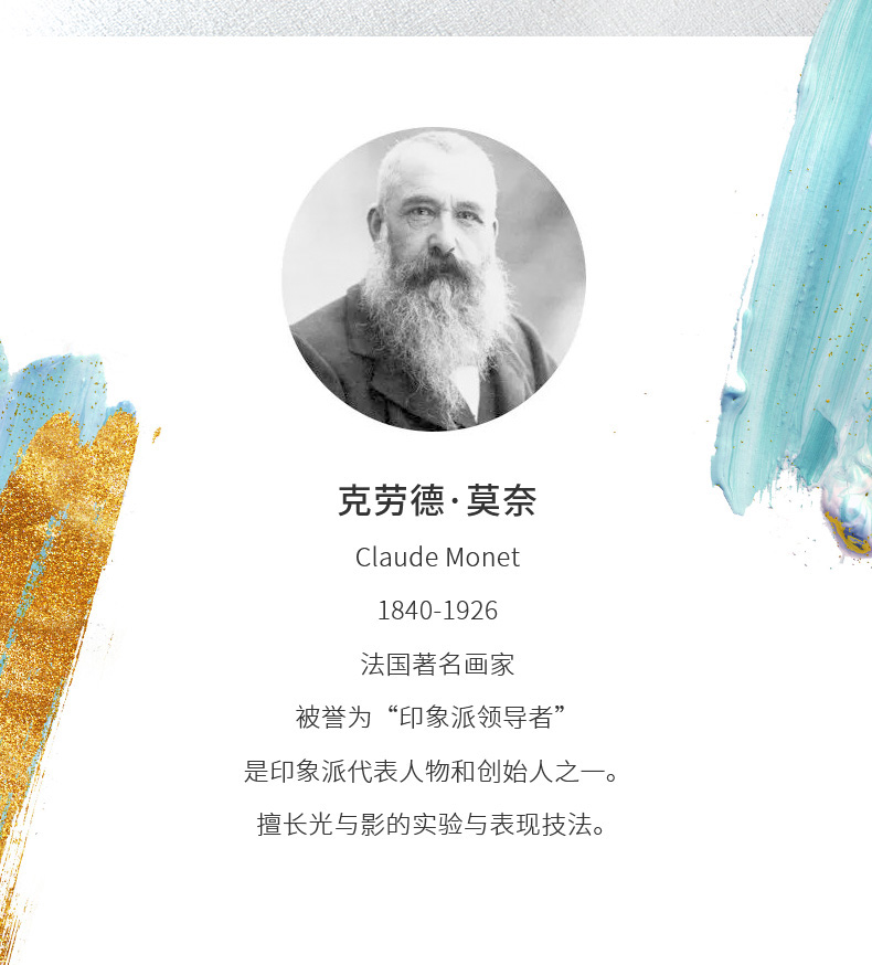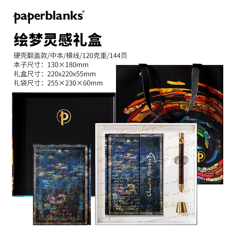 产品:绘梦灵感-莫奈睡莲木杆水性笔礼盒套装 创作灵感:封面文稿为莫奈1888年,写给同为印象派画家的贝特.莫里索的一封信,封面背景采用莫奈作品睡莲系列其中一幅,以此纪念莫奈对印象画派开创做出的贡献。 礼盒组件:黑柿木水性笔1只、黄铜笔座1个、中本笔记本、天地盖礼盒、彩色礼袋 礼盒尺寸:220*220*55mm 礼袋尺寸:255*230*60mm 本子尺寸:130*180mm 本子页数:144页 纸张材质:120克重无酸纸