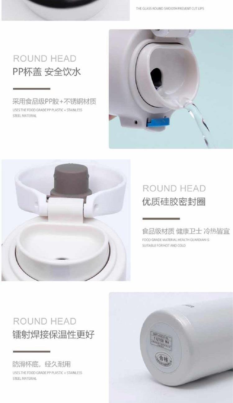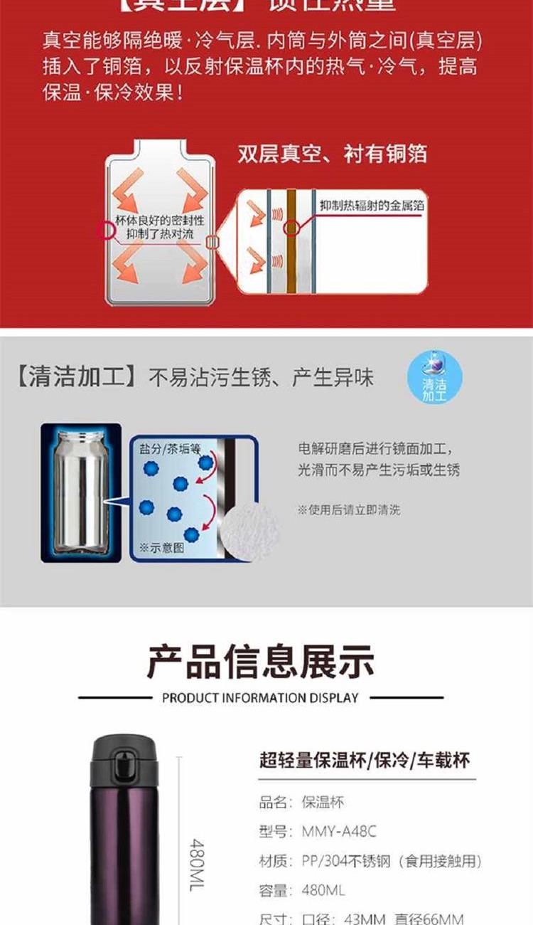 颜色:WH白色,VM黑紫色 容量:0.48L 尺寸: 7.0*7.0*22.6CM 保温效果(6小时/1小时):68/86℃以上 产品特点:超轻设计仅190G超轻杯身 单手易开型轻松喝水 饮水口触感柔和可拆卸清洗 采用日本进口高品质304不锈钢