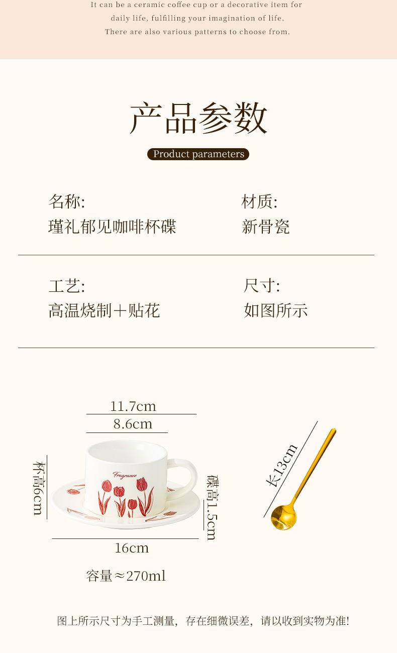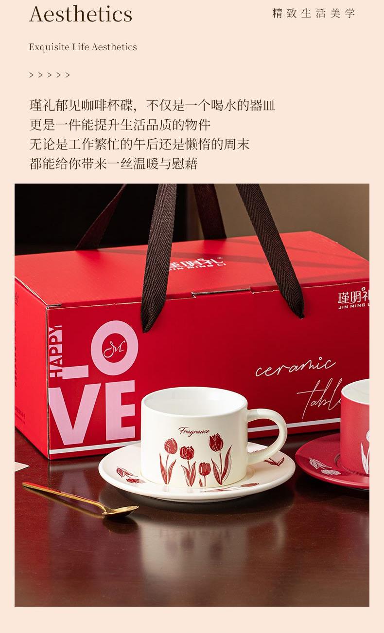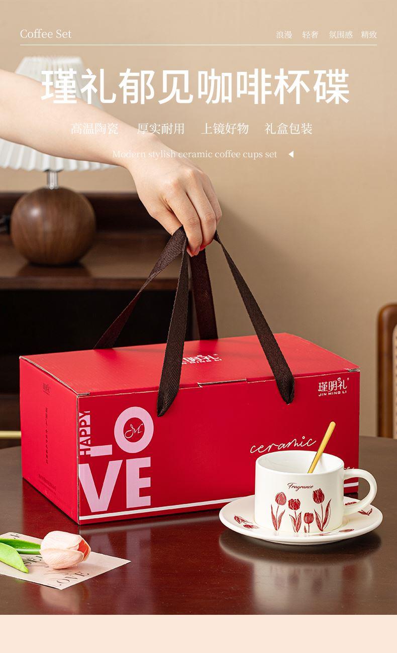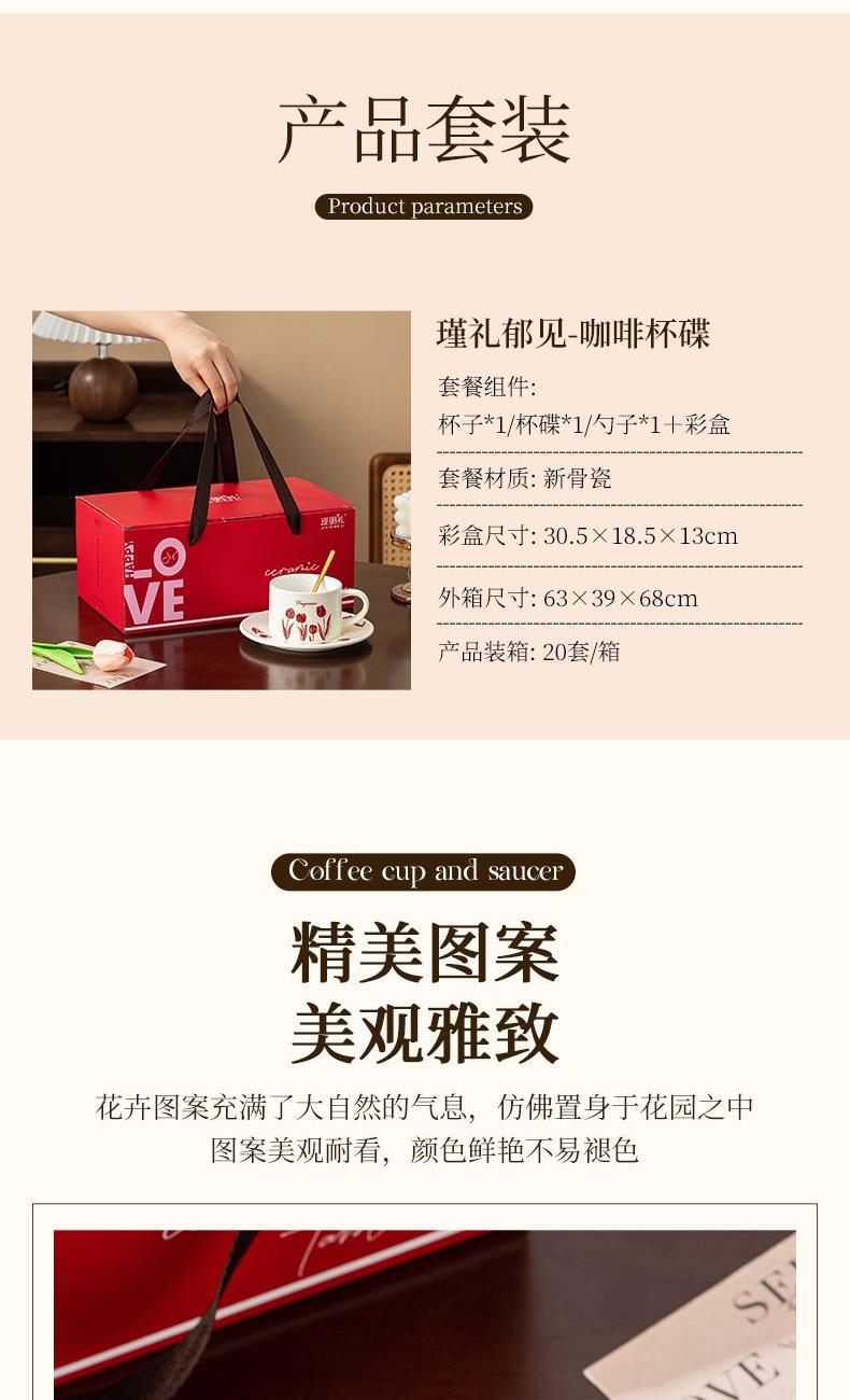 瑾礼郁见-咖啡杯碟-1杯1碟1勺 - 产品组成:整套=1杯1碟1勺+彩盒 产品材质:新骨瓷 容量:270ml 产品规格:杯=口径8.6cm,高度=6cm;碟=长度16cm, 金勺=长13cm; 彩盒尺寸:30.5*18.5*13cm 产品毛重:0.8kg 整箱毛重:17.2kg 外箱尺寸:63*39*68cm - 杯碟以郁金香为花面主题,郁金香优雅、浪漫的形象为产品注入了浓郁的艺术气息,为使用者营造出充满诗意的氛围。无论是在悠闲的午后还是忙碌的清晨,看到杯碟上绽放的郁金香,都能带来愉悦的视觉享受。让咖啡时间,沉浸在郁金香的浪漫花园中。