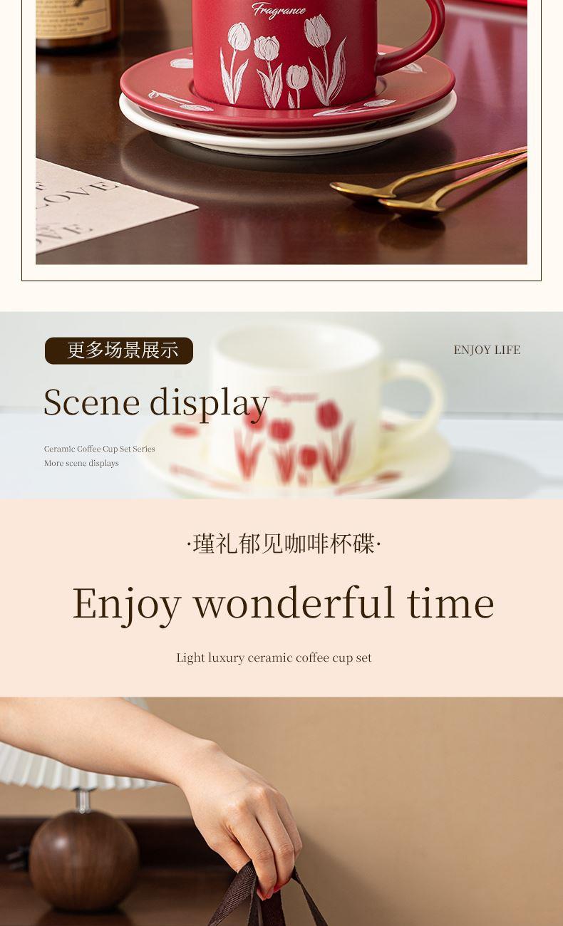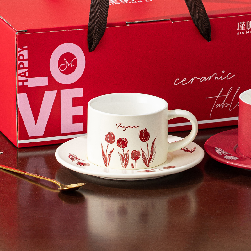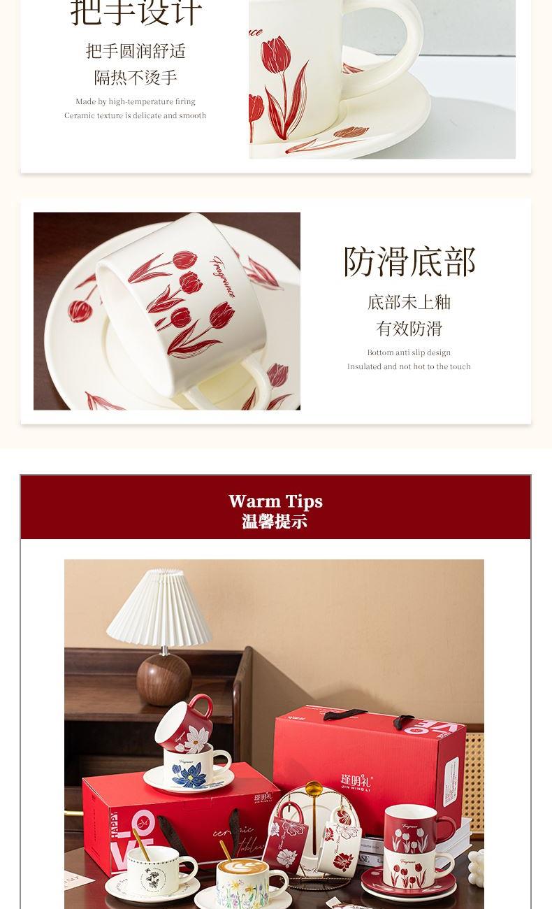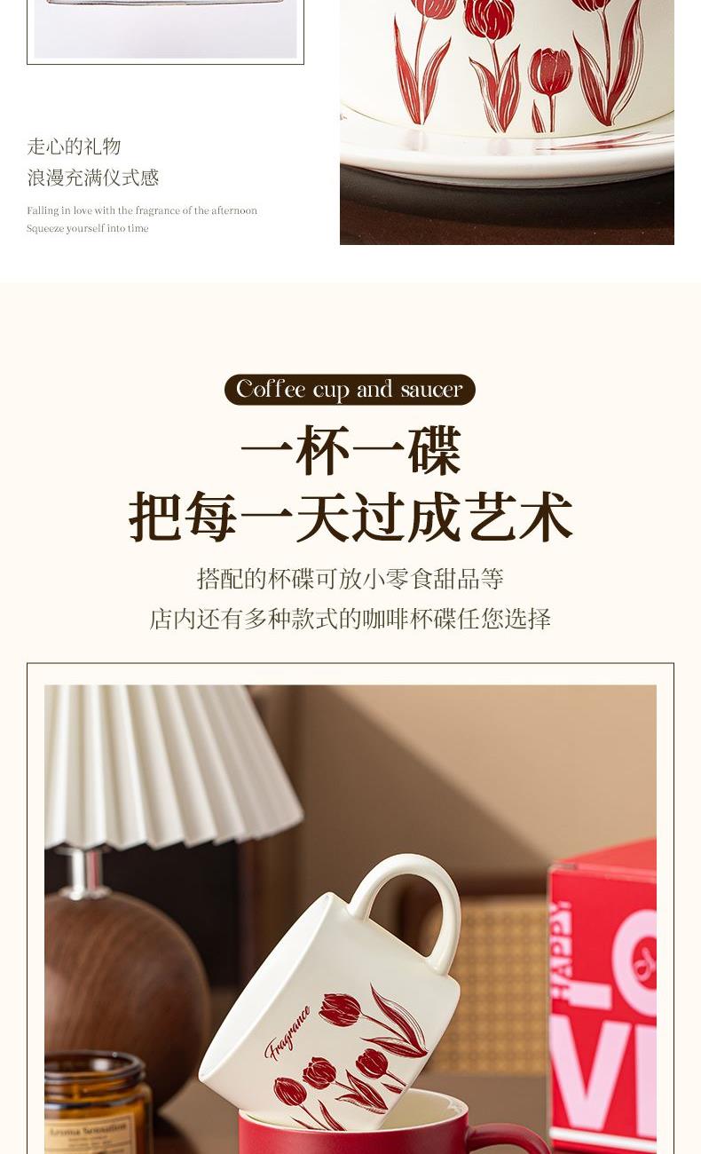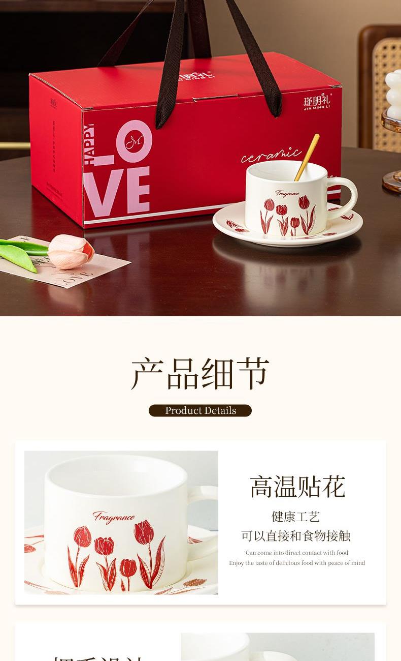 瑾礼郁见-咖啡杯碟-1杯1碟1勺 - 产品组成:整套=1杯1碟1勺+彩盒 产品材质:新骨瓷 容量:270ml 产品规格:杯=口径8.6cm,高度=6cm;碟=长度16cm, 金勺=长13cm; 彩盒尺寸:30.5*18.5*13cm 产品毛重:0.8kg 整箱毛重:17.2kg 外箱尺寸:63*39*68cm - 杯碟以郁金香为花面主题,郁金香优雅、浪漫的形象为产品注入了浓郁的艺术气息,为使用者营造出充满诗意的氛围。无论是在悠闲的午后还是忙碌的清晨,看到杯碟上绽放的郁金香,都能带来愉悦的视觉享受。让咖啡时间,沉浸在郁金香的浪漫花园中。