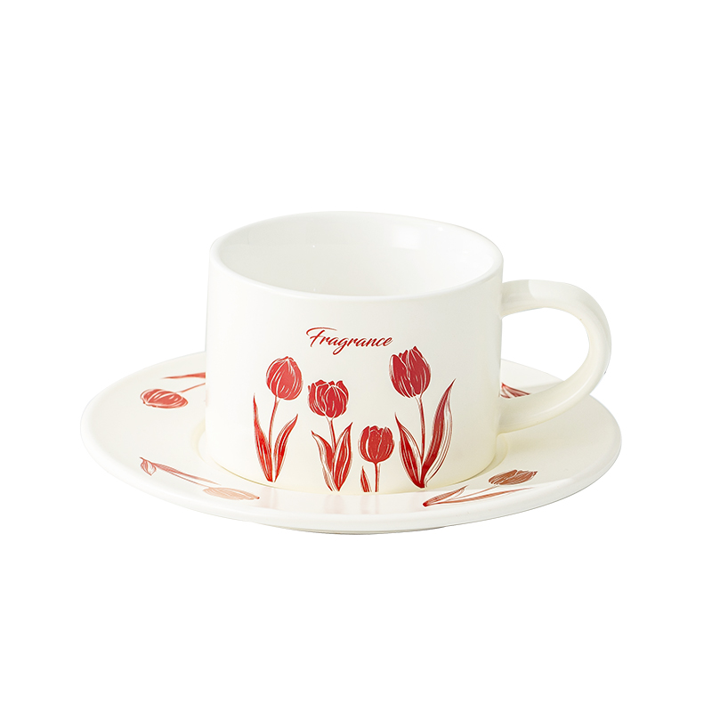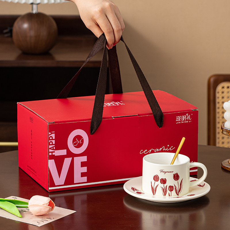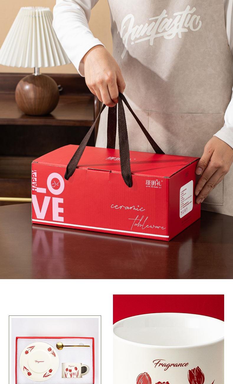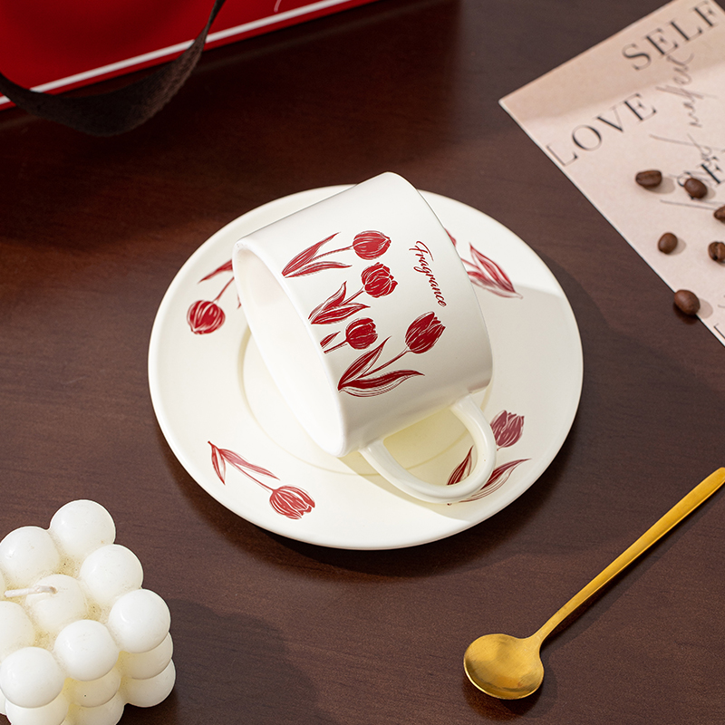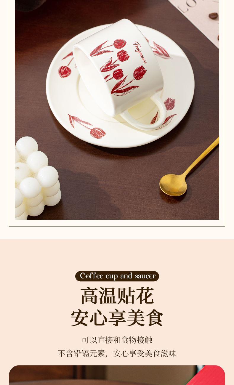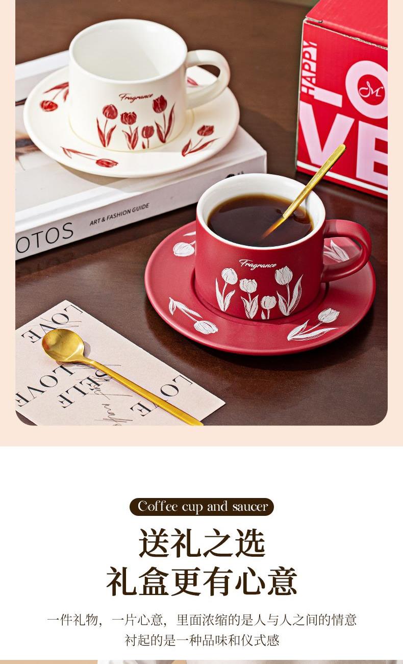 瑾礼郁见-咖啡杯碟-1杯1碟1勺 - 产品组成:整套=1杯1碟1勺+彩盒 产品材质:新骨瓷 容量:270ml 产品规格:杯=口径8.6cm,高度=6cm;碟=长度16cm, 金勺=长13cm; 彩盒尺寸:30.5*18.5*13cm 产品毛重:0.8kg 整箱毛重:17.2kg 外箱尺寸:63*39*68cm - 杯碟以郁金香为花面主题,郁金香优雅、浪漫的形象为产品注入了浓郁的艺术气息,为使用者营造出充满诗意的氛围。无论是在悠闲的午后还是忙碌的清晨,看到杯碟上绽放的郁金香,都能带来愉悦的视觉享受。让咖啡时间,沉浸在郁金香的浪漫花园中。