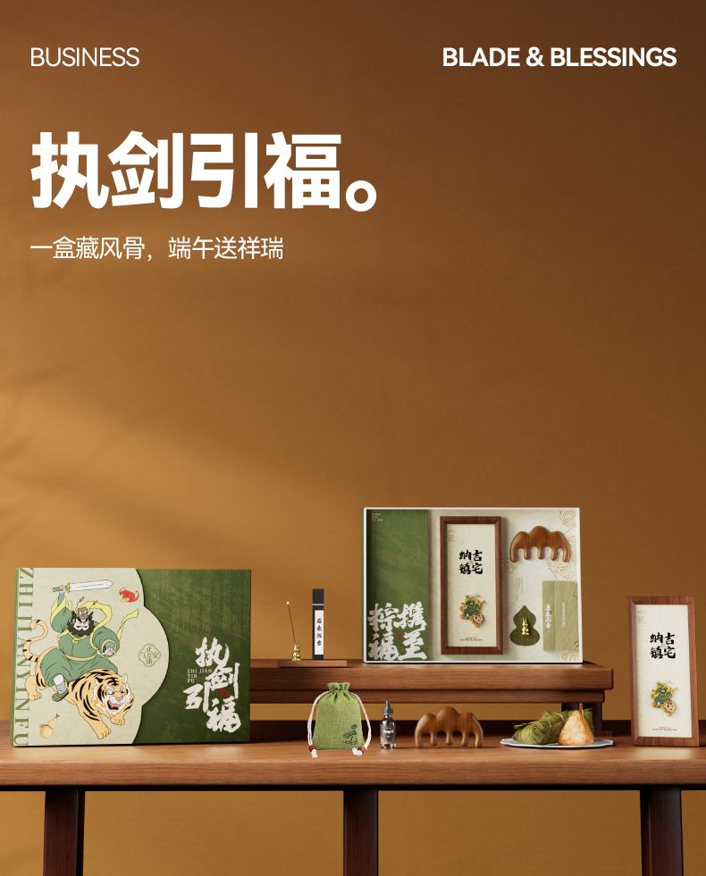 钟馗镇宅,正气凝于盒上;福牌纳吉,瑞意藏于器中 一枚咸蛋映端午之俗,一尊摆件立浩然之风 角黍寄情,糯香传意 一盒风骨,半是民俗祥瑞,半是君子气节 赠者有心,愿君岁岁端阳,安康顺遂,福运长随 内配: 配置一:礼盒&手袋x1 配置二:荃盛·粽子x4 配置三:镇宅纳吉·徽章木框摆件x1 配置四:观山·金丝檀按摩梳x1 配置五:精油x1 配置六:黄铜葫芦香插x1 配置七:马来沉香x1配置八:贺卡x1