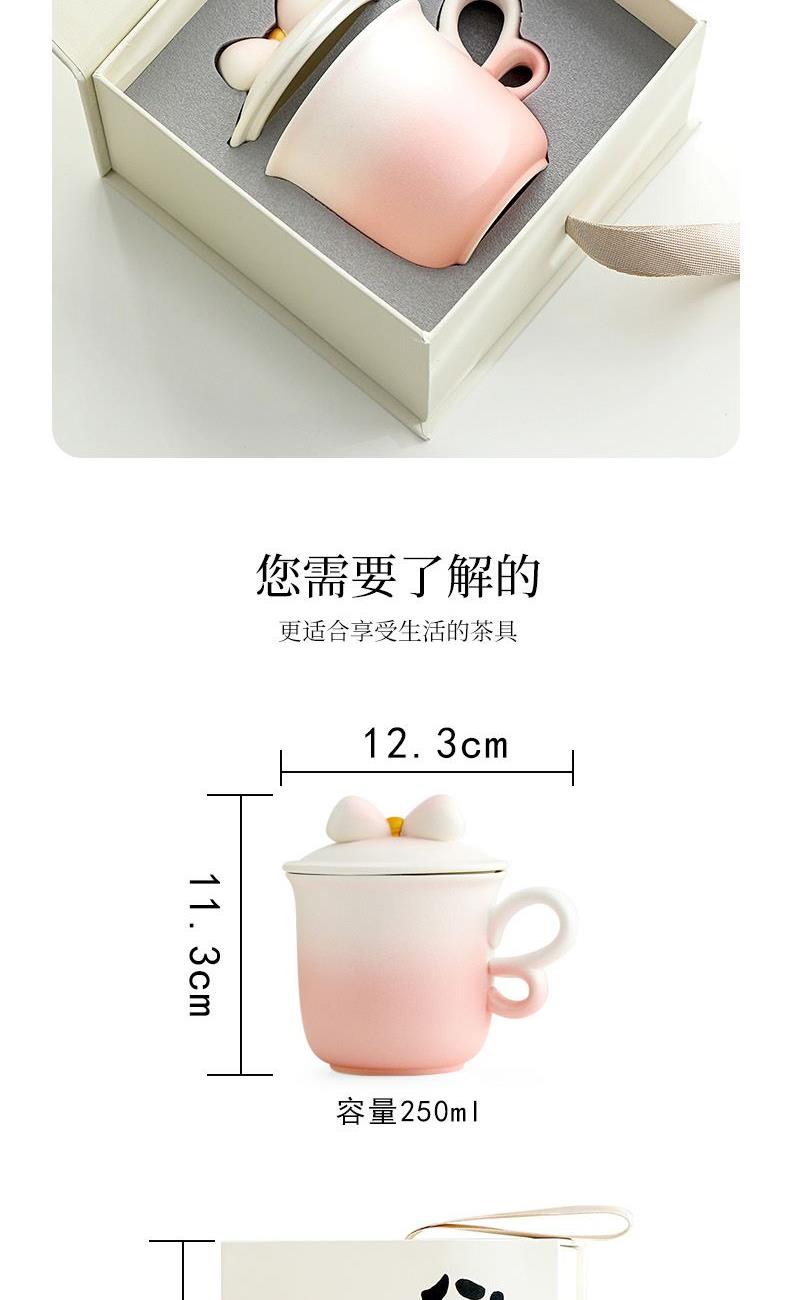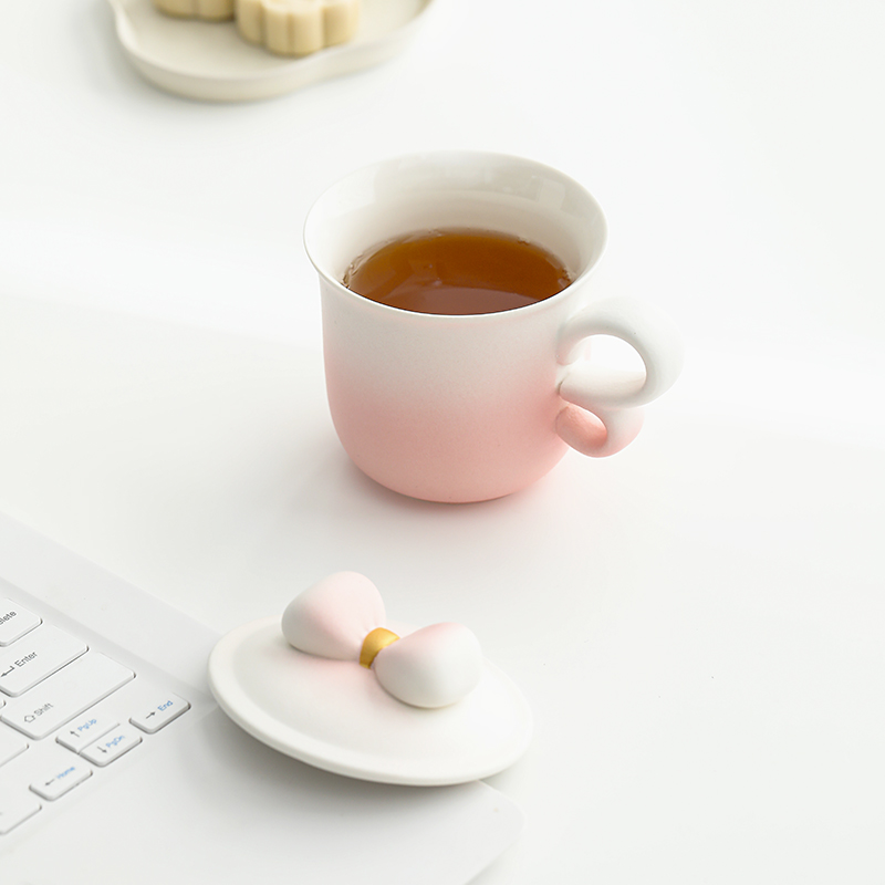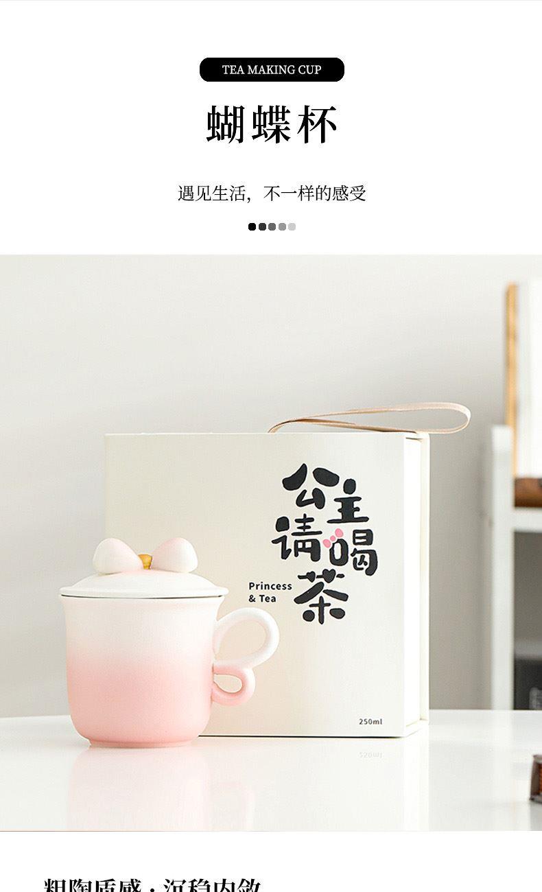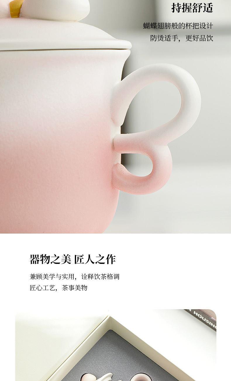 融合渐变色彩、蝴蝶把手(3/8艺术字)、蝴蝶结盖粒及粗陶材质,新颖时尚与东方古典美学结合,带来愉悦的喝茶体验。 材 质:原矿陶 容 量:茶杯250ml 配 置:两件式杯一套,含提手礼盒包装。