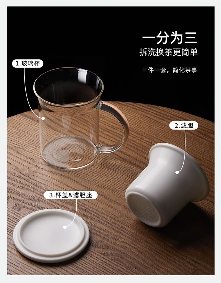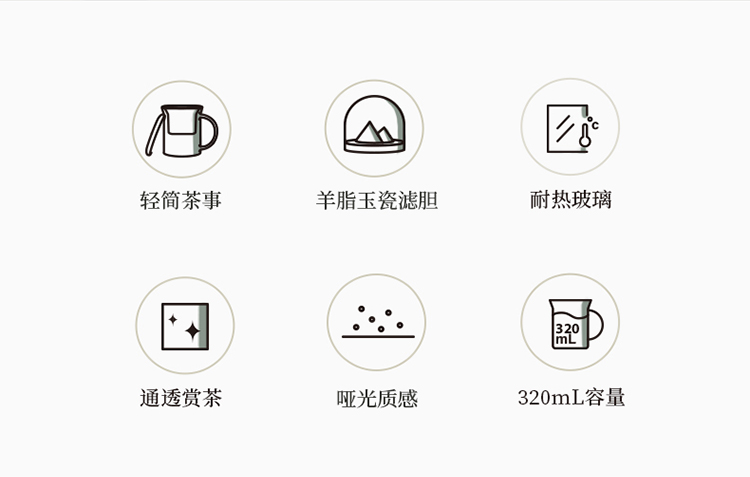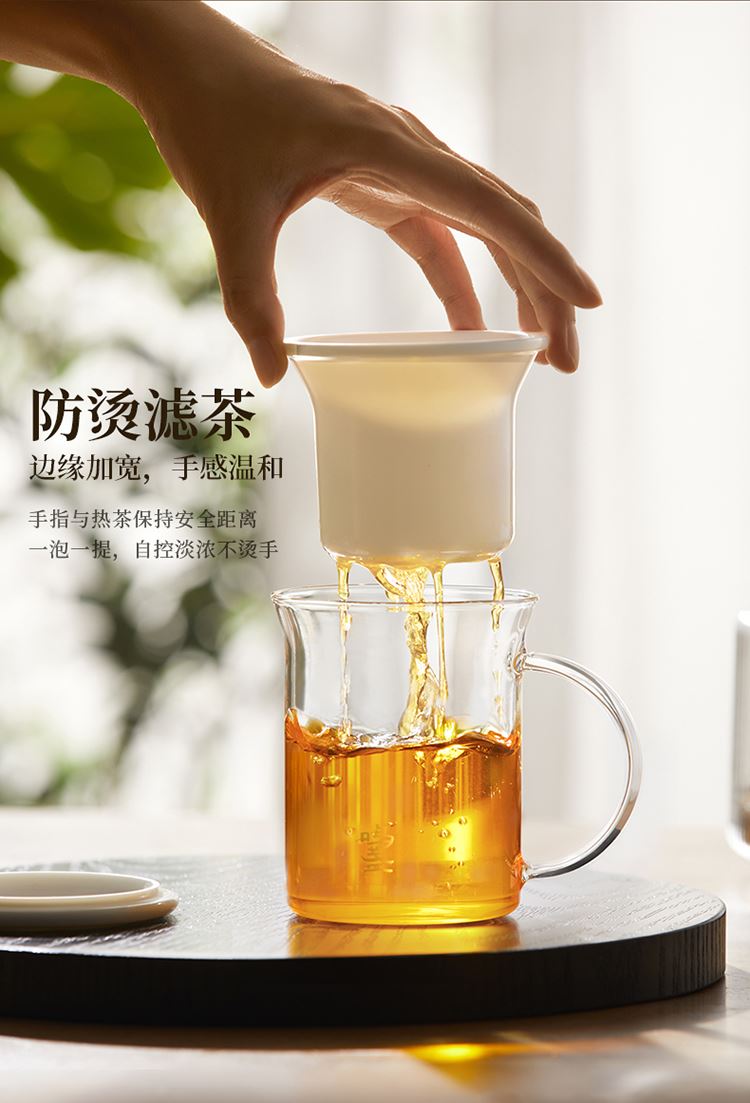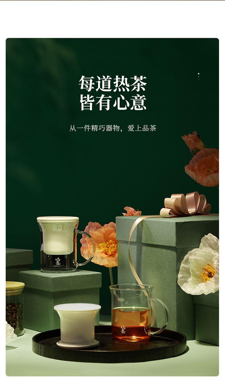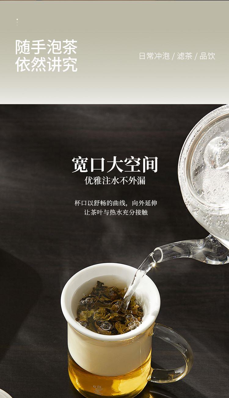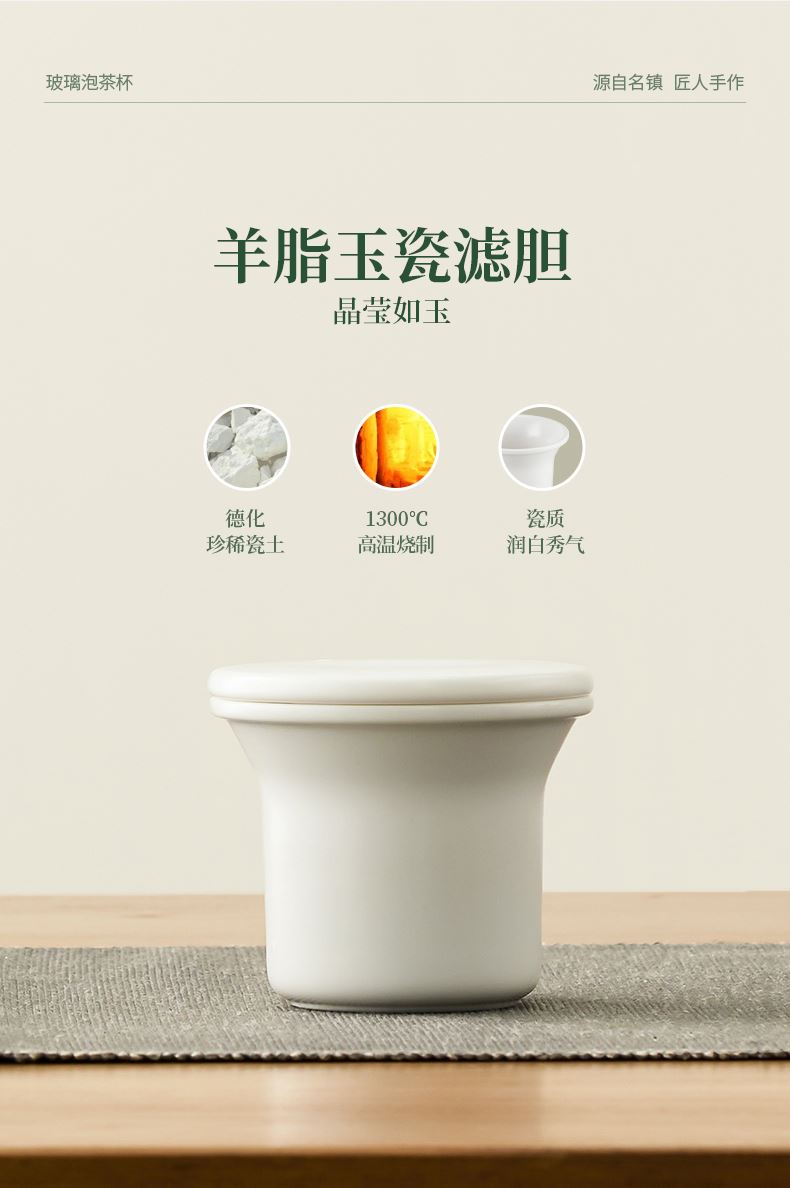 产品容量:320mL 产品尺寸:123Lx80Wx122Hmm 彩盒265L*145W*140H mm / 邮购盒278L*158W*155Hmm 产品重量:产品净重0.42 Kg / 邮盒毛重0.65 Kg 材质:高硼硅玻璃、羊脂玉瓷白标准配件:壶身、壶盖、内胆 带羊脂玉瓷内胆的玻璃泡茶杯,将瓷器与玻璃相结合,采用可拆式结构。放下内胆方便泡茶茶水分离,取出内胆便是桌面随手杯。瓷质的内胆边缘经过加宽往外延伸,滤茶的时候提起内胆不容易烫手,提升控制淡浓的体验感。