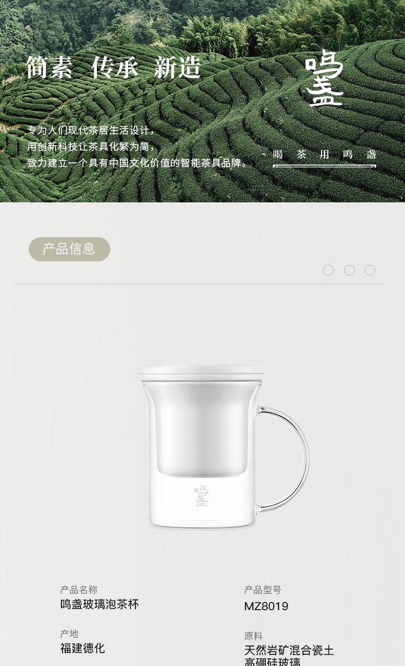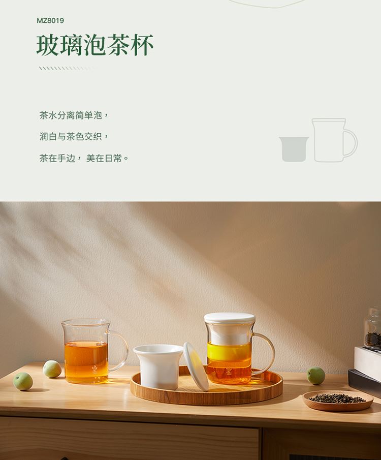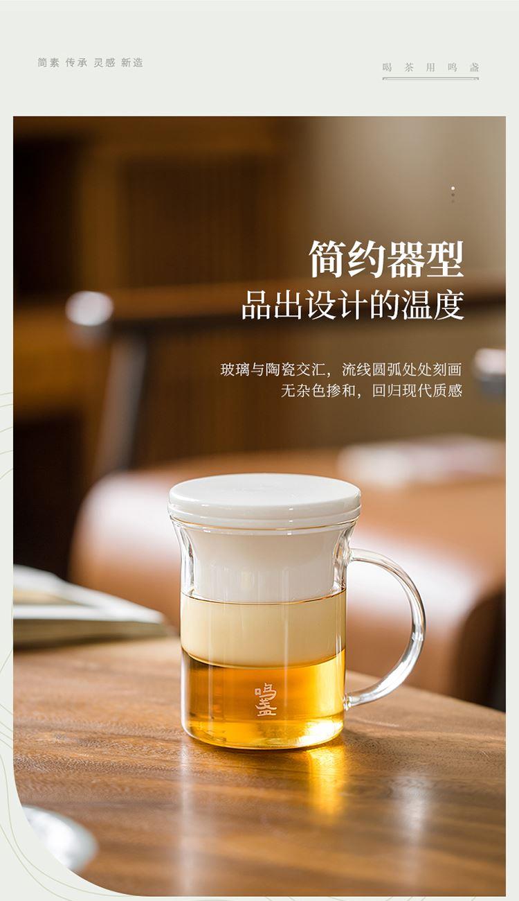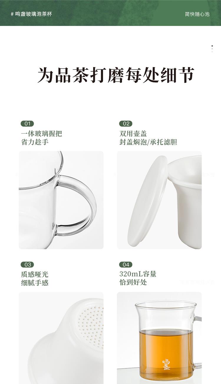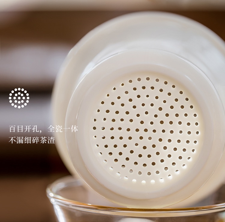 产品容量:320mL 产品尺寸:123Lx80Wx122Hmm 彩盒265L*145W*140H mm / 邮购盒278L*158W*155Hmm 产品重量:产品净重0.42 Kg / 邮盒毛重0.65 Kg 材质:高硼硅玻璃、羊脂玉瓷白标准配件:壶身、壶盖、内胆 带羊脂玉瓷内胆的玻璃泡茶杯,将瓷器与玻璃相结合,采用可拆式结构。放下内胆方便泡茶茶水分离,取出内胆便是桌面随手杯。瓷质的内胆边缘经过加宽往外延伸,滤茶的时候提起内胆不容易烫手,提升控制淡浓的体验感。