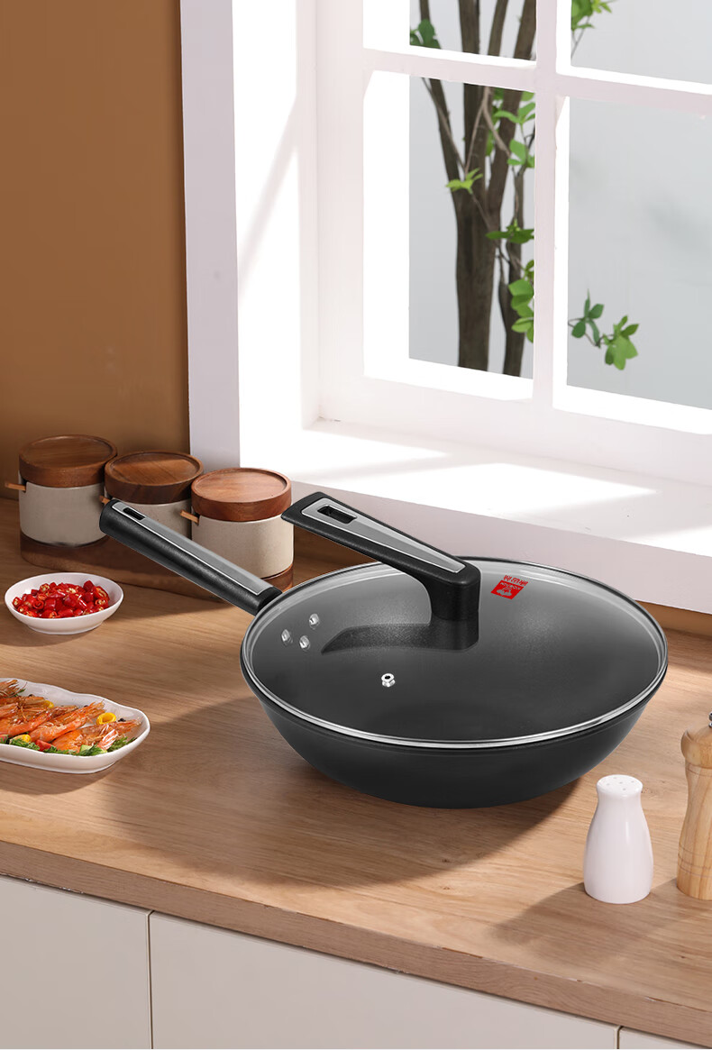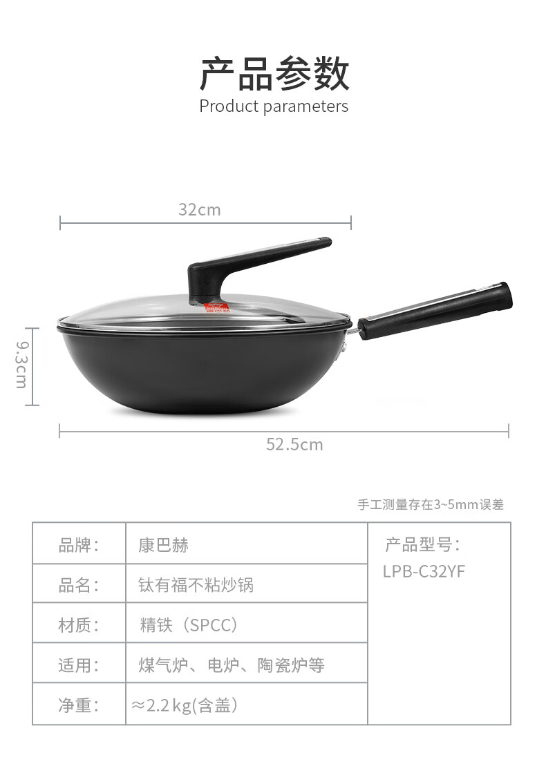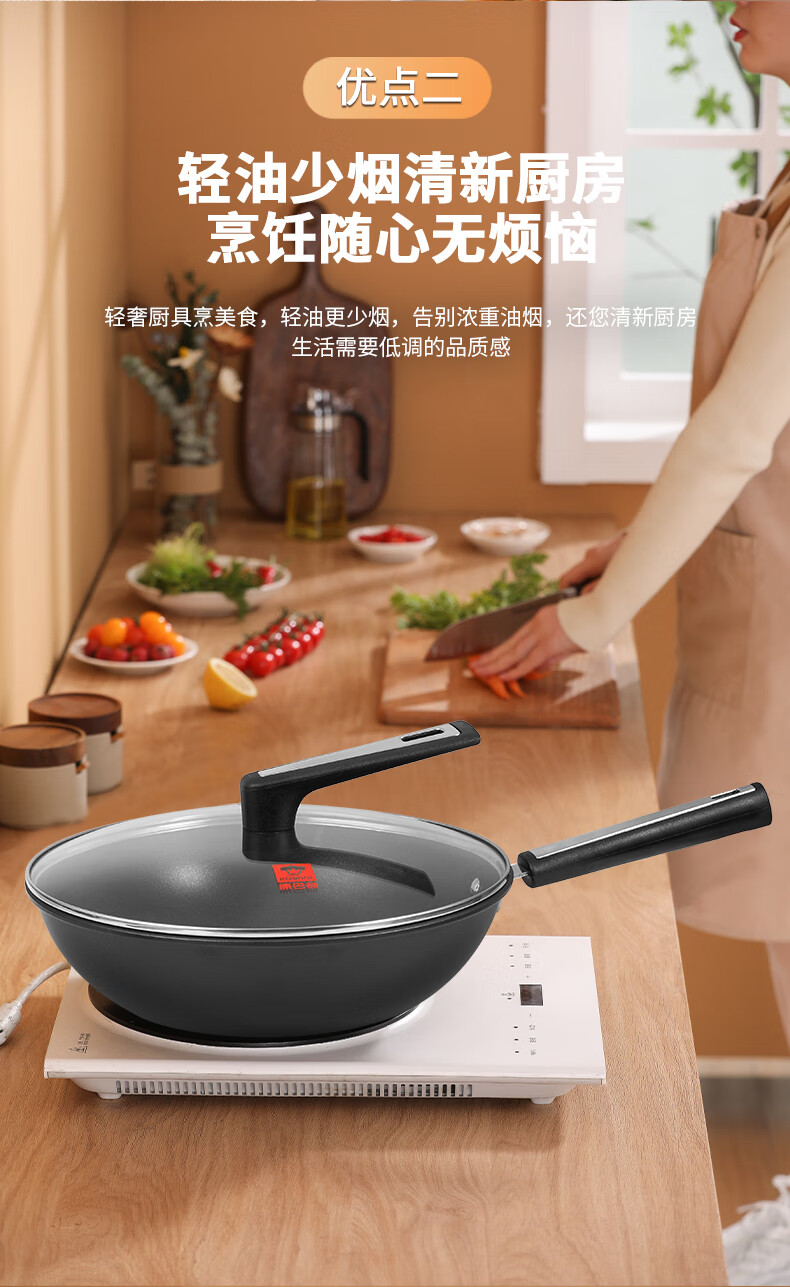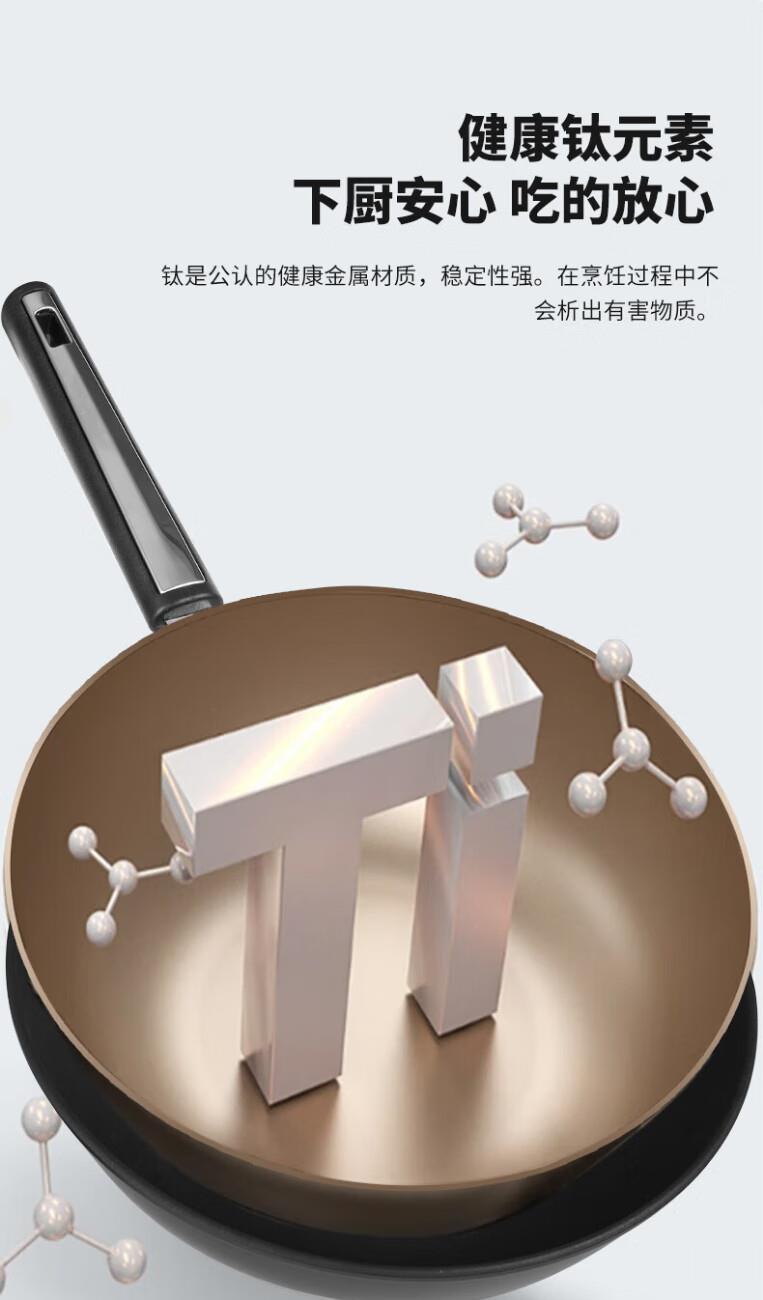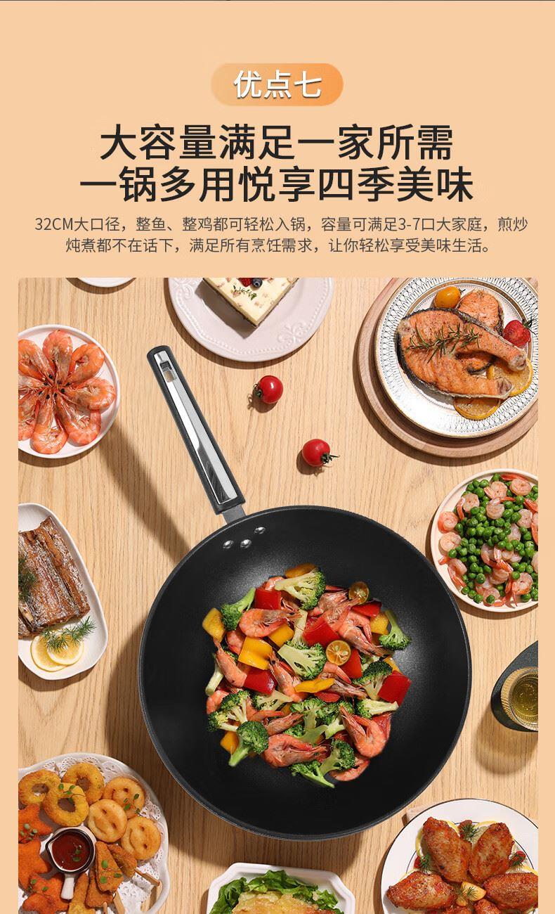 规格:32cm 净重:2.2kg 包装尺寸:51*40*79.8cm ◎健康钛元素下厨安心吃的放心:钛是公认的健康金属材质,稳定性强。在烹饪过程中不会析出有害物质。 ◎翻炒实力不粘告别粘锅烦恼:采用优质涂层,不粘效果好,持久耐用,少油炒菜不易粘,下厨炒菜更轻松,烹饪后钢壁不留残渣。 ◎轻油少烟清新厨房烹饪随心无烦恼:轻奢厨具烹美食,轻油更少烟,告别浓重油烟,还您清新厨房生活需要低调的品质感 ◎底厚壁薄导热迅速:锅体采用厚底薄壁式,锅底加厚,做菜不易糊底,锅壁薄,传热迅速导热均匀,恰到好处掌握火候,大火爆炒的菜更加入味 ◎轻量锅身设计,单手可颠:轻量化锅胚设计,轻质易颠锅,重量低于传统铸铁锅,女生也能轻松使用,方便易掌握,给您体验厨房里的“轻”时光。 ◎底部螺旋纹设计,不挑炉灶:锅底螺旋纹设计,可防止锅底凹凸不平,精铁材质不挑灶,不挑铲好锅不受限,上手即用,是厨房里的的好搭档。