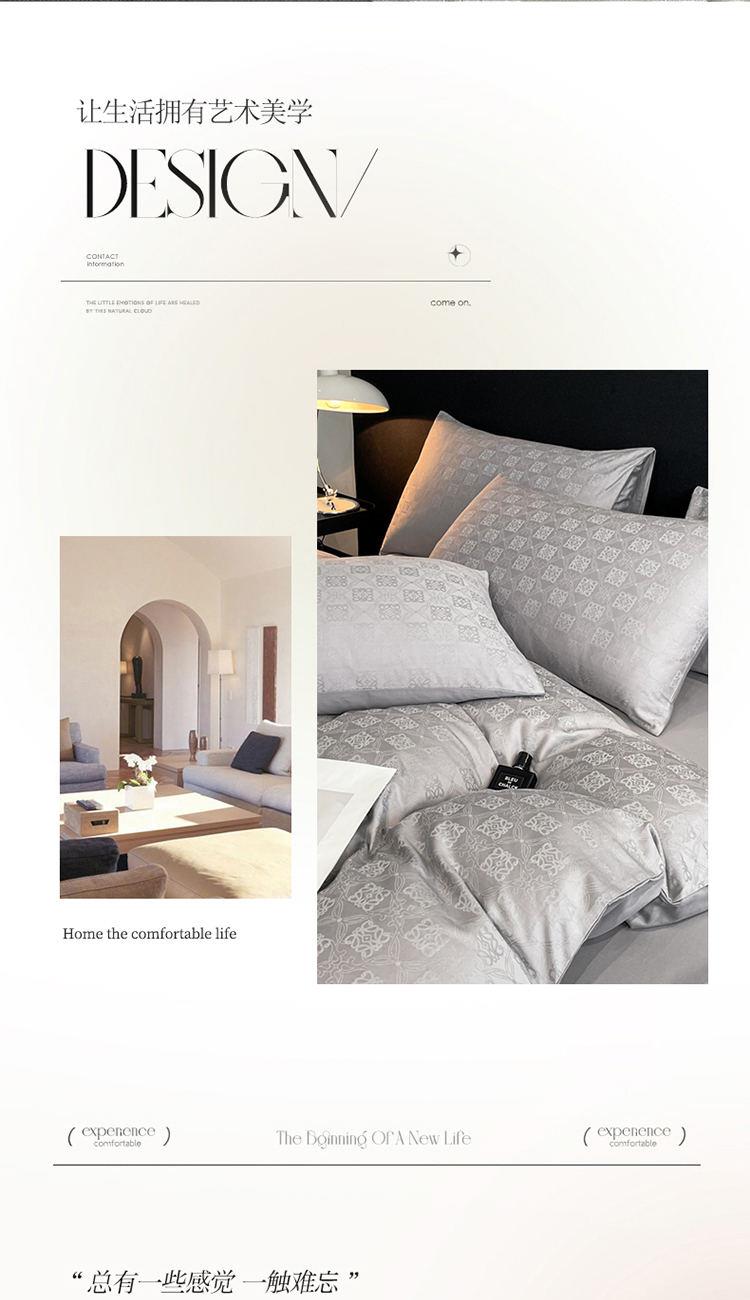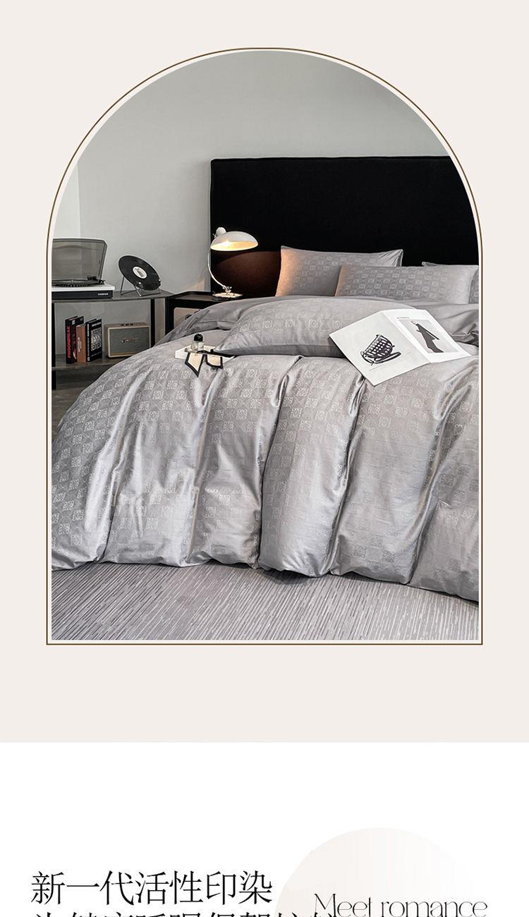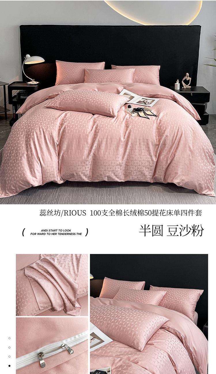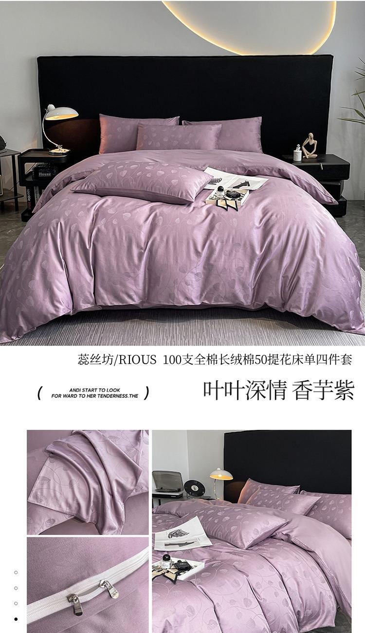 规格:被套200*230cm 床单245*245cm 枕套48*74cm 面料:全棉长绒棉 花色:半圆-豆沙粉/绅士灰/香咖/芬妮香芋紫/叶叶深情-豆沙粉/叶叶深情-香芋紫 低调轻奢的格调,倾向于高雅调性的色彩,面料提花纹、时尚简约,简单舒适的纯正风范。