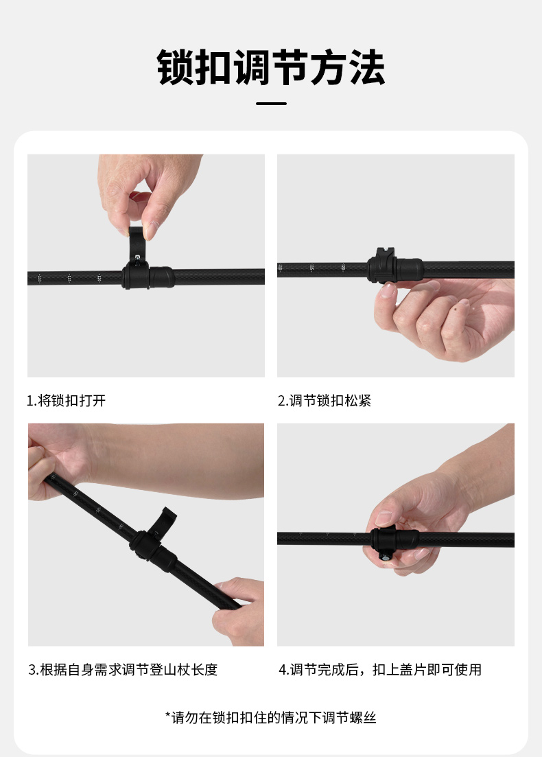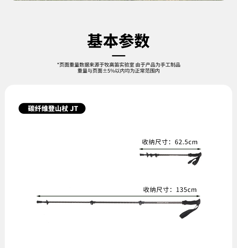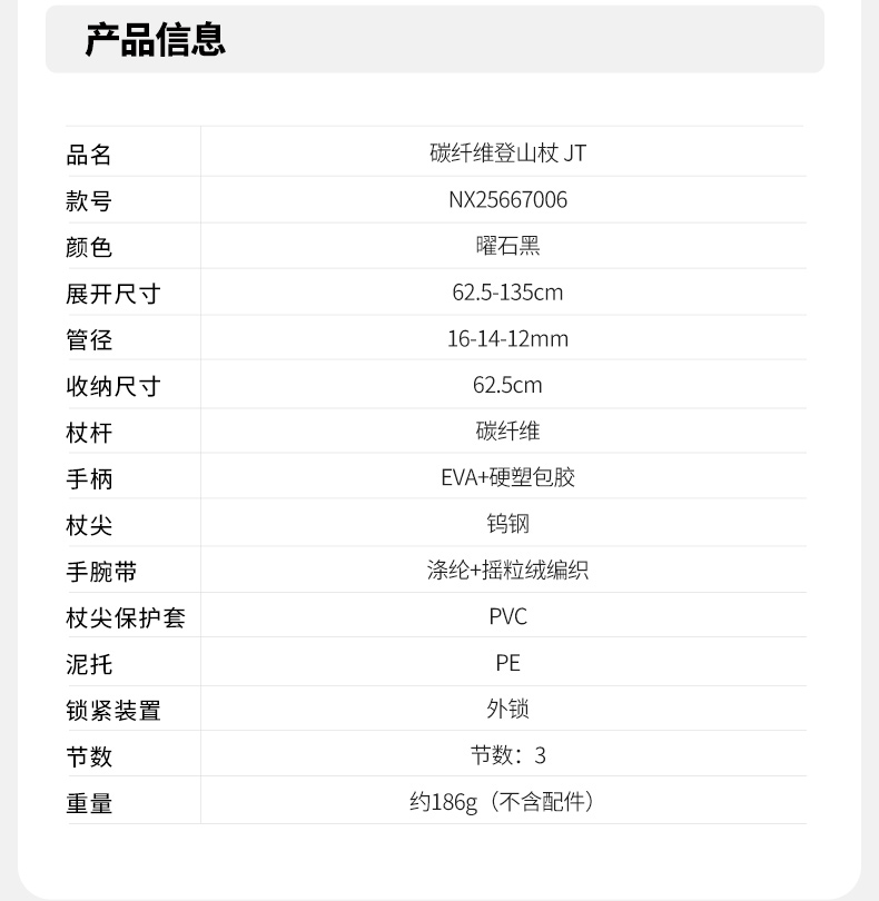 产品分类:登山杖类 颜色:曜石黑 单箱体积(m³):0.05148 尺寸(CM):66*30*26 产品参数:杖身 材质:碳纤维 产品尺寸:65-135CM 管径:16/14/12 手柄:EVA 锁扣:塑料外锁 杖尖:钨钢尖