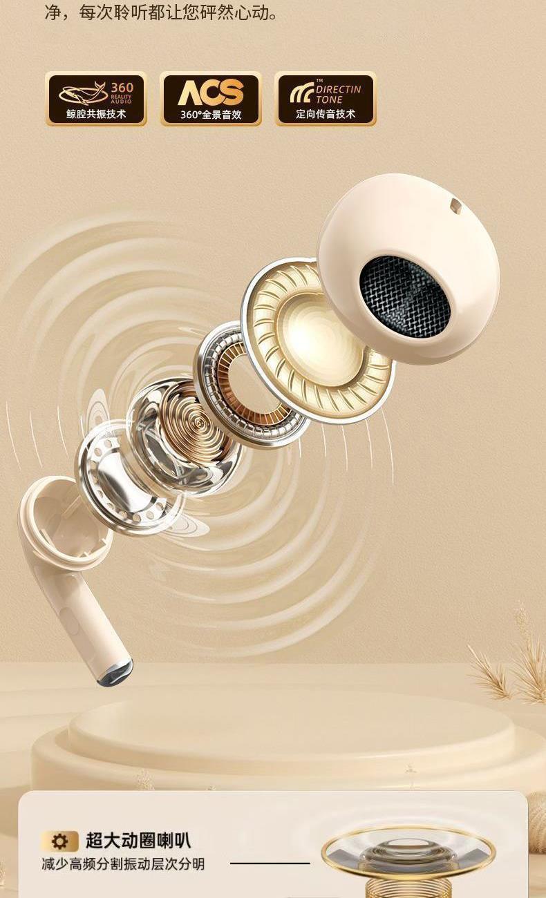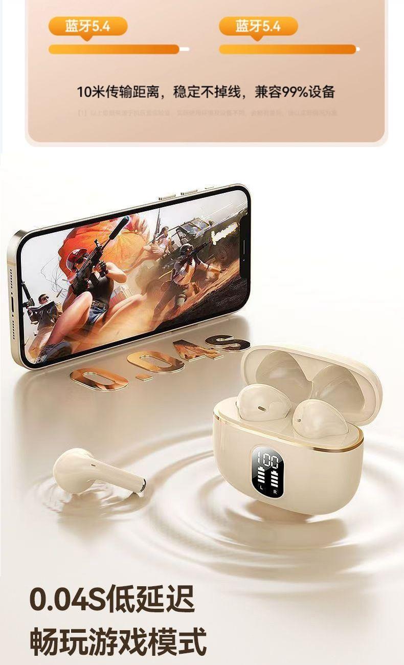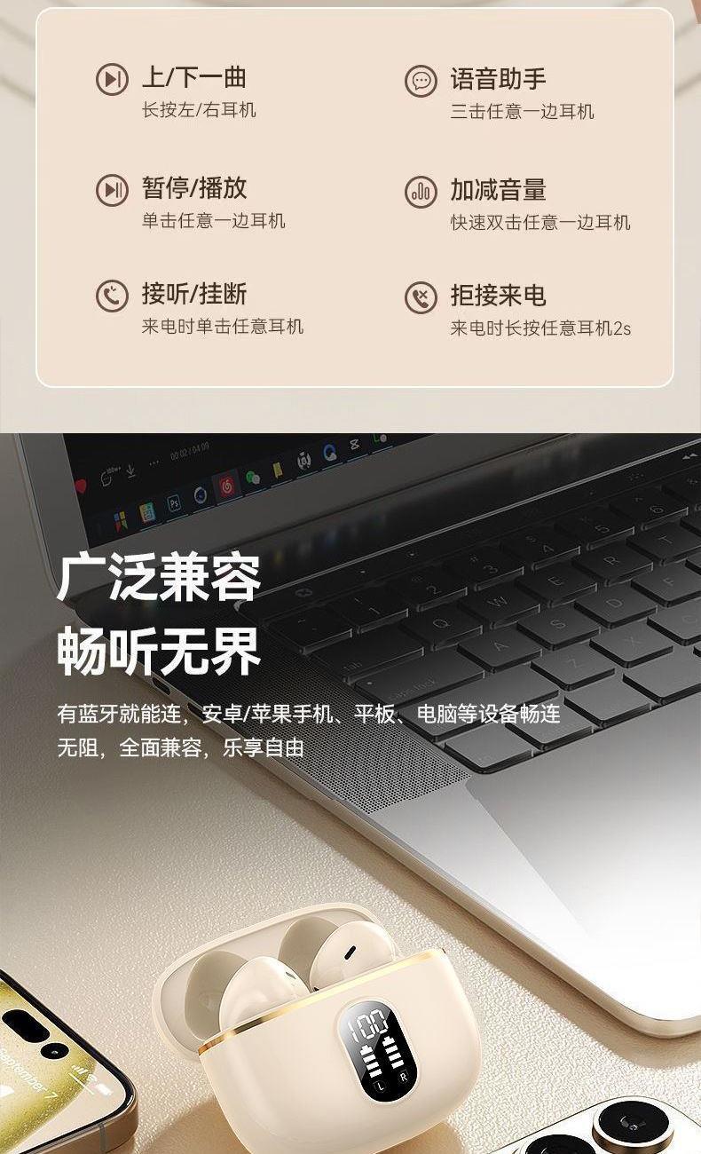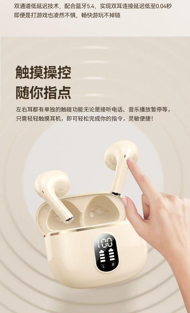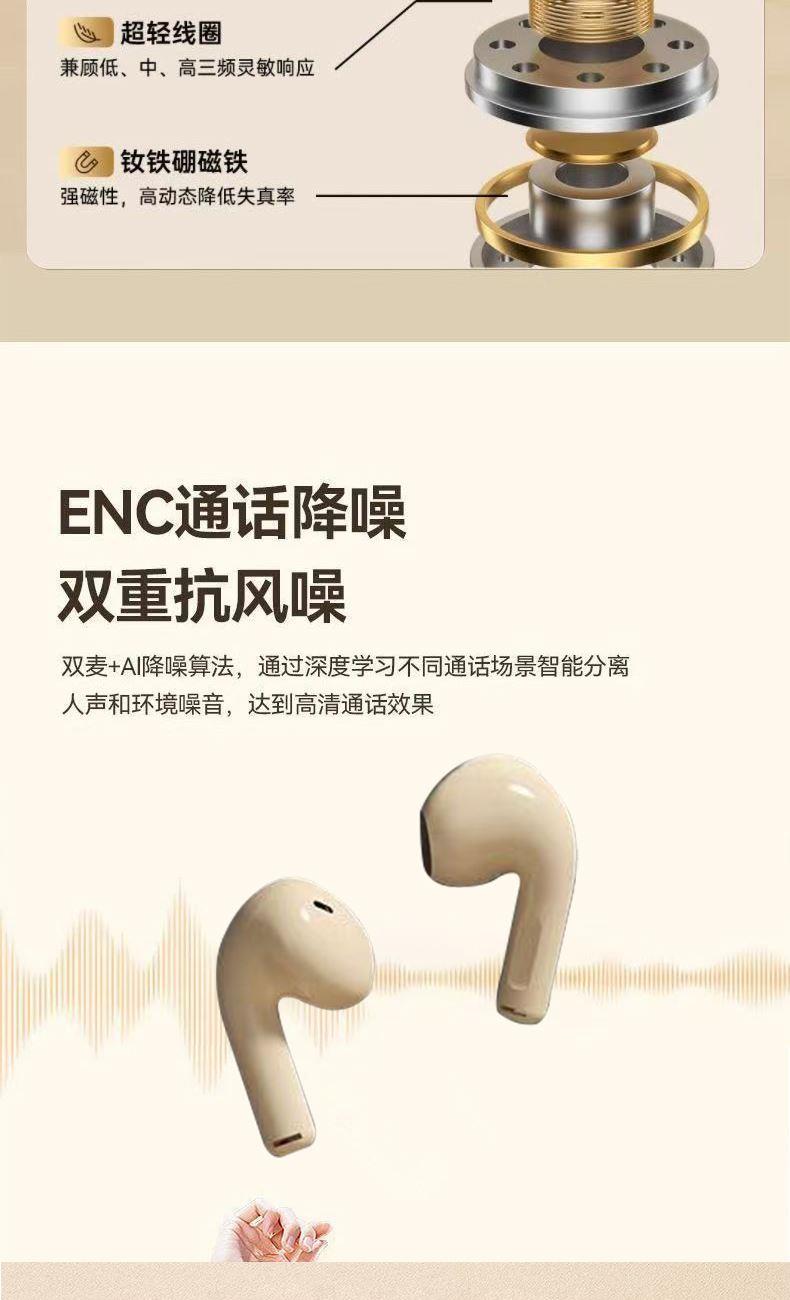 产品特点:1、精致小巧、佩戴舒适、携带方便;2、德国专业调音团队,无限调试,适合每一双挑剔的耳朵;3、数显电量,一目了然,掌控电量,畅享无忧;4、低功耗DSP抗干扰Bluetooth5.4芯片,连接顺畅不卡顿;5、ACC+SBC音频解码,无感延迟,音画同步;6、封闭式腔体设计,减少失真,超大双动圈发声,无损音质,畅享重低音HIFI音效;7、ENC通话降噪,双重抗风噪,实现高清通话;8、安全高标准锂电池,续航更持久;9、生活防水,防水防汗,无惧风雨;10、礼盒包装,支持定制。