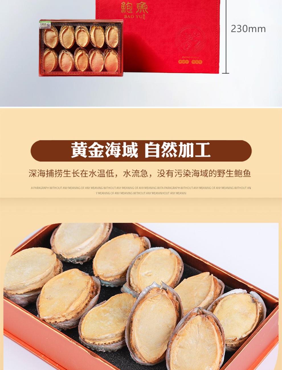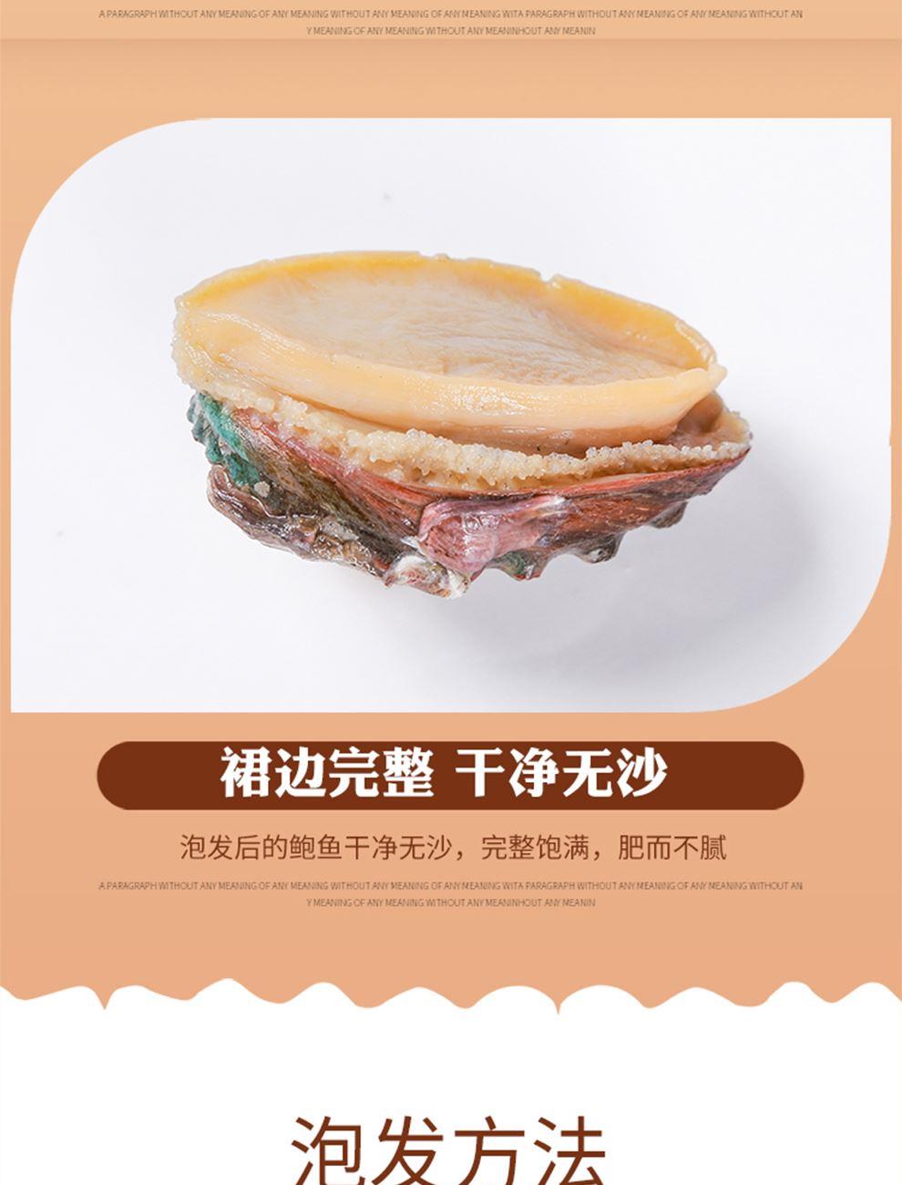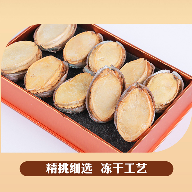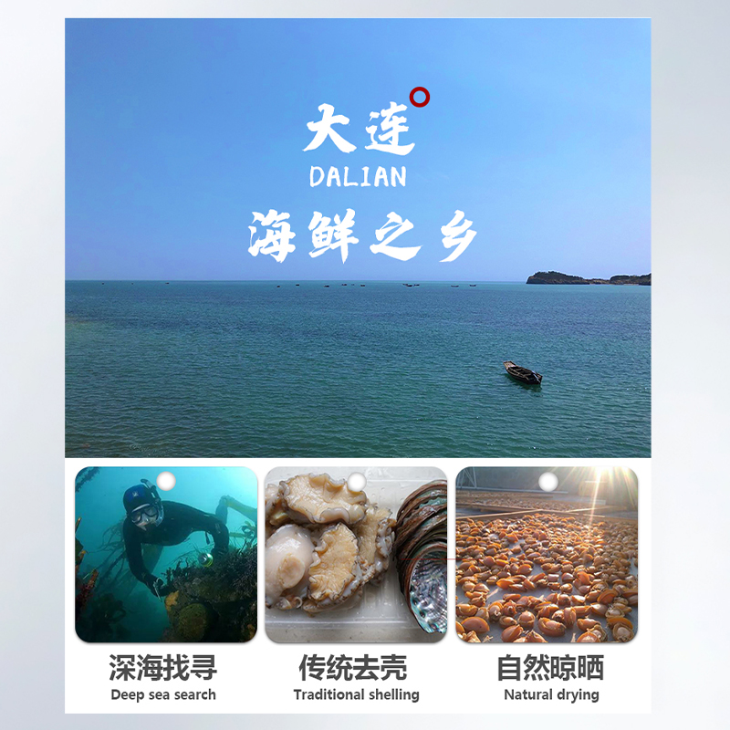 规格:100克 卖点: 1、优质海域环境,大连海域水质优良,水温适宜,为鲍鱼生长提供了良好的自然条件。在这样的环境下生长的鲍鱼,品质上乘,肉质鲜美。 2、营养价值高,鲍鱼富含优质蛋白质、多种维生素和矿物质,这些营养成分对人体健康非常有益,可以促进生长发育。 3、口感鲜美有嚼劲。大连干鲍经过干制后,肉质紧实。烹饪后口感弹牙,味道浓郁鲜美。 4、易于保存,烹饪便利。