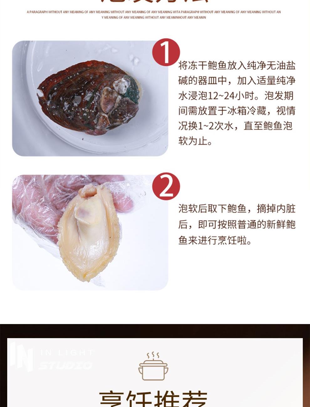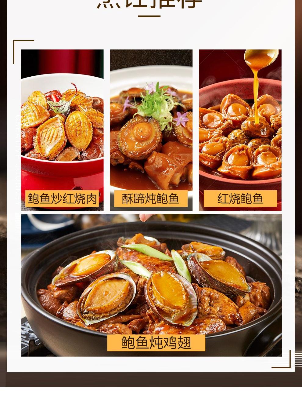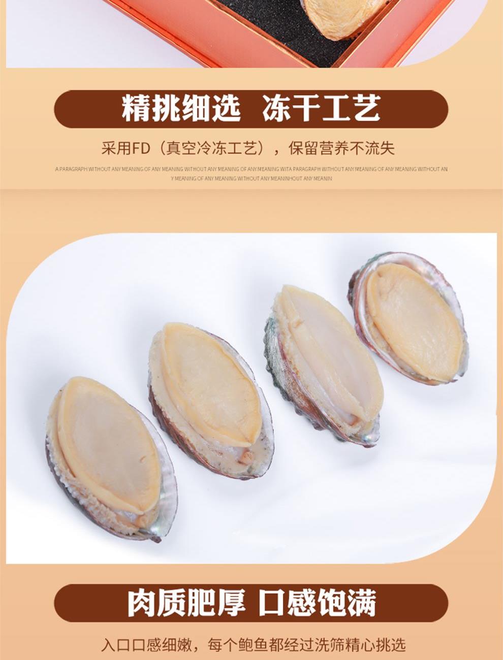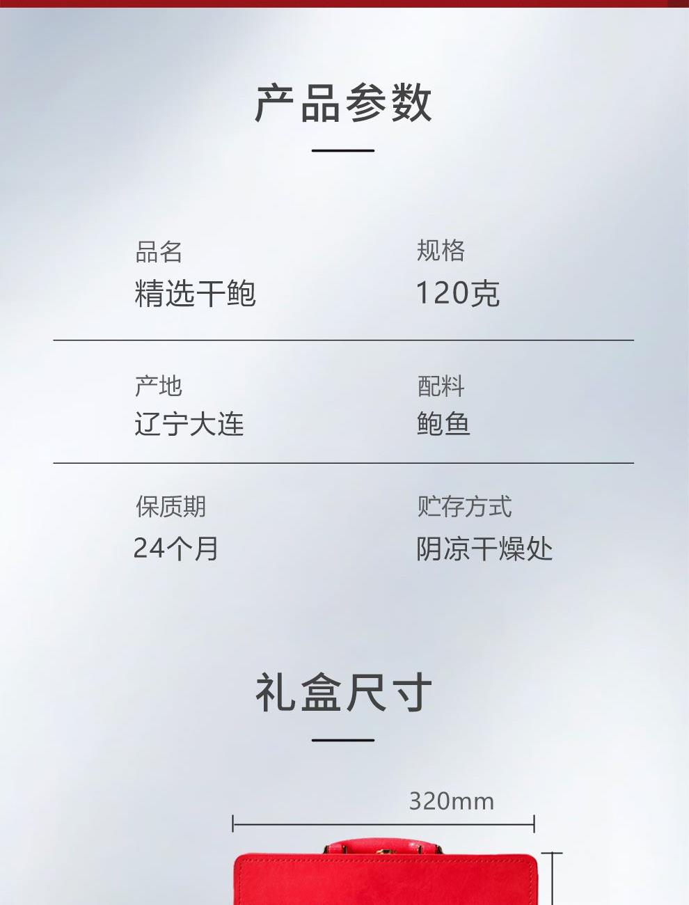 规格:100克 卖点: 1、优质海域环境,大连海域水质优良,水温适宜,为鲍鱼生长提供了良好的自然条件。在这样的环境下生长的鲍鱼,品质上乘,肉质鲜美。 2、营养价值高,鲍鱼富含优质蛋白质、多种维生素和矿物质,这些营养成分对人体健康非常有益,可以促进生长发育。 3、口感鲜美有嚼劲。大连干鲍经过干制后,肉质紧实。烹饪后口感弹牙,味道浓郁鲜美。 4、易于保存,烹饪便利。