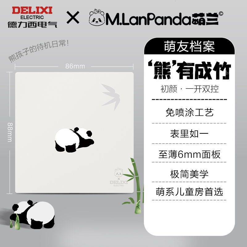 产品型号:HUP86K2 MLA(汉玉白) 产品描述: 1、1.2mm安装钢架; 2、16A高负载开关; 3、2度小摆角; 4、850度高温阻燃。 产品卖点: 1、国宝熊猫IP,重视文化符号象征; 2、IP联名提升产品附加值; 3、采用萌兰熊猫的卡通形象,为家居增添活泼氛围,满足年轻用户对个性化装饰的需求。