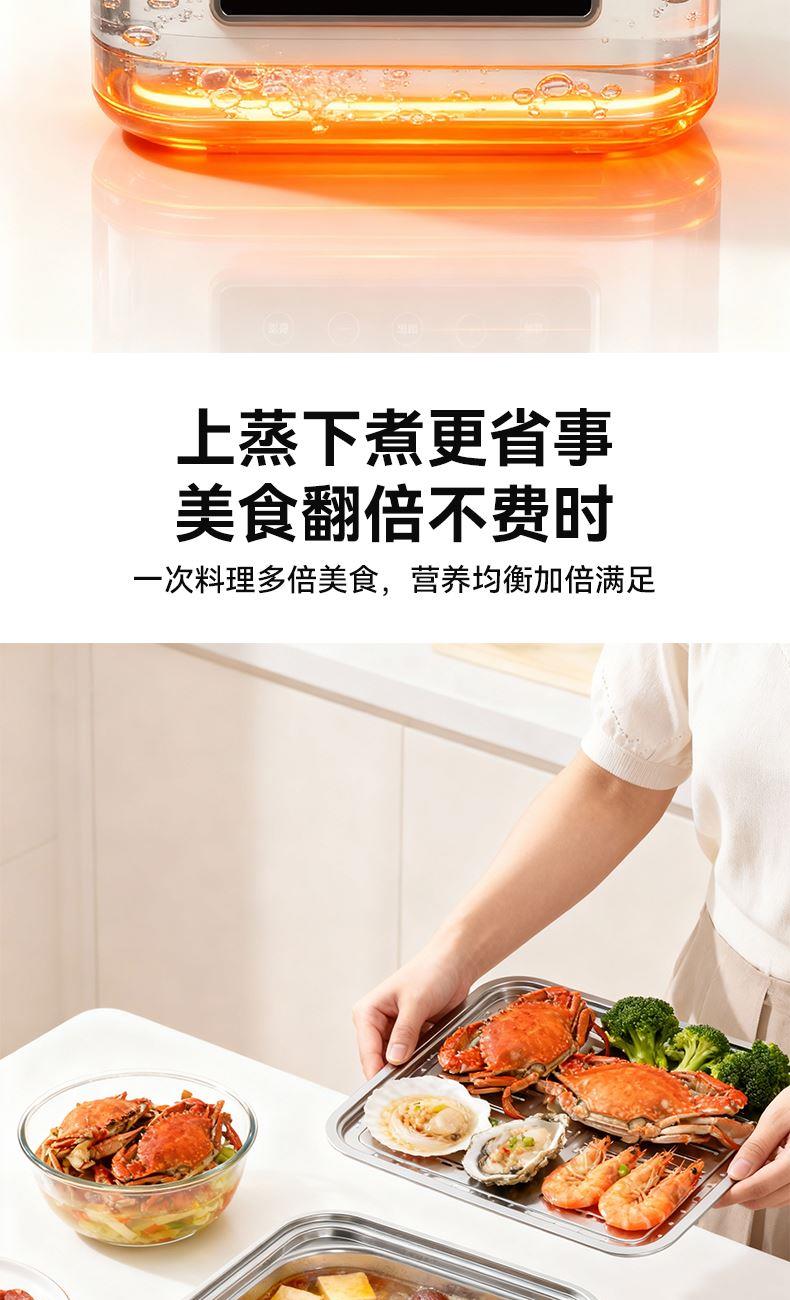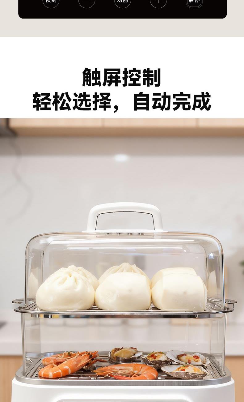 额定电压:220V~ 额定频率:50Hz 额定功率:1500W 容 量:11.5L 控制方式:触控式微电脑程序控制 主要材质:304不锈钢+PP+PC 产品净重:1.8kg 产品尺寸:278*280*300mm 彩盒尺寸:332*305*343mm 1、可视化PC蒸格配合304不锈钢锅胆,蒸煮两用; 2、双层4L+4L蒸格随心搭配,满足多人使用; 3、火锅容量3.5L,1500W大功率加热,快速沸腾; 4、配置24小时预约功能,设定时间,无需看管; 5、内置安全保护装置,干烧超温自动断电。