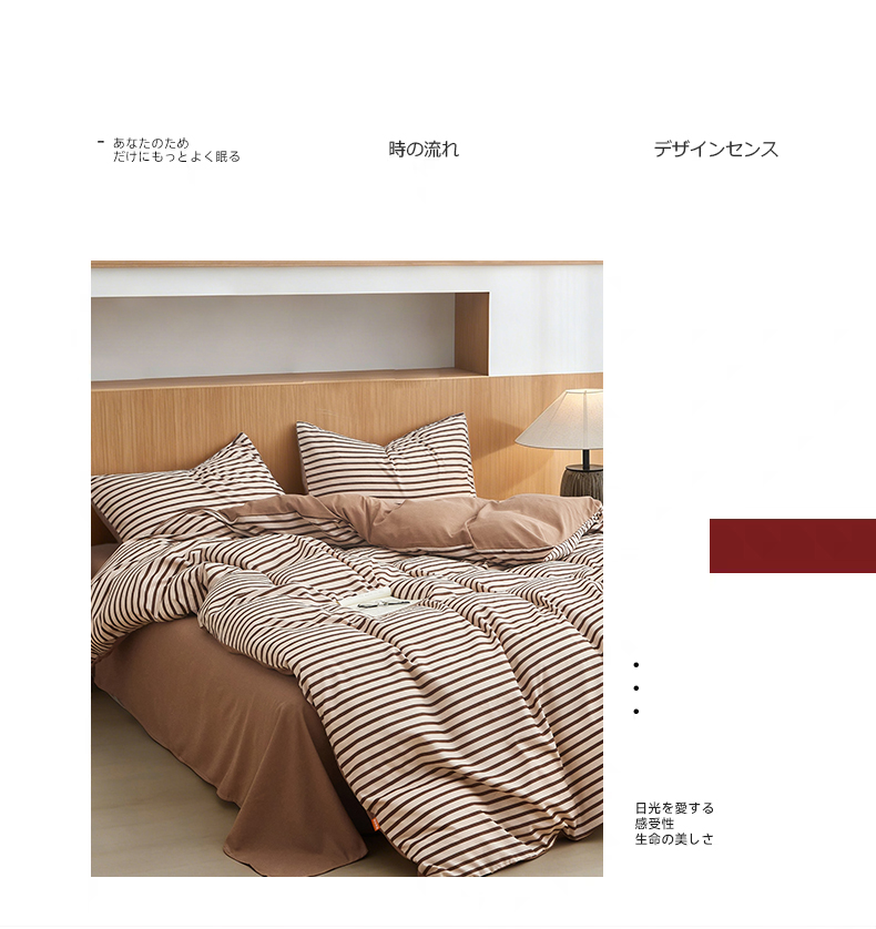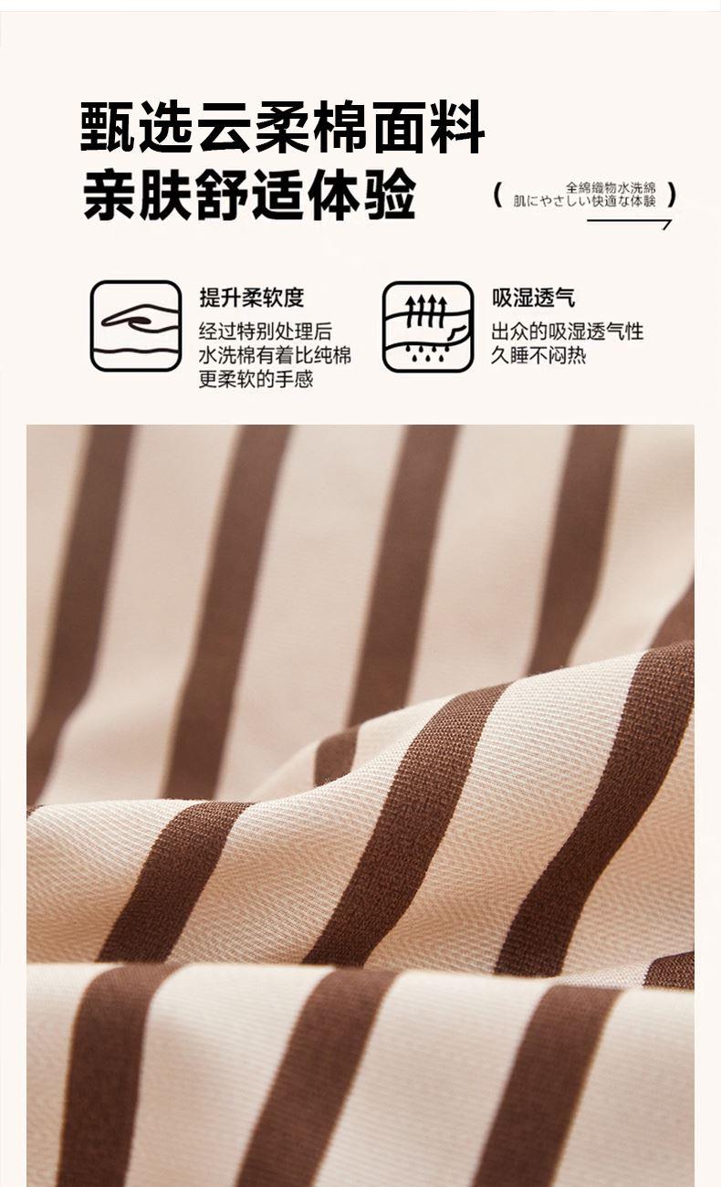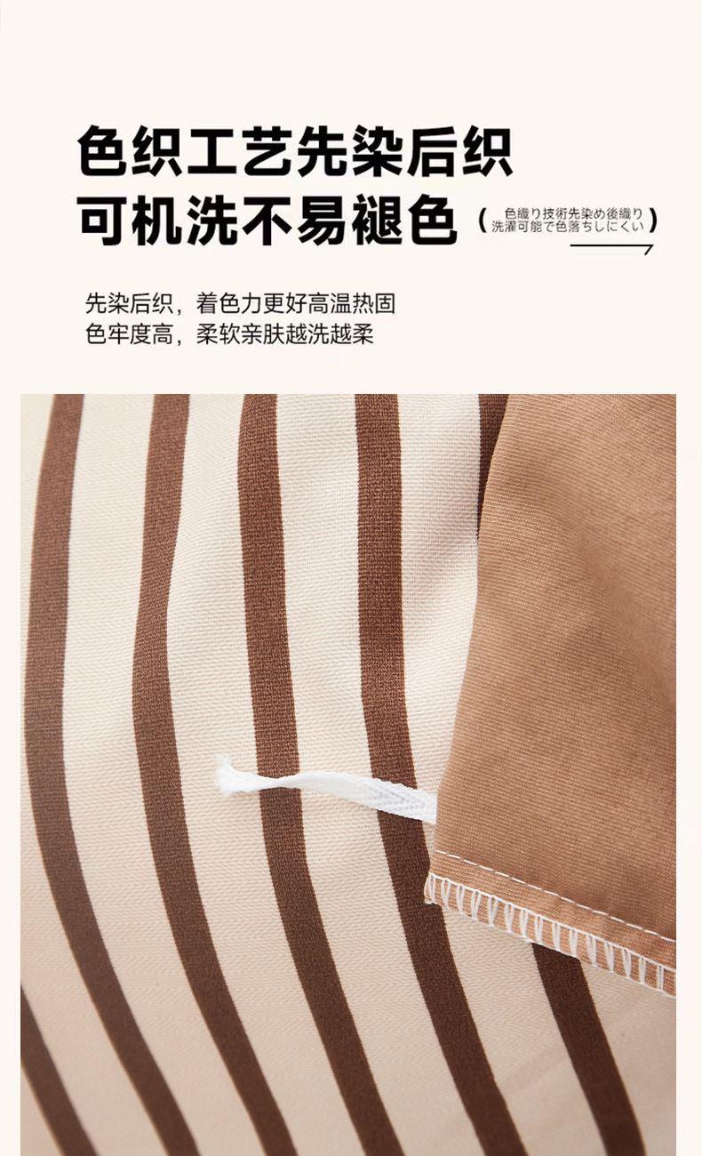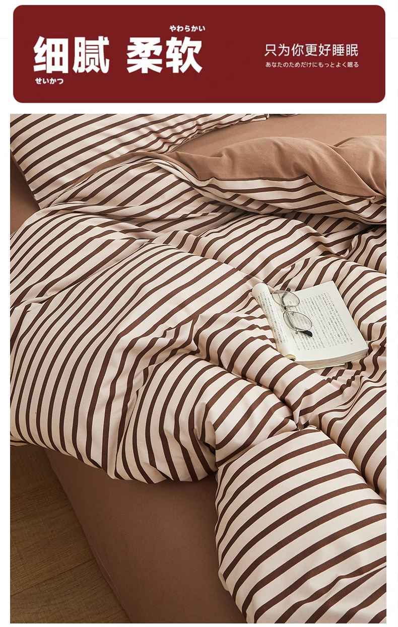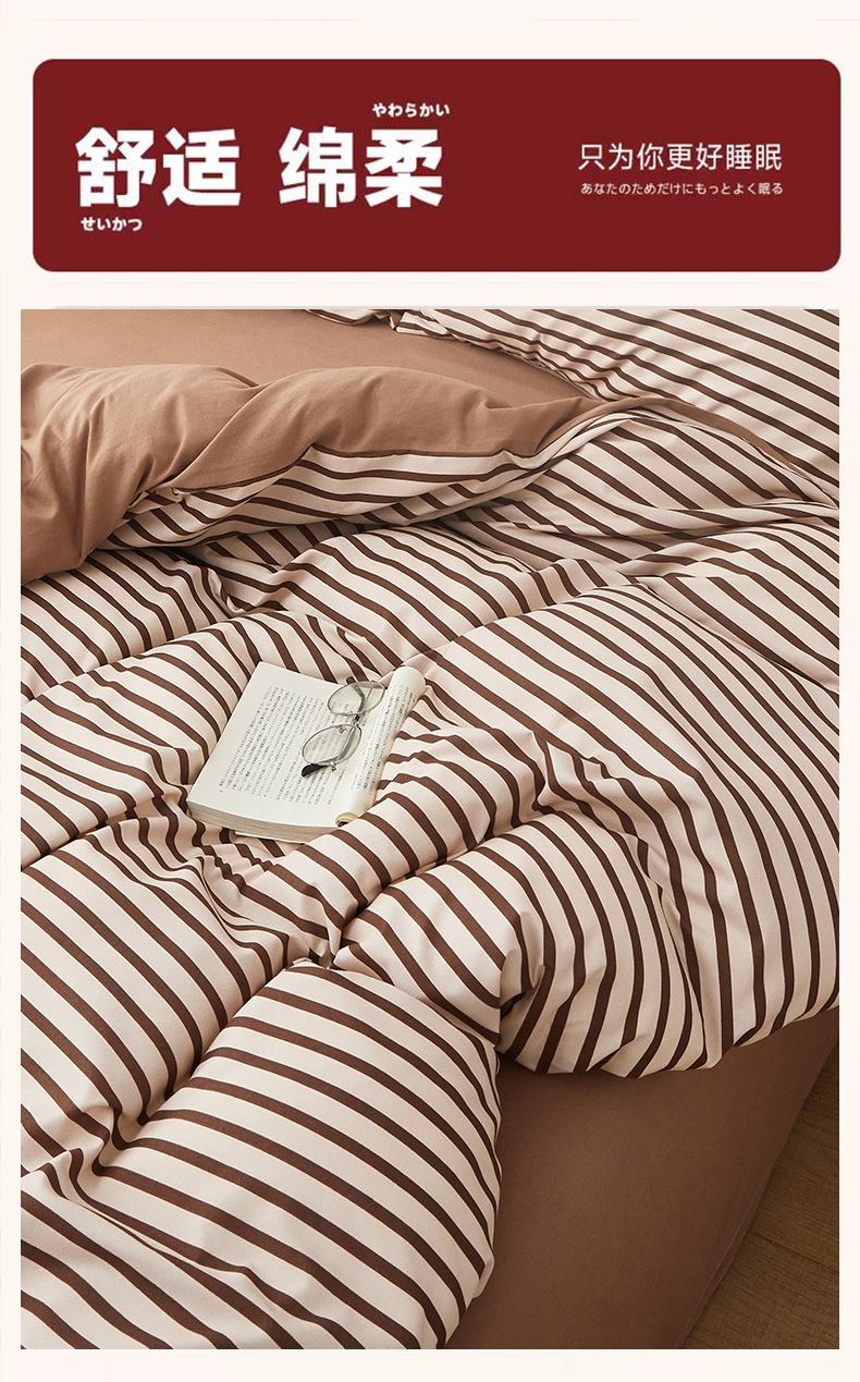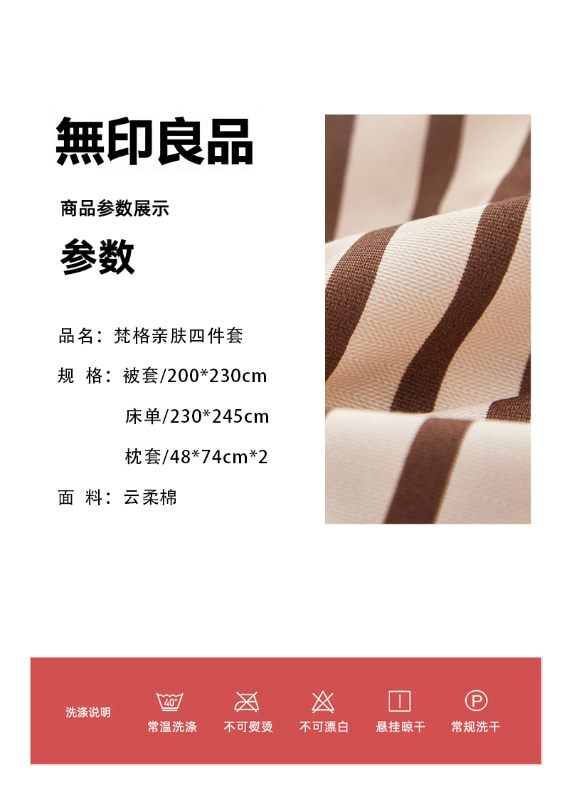 被套:200*230cm 床单:230*245cm 枕套:48*74cm*2 面料:云柔棉 执行标准:GB/T22796-2021 安全类别:GB18401-2010 B类 1.选用优质亲肤云柔棉面料,全工艺活性印染结合水洗处。 2.花型设计了无印良品经典简约风,选择较为简约温馨的颜色,更加适合年轻一代居家使用; 3.绿色环保印染技术,严控PH值甲醛等,枕套采用口袋式设计,美观大方,让您时刻感受现代简约家居的睡眠新体验。