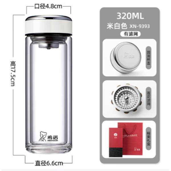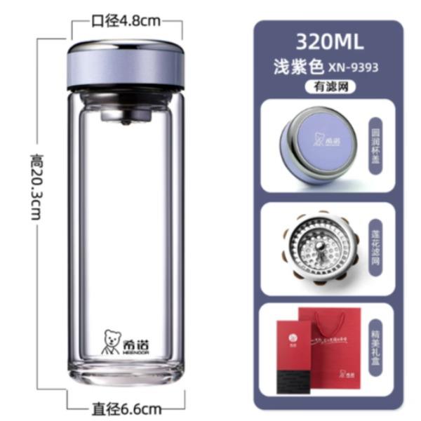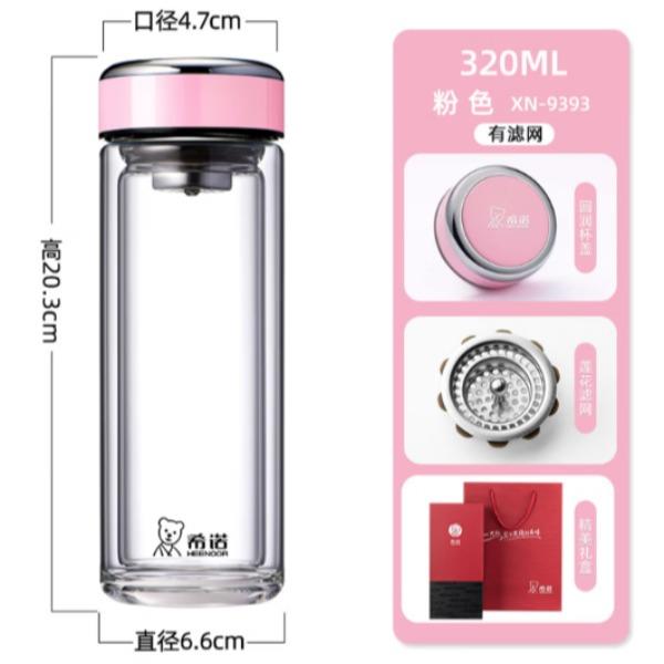 产品规格: 容量:XN-9393/320ml 规格: XN-9393/20.3*6.6cm 颜色:紫罗兰、珠光本、粉色、浅蓝、橙色、米白、浅紫、玫瑰粉 杯体:双层高硼玻璃 滤网:莲花滤网