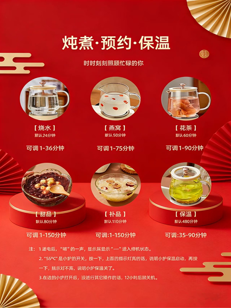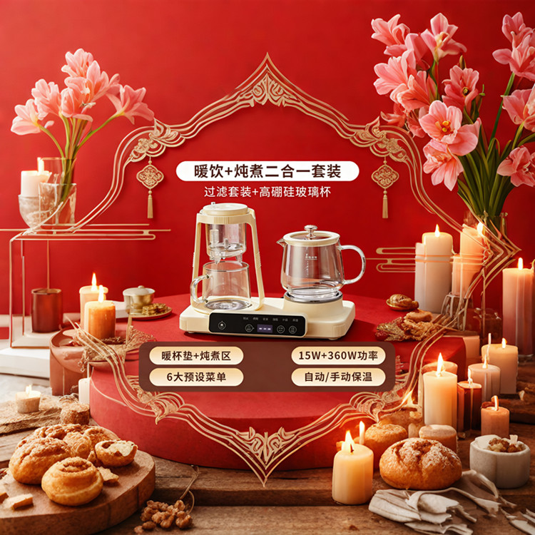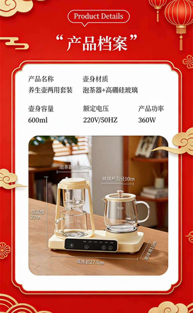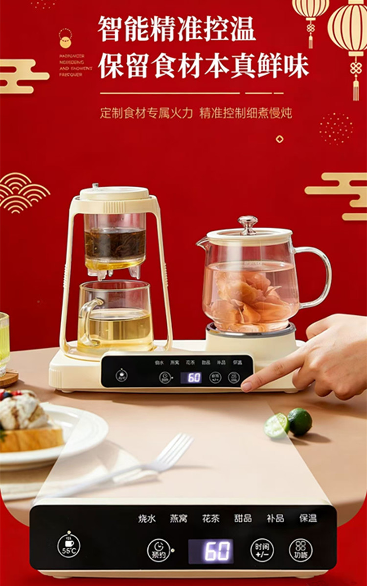额定功率:15W+360W 颜色:奶油白 主机容量:250ML+600ML 规格:二合一养生壶套装 产品款式:微电脑轻触操作 包装清单:泡茶器+水杯+高硼硅玻璃壶+底座 1、滤茶支架懒人轻松泡茶器,左边保温,右边炖煮同享; 2、泡茶器暖饮炖煮杯套装,6大预设功能,15W暖饮,375W炖煮; 3、600ML炖煮养生杯+250ML水杯滤茶恒温杯二合一; 4、分体式养生壶杯壶,清洗方便,提壶即饮; 5、高硼硅玻璃壶+泡茶支架饮水杯,轻奢泡茶,高温防干烧自动断电; 6、轻松安装,自动断电,防干烧功能;一机多用,取下直接可用于婴儿暖奶及保温;