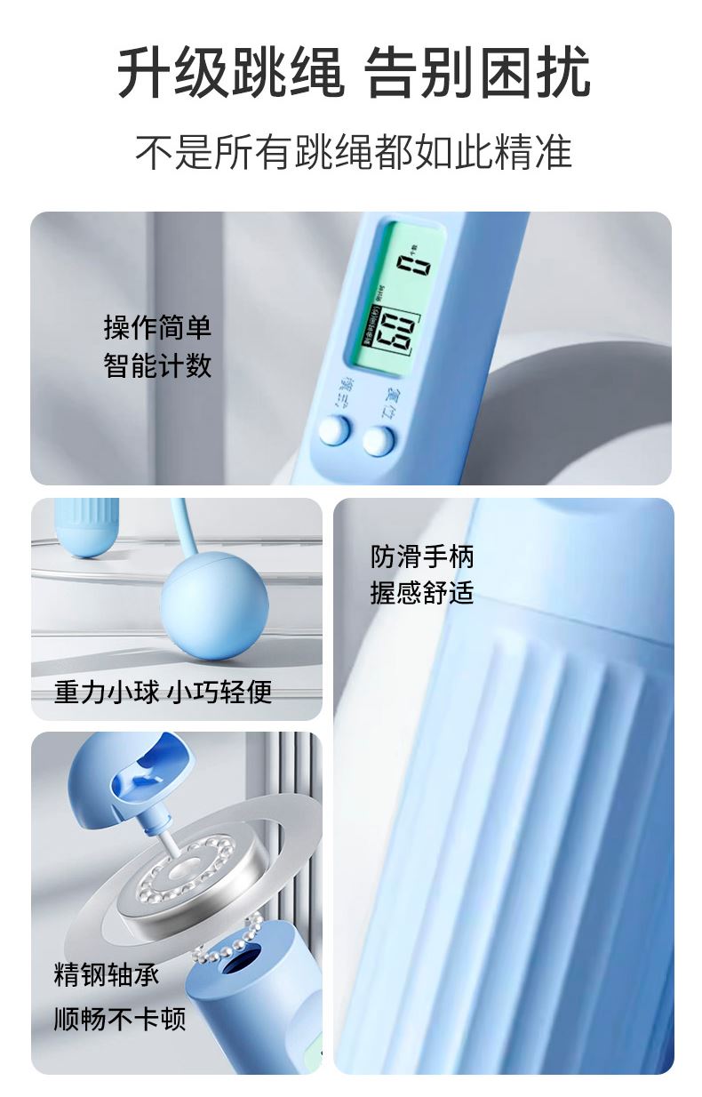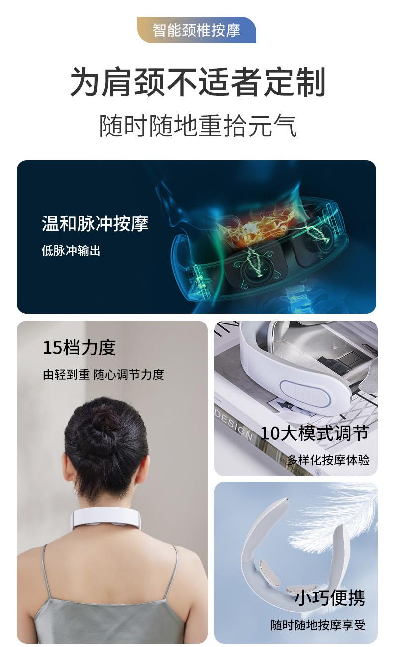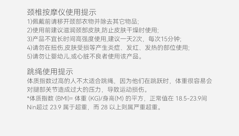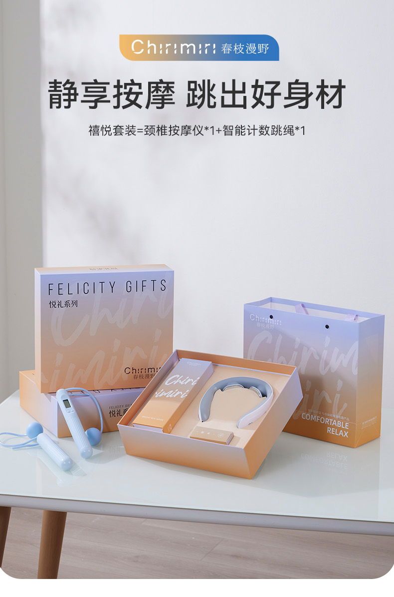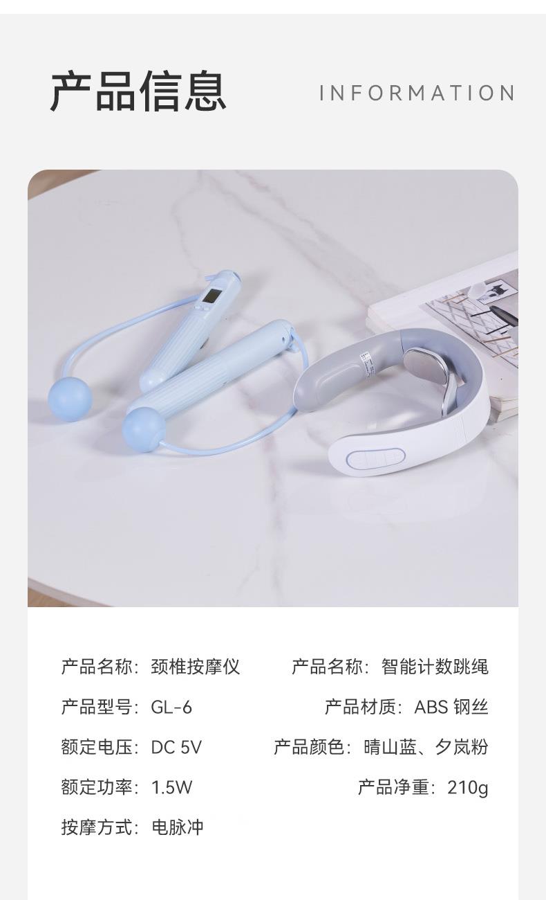 智能颈椎仪: 微电流脉冲按摩,助力每日元气满满 人体工程学设计,给你更好的体验 重新定义EMS智能微电技术 轻巧便携,走到哪按到哪儿 智能计数跳绳: 智能计数,防滑手柄 高清大屏清楚掌握运动量 专业目标训练,顺畅不卡顿 有绳/无绳,室内室外满足多重场景 轻磨砂舒适触感,活力开练