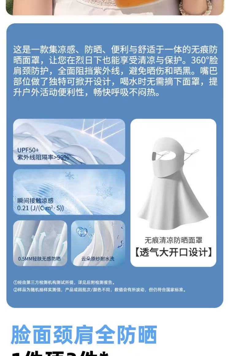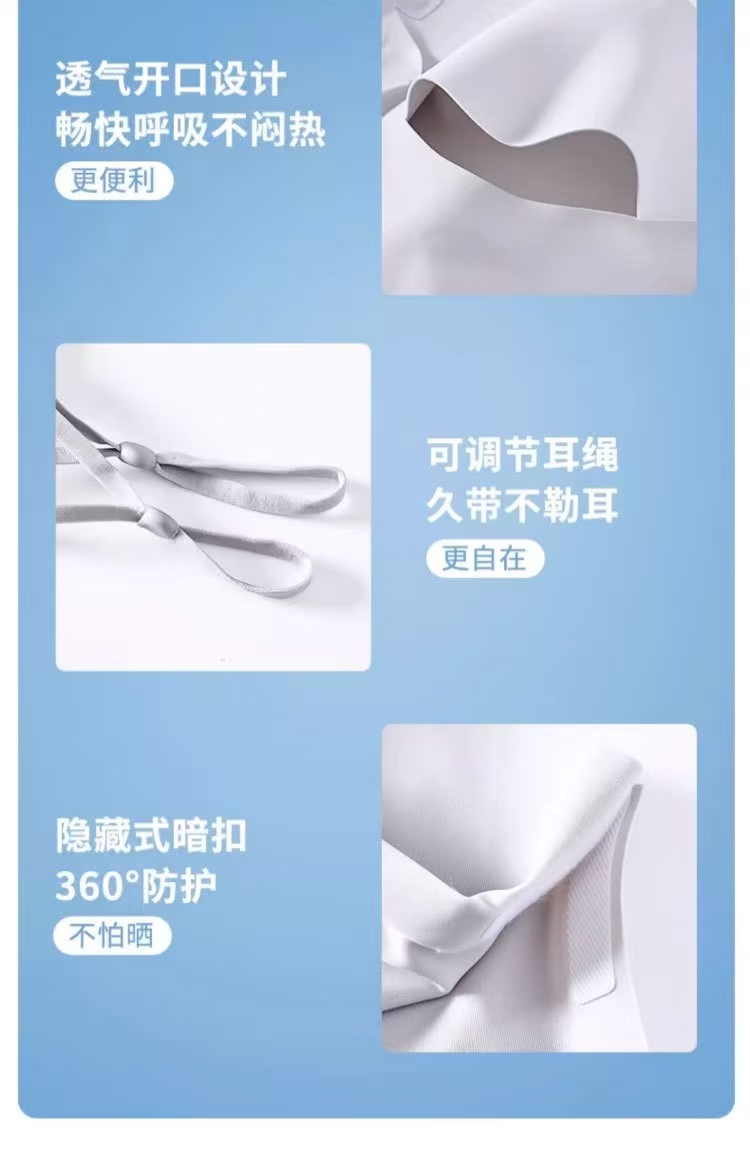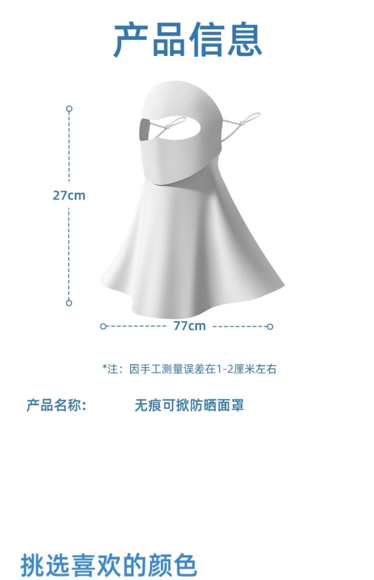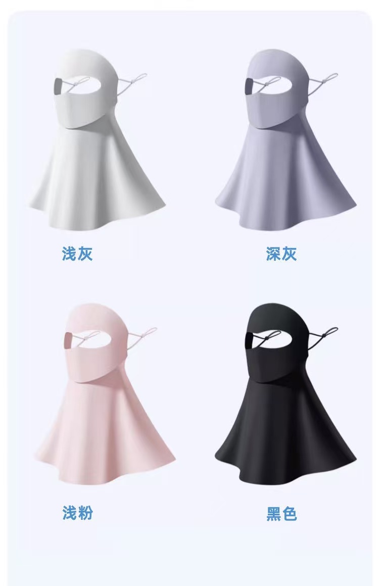产品卖点: 1.UPF50+、紫外线阻隔≥96%、高科技凉感纤维高2.效隔热、冰凉透气、修饰脸型显脸小、可调节 3.设计隐藏式开口喝水更简便 内隐鼻洞 空气更流畅 4.加长面颈防护 防晒至肩颈 产品面料:冰丝产品尺寸:均码