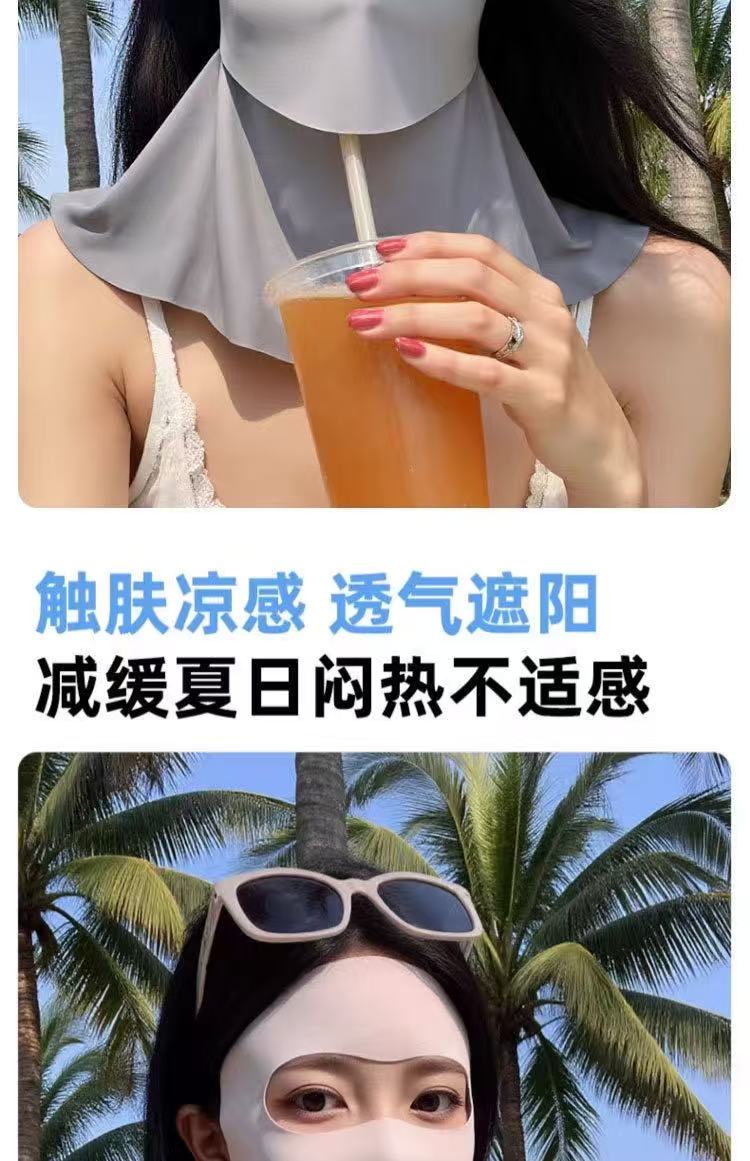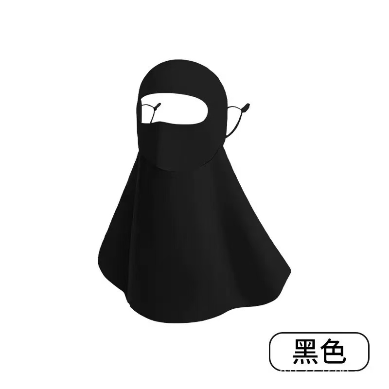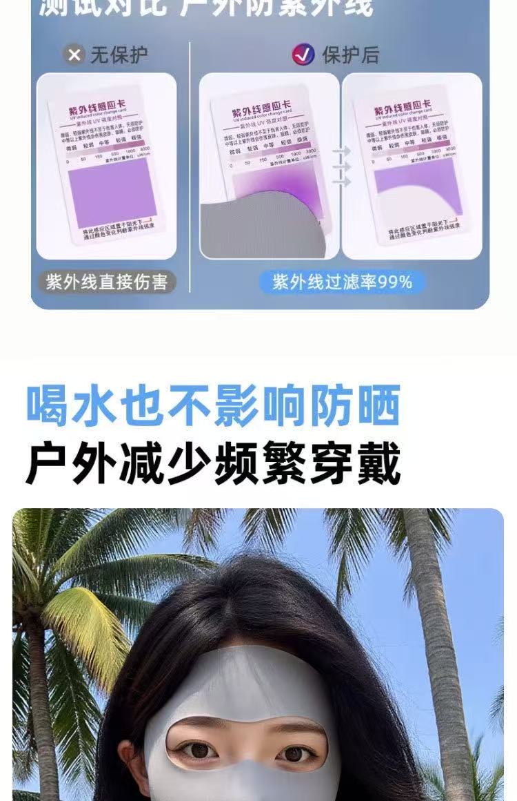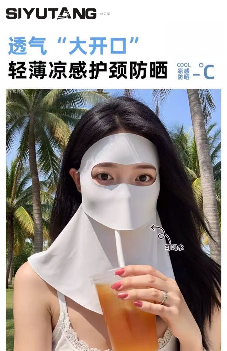 产品卖点: 1.UPF50+、紫外线阻隔≥96%、高科技凉感纤维高2.效隔热、冰凉透气、修饰脸型显脸小、可调节 3.设计隐藏式开口喝水更简便 内隐鼻洞 空气更流畅 4.加长面颈防护 防晒至肩颈 产品面料:冰丝产品尺寸:均码