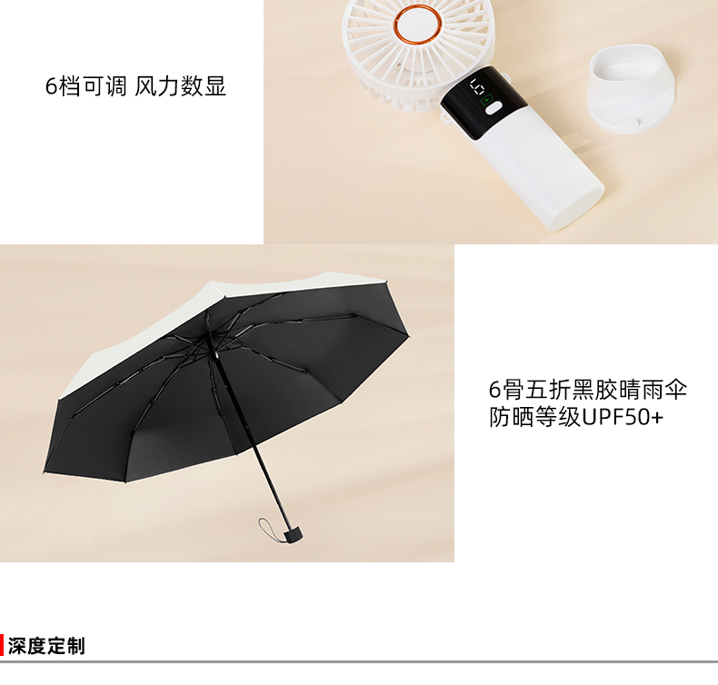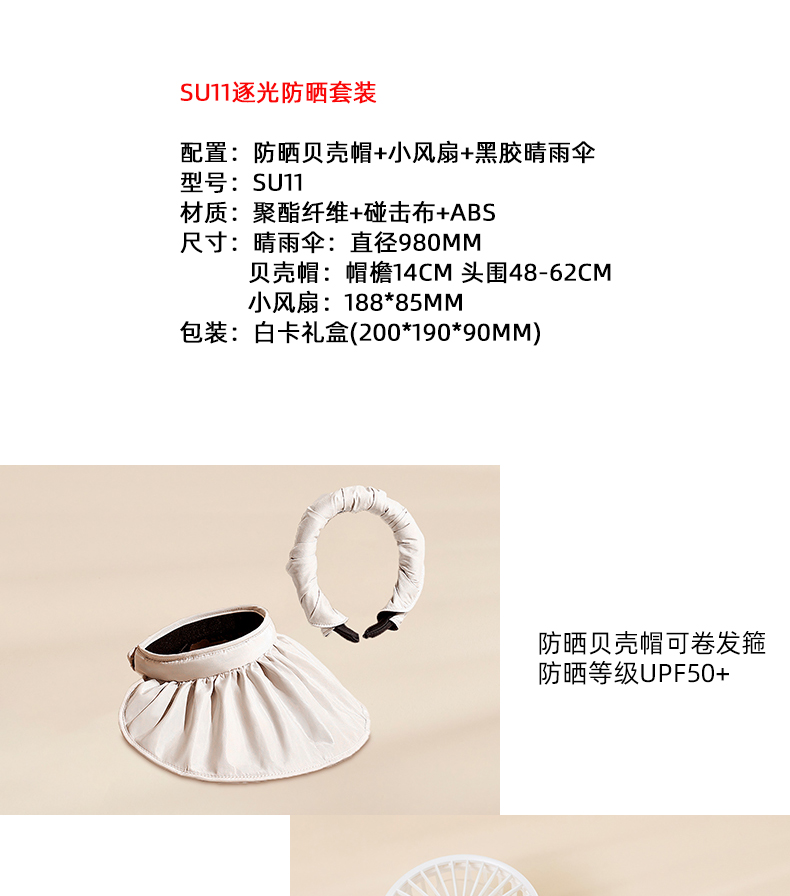 配置:防晒贝壳帽+小风扇+黑胶晴雨伞 型号:SU11 材质:聚酯纤维+碰击布+ABS 尺寸:晴雨伞:直径980mm 贝壳帽:帽檐14cm 头围48-62cm 小风扇:188*85mm 包装:白卡礼盒(200*190*90mm)