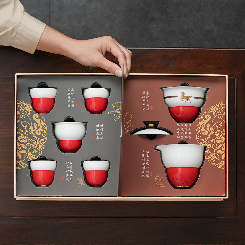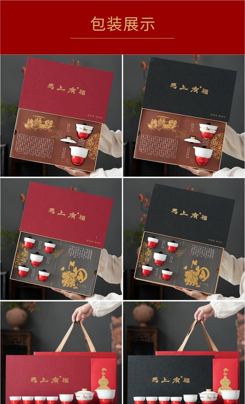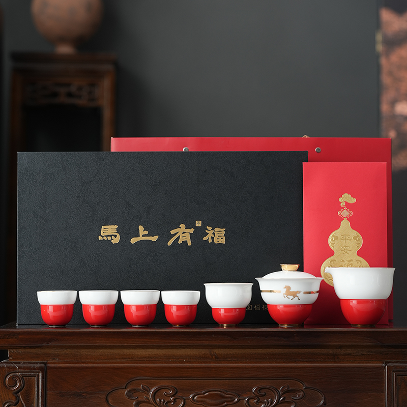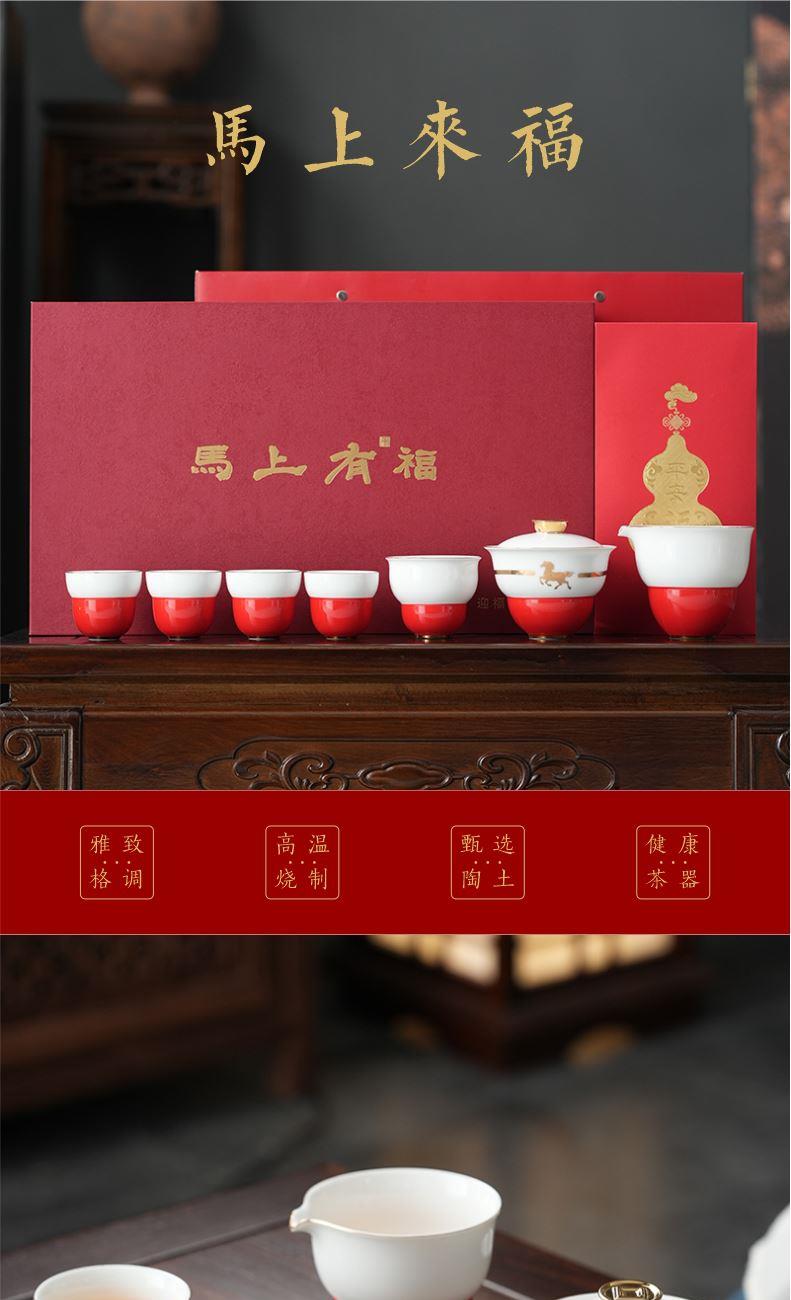材质:陶瓷 工艺:高温窑烧 烤花工艺 包装:红色商务礼盒 配置清单:茶壶*1 公道杯*1 主人杯*1 品茗杯*4 礼盒*1 马年元素 造型独特 雅致格调 高温烧制 甄选陶土 健康安全 葫芦造型 福禄双收 寓意美好