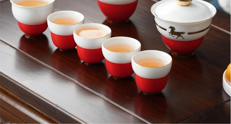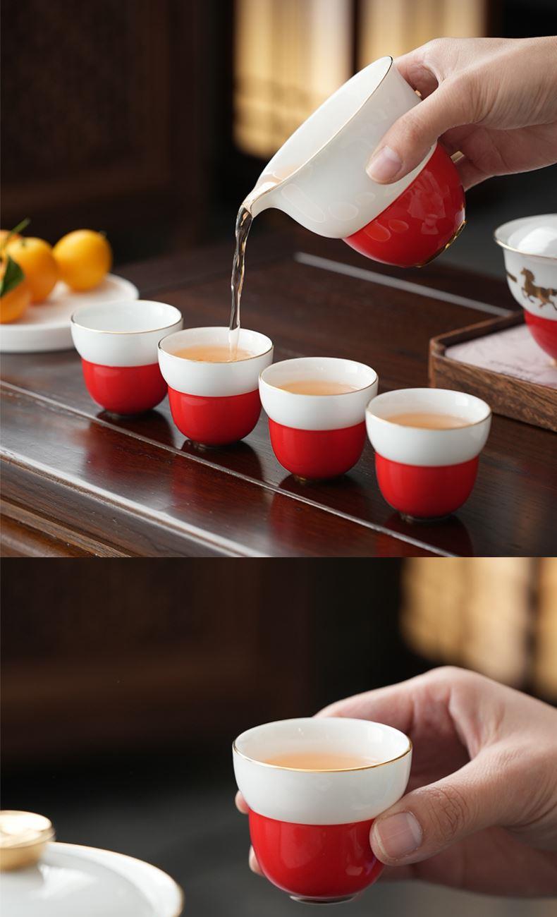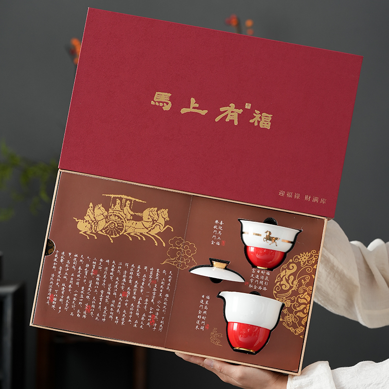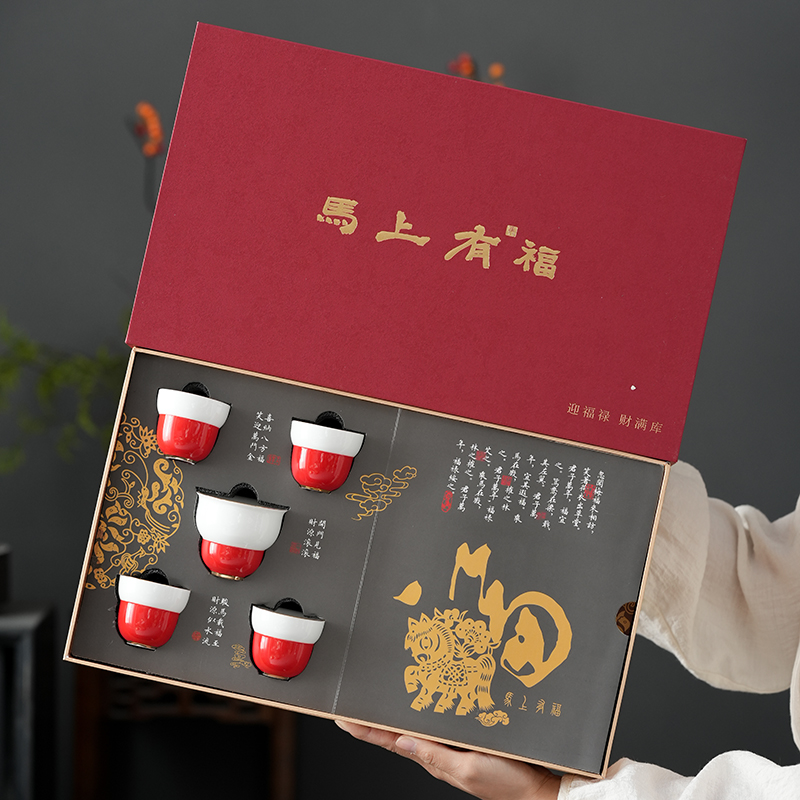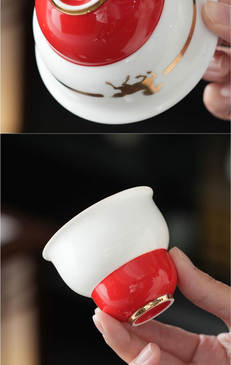 材质:陶瓷 工艺:高温窑烧 烤花工艺 包装:红色商务礼盒 配置清单:茶壶*1 公道杯*1 主人杯*1 品茗杯*4 礼盒*1 马年元素 造型独特 雅致格调 高温烧制 甄选陶土 健康安全 葫芦造型 福禄双收 寓意美好