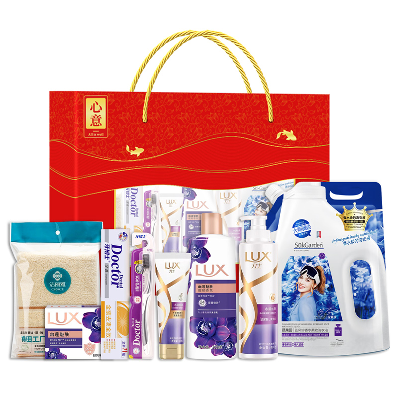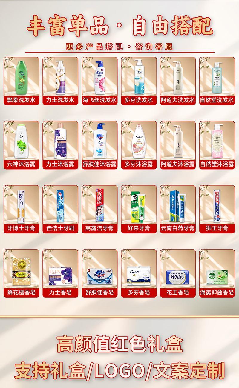 礼盒尺寸:32*8.5*24.5cm 包装尺寸:66*46.5*51CM 产品配置:(香型随机) 力士洗发水-400ml 力士护发素-160ml 力士沐浴露-350ml 力士香皂-105g 牙博士牙膏=105g 牙博士牙刷 蔬果园洗衣液-1kg 洁丽雅毛巾-69*33cm 精美礼盒