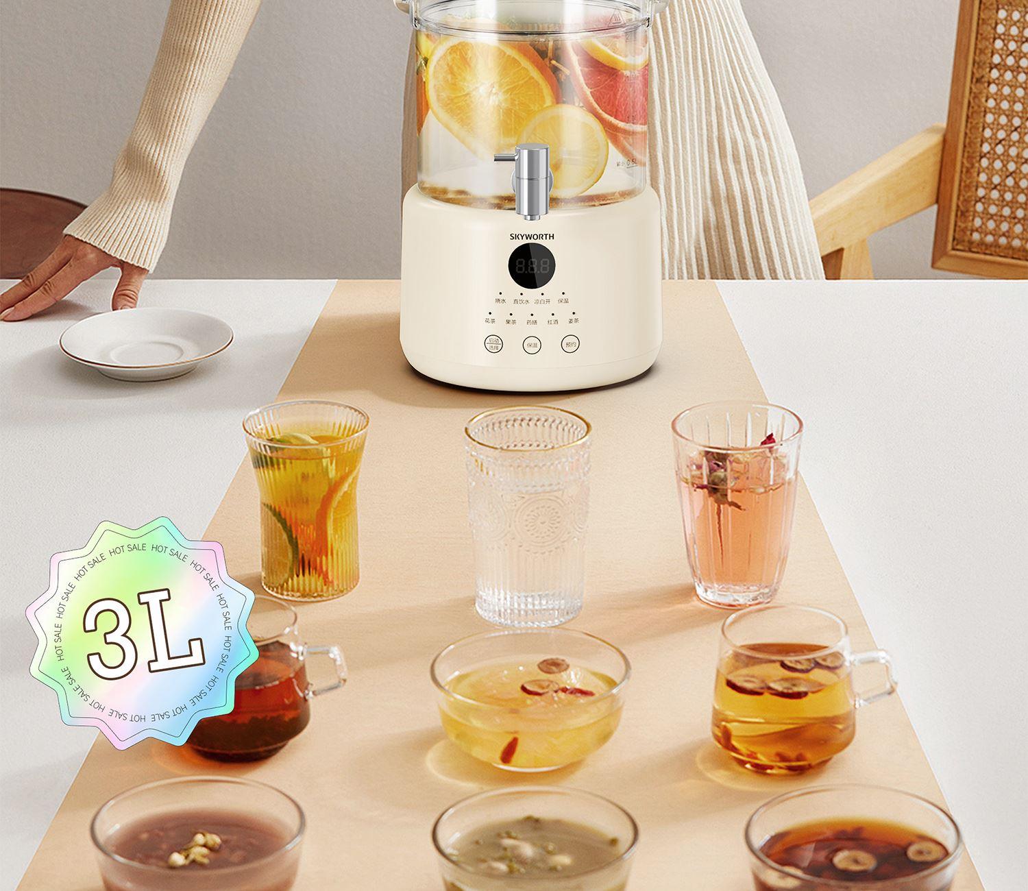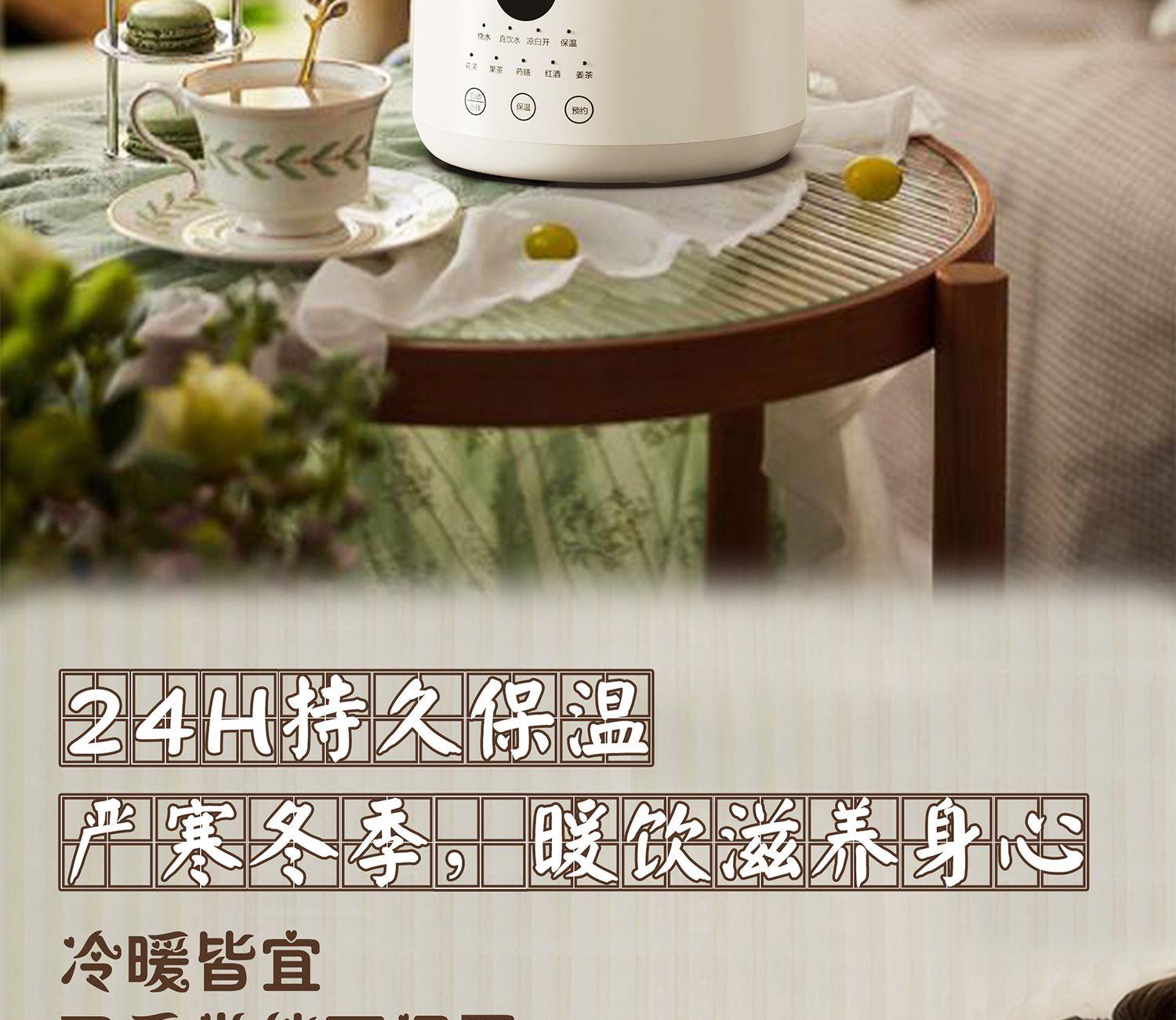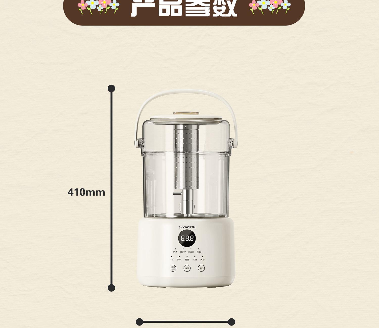额定电压:220V~ 额定频率:50Hz 额定功率:1000W 容 量:3L • 3L大容量分享; • 高硼硅玻璃; • 分体式设计,便携出水; • 24H持久保温,可预约功能; • 240秒自动记忆提壶前水温,放回无需重置。