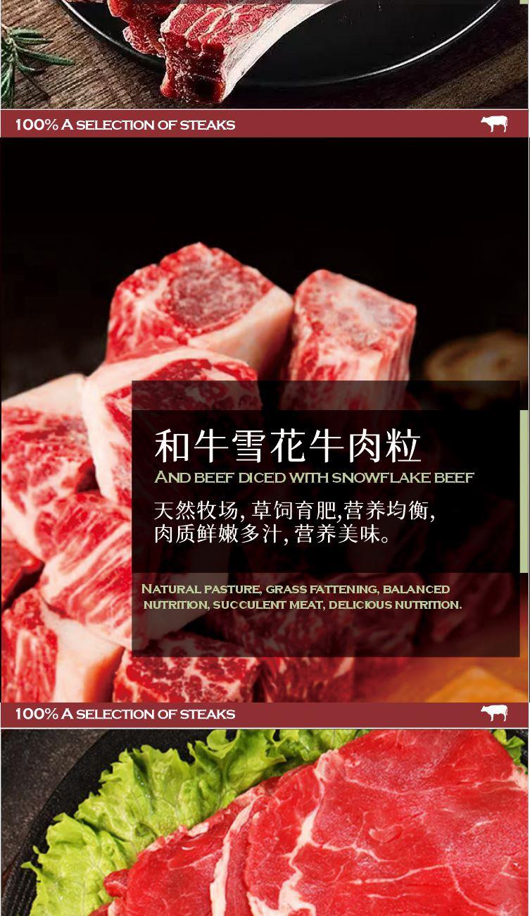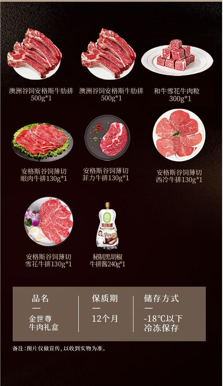 澳洲谷饲安格斯牛肋排500g 澳洲谷饲安格斯牛肋排500g 和牛雪花牛肉粒(盒装)300g 安格斯谷饲薄切眼肉牛排130g 安格斯谷饲薄切菲力牛排130g 安格斯谷饲薄切西冷牛排130g 安格斯谷饲薄切雪花牛排130g (赠)秘制黑胡椒牛排酱240g 加厚保温箱+保温措施 免费宅配到家服务