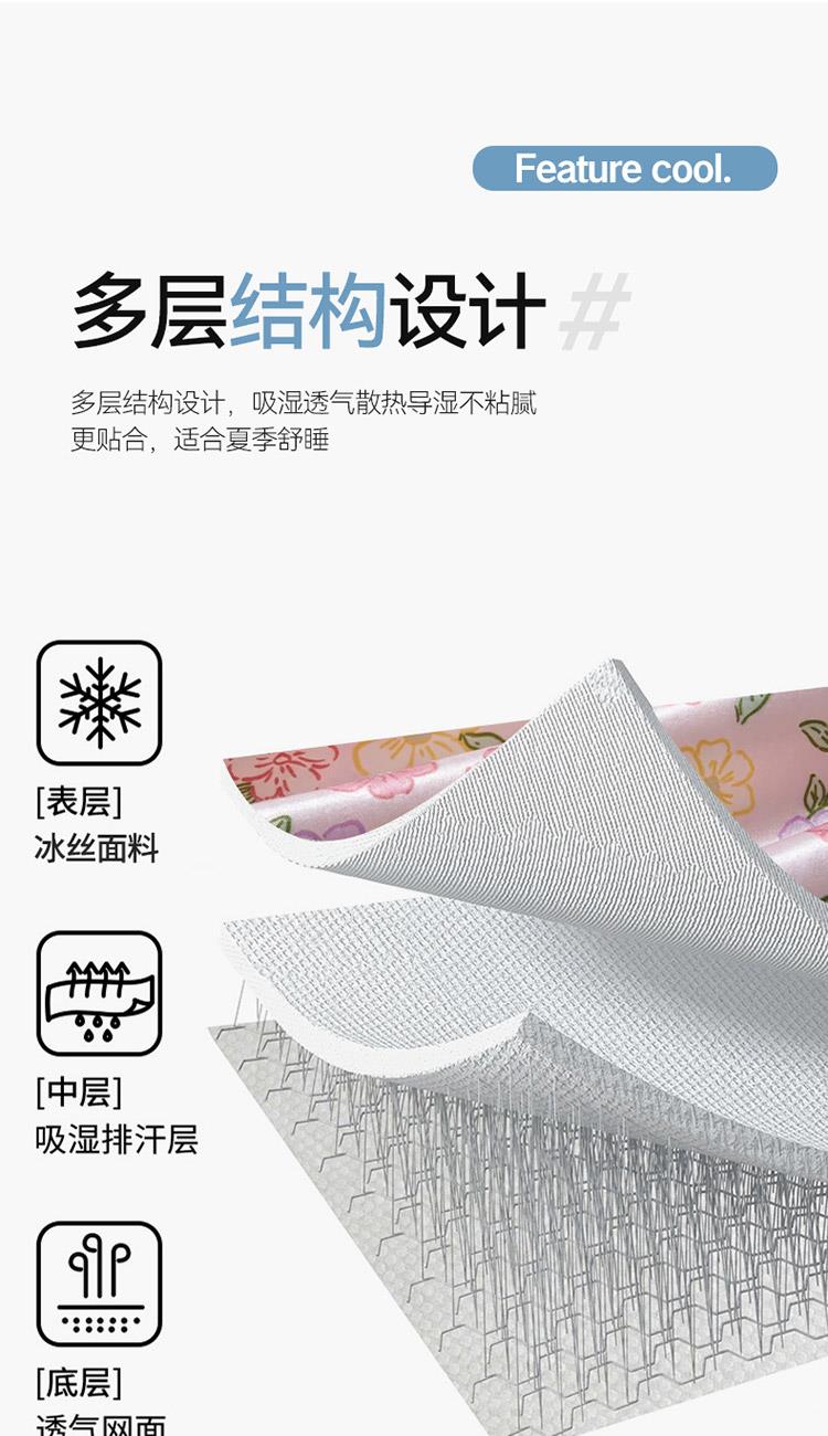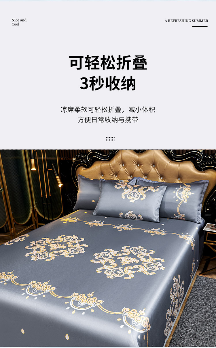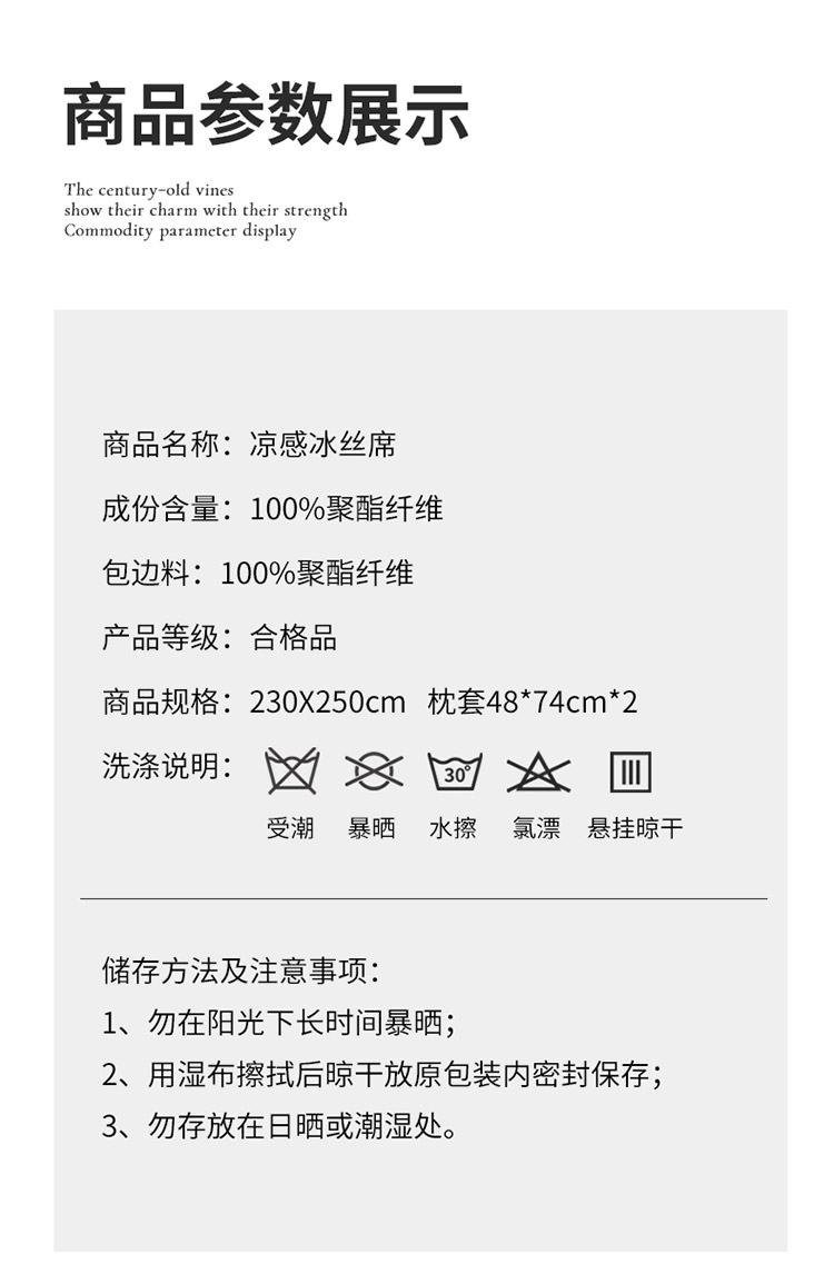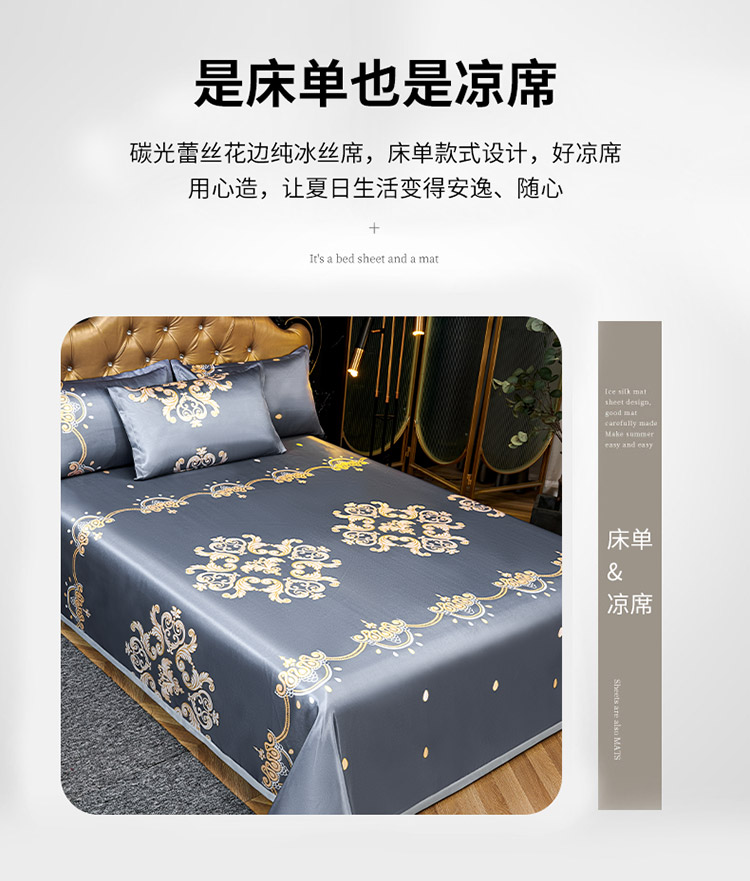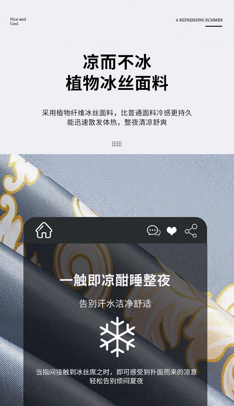 1:冰丝面料,可快速散热透气 有效排汗,干爽不黏腻,时刻保持清凉舒爽 2:不闷不燥不粘腻,宜人体感,清凉不沾身,适合全家使用:透气、排汗、干爽 3:精致印花工艺一眼心动、时尚印花工艺,聚焦凉席本身的质感与设计打破单调,包揽美梦时光 尺寸:230*250cm床单*1枕套:48*74cm*2 面料:凉感透气冰丝 包装:礼袋