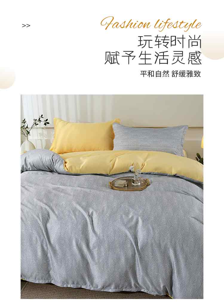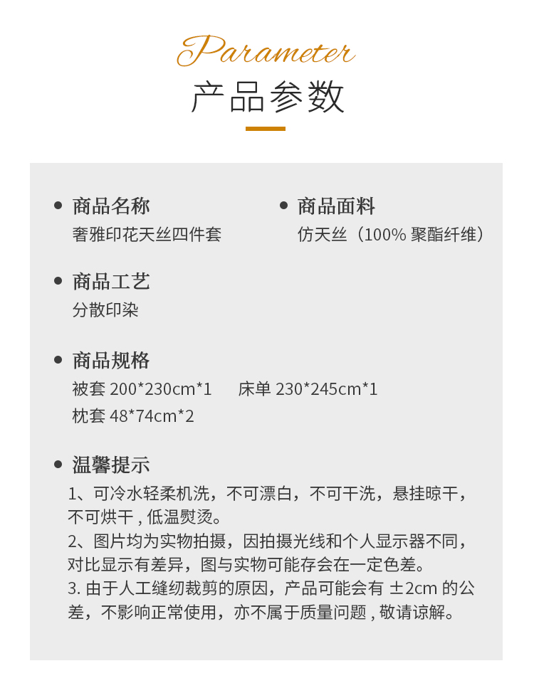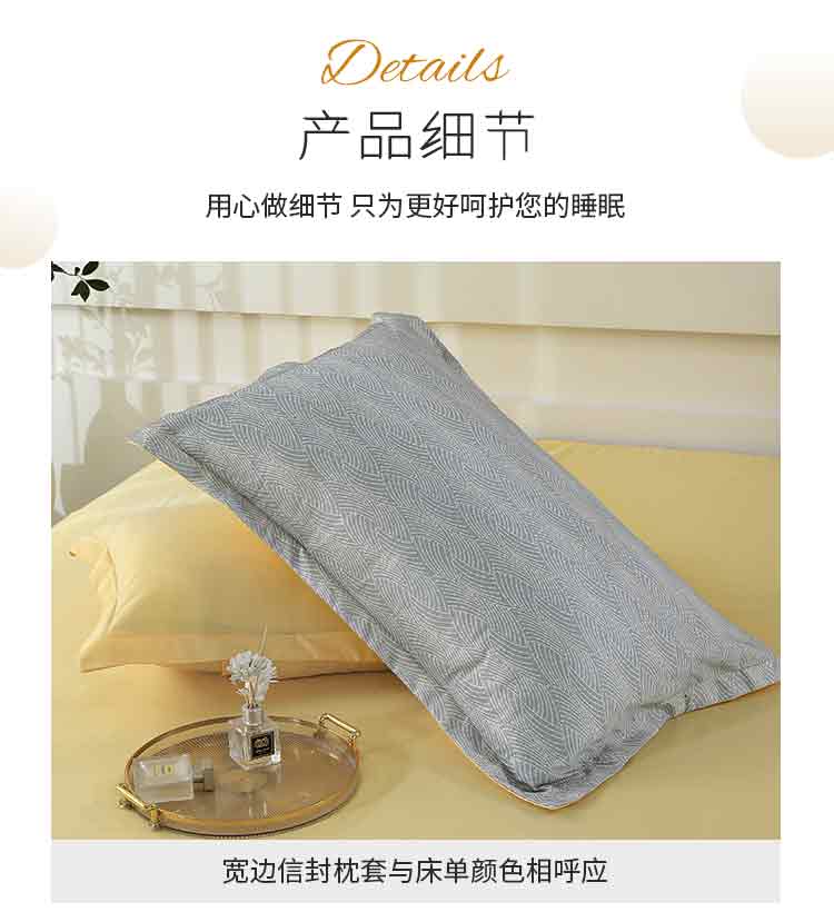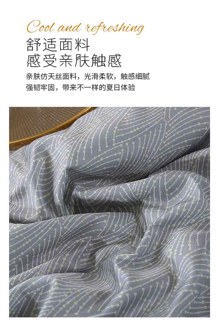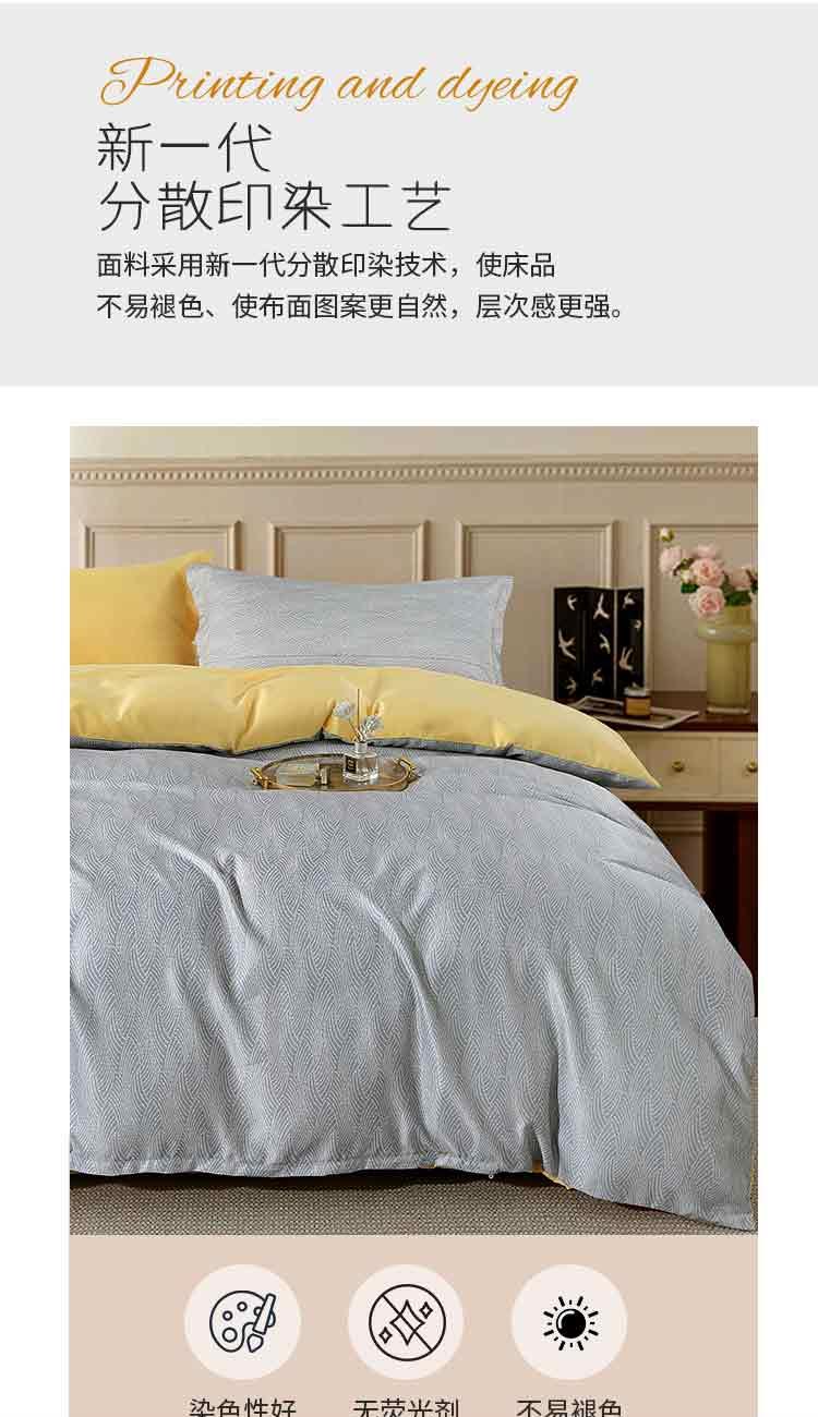 型 号:HS-J-XW23101 面 料:仿天丝 规 格:被套200*230cm*1 床单230*245cm*1 枕套48*74cm*2 产品说明: 1.宏石家纺主打爆款夏凉件套,仿天丝印花系列,全工艺面料升级制作,克重再加高,沁爽凉感,不缩水不起球,手感更密实,活性分散印染工艺不易褪色、使布面图案更自然,层次感更强。 2.宽边信封枕套与床单颜色相呼应,被套拉链隐藏式设计,开合更方便,是一款自用与礼赠皆适宜的实用产品。