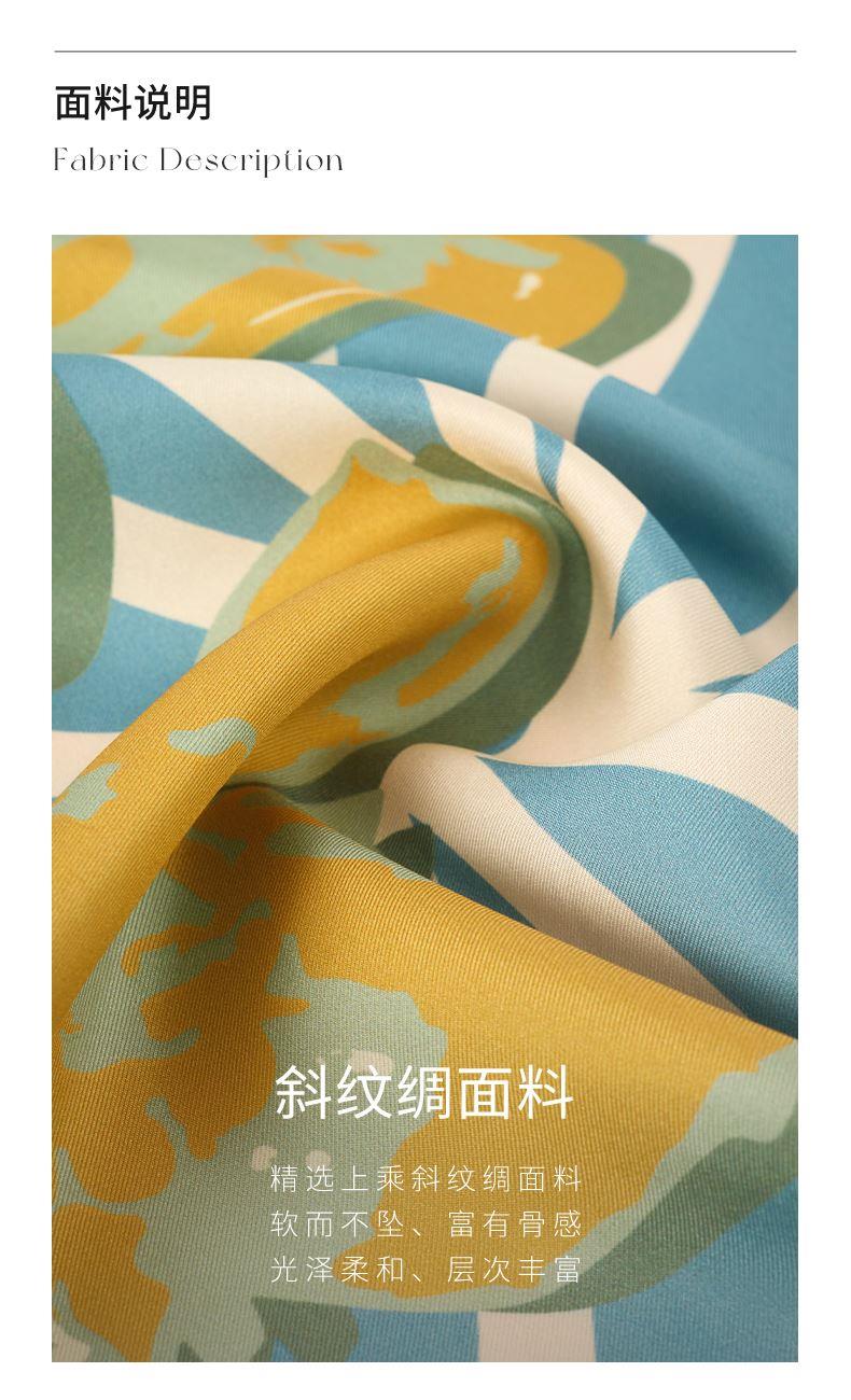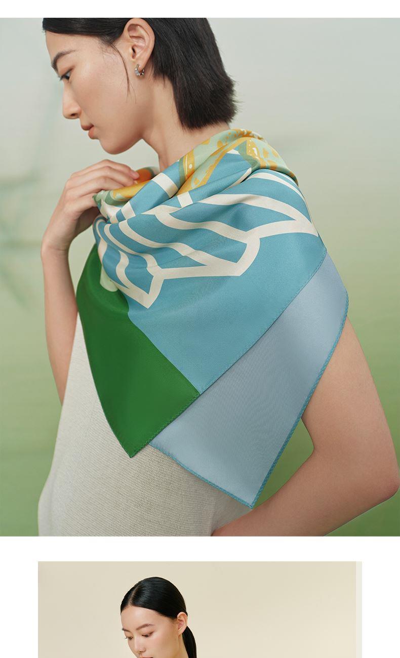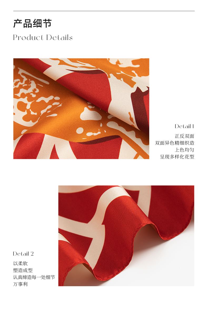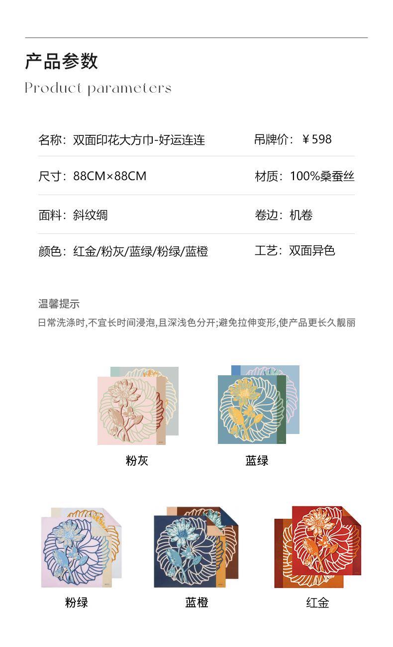 尺寸:88CM×88CM 材质:100桑蚕丝 面料:斜纹绸 卷边:机卷 颜色:红金/粉灰/蓝绿/粉绿/蓝橙 工艺:双面异色