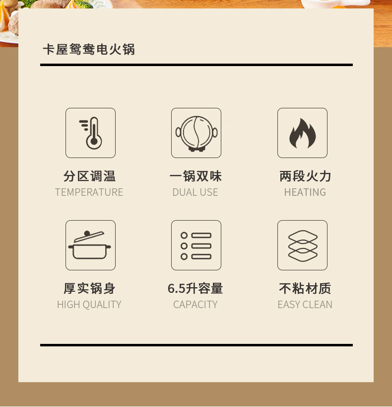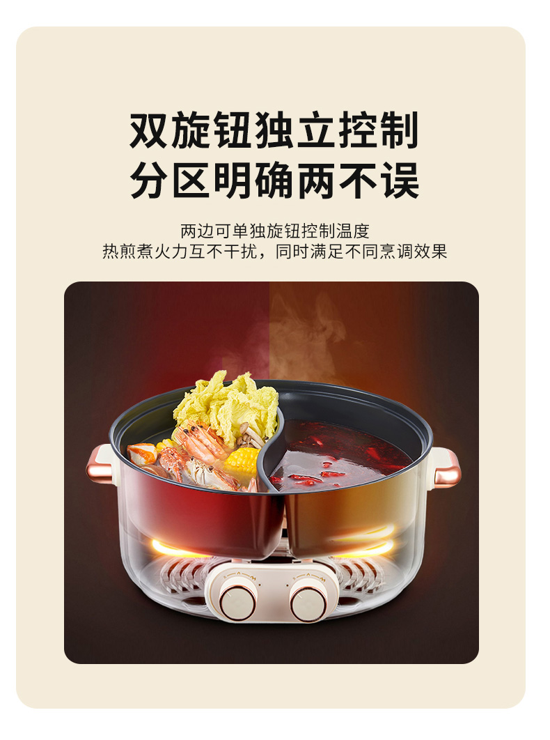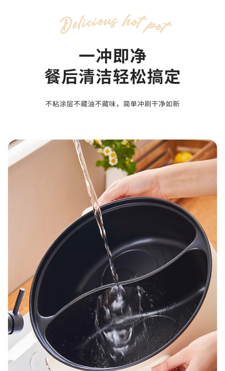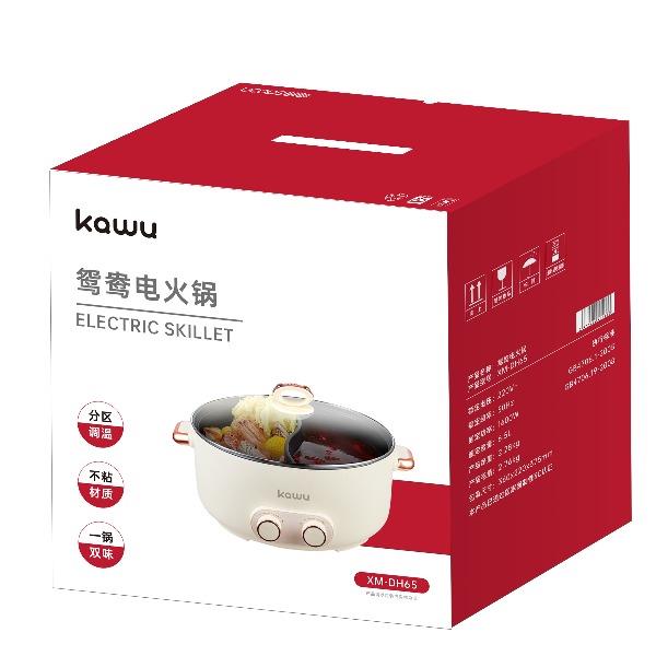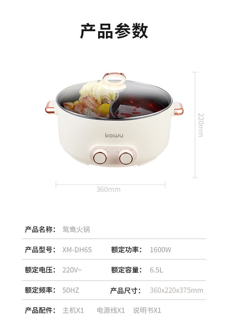 产品型号:XM-DH65 额定功率:1600W 额定电源:220V~50Hz 产品尺寸:360x220x375mm 产品容量:6.5L 单台净重:2.3KG 单台毛重:2.8KG 商品条码:6977256041252 1.鸳鸯电火锅 涮出南北风味 2.加长加大深锅 巧扩容量涮煮更尽兴 3.双旋钮独立控制分区明确两不误 4.鸳鸯双味涮煮不干扰 5.旋钮双档控温轻松操作没难度 6.不粘涂层 烹煮涮拒绝糊底
