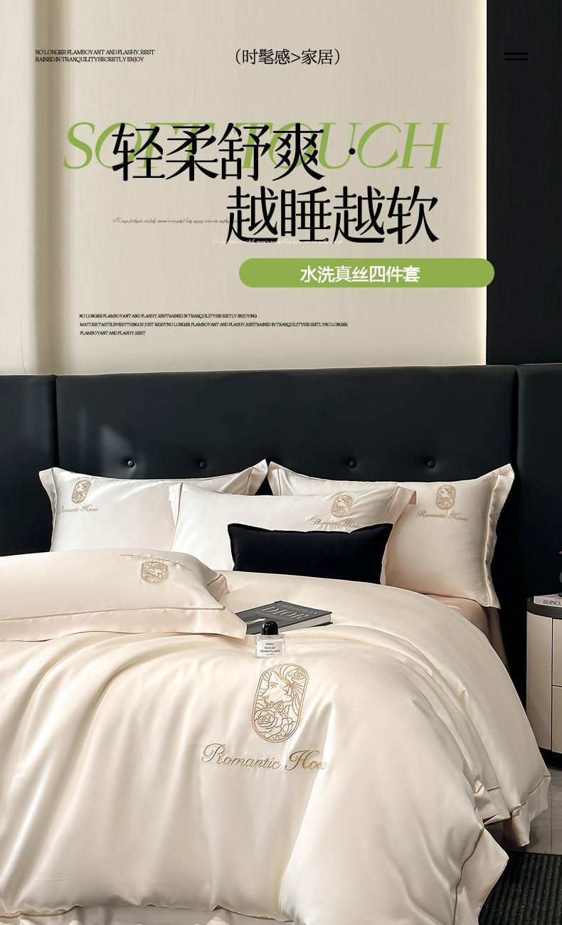 被套:200*230cm 床单:230*235cm 枕套:48*74cm*2 面料:水洗天丝 执行标准:GB/T22796-2021 安全类别:GB18401-2010 B类 1.舒适水洗真丝面料,柔软舒适亲肤贴身、不褪色。以再生纤维为原料,经过精梳工艺处理,面料手感柔软如贴身内衣,睡感舒适,透气。凉而不冰,触感舒适不粘身,有着棉的柔软与丝的冰滑,灵感加持,吸湿透气不闷热。 2.面料缩水率低,色牢度高,经洗耐用。