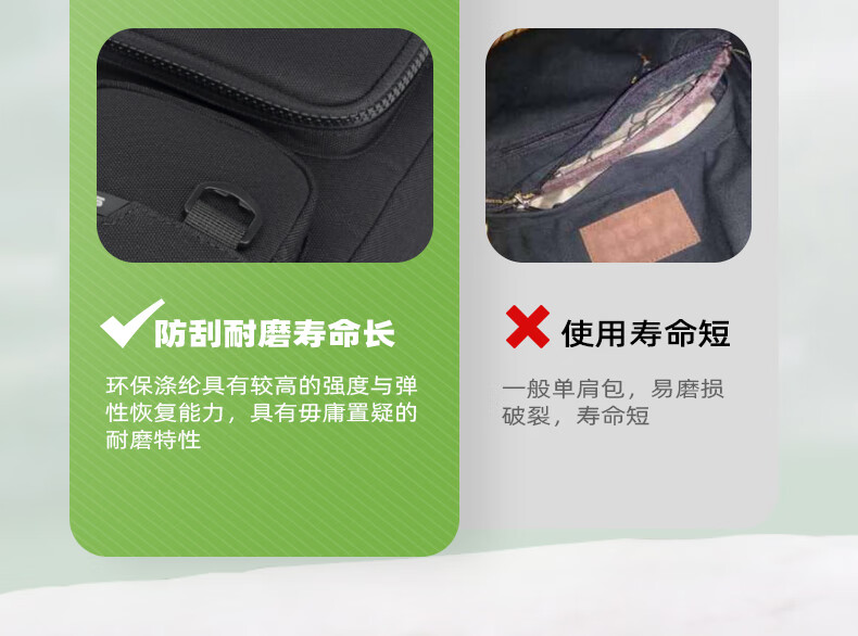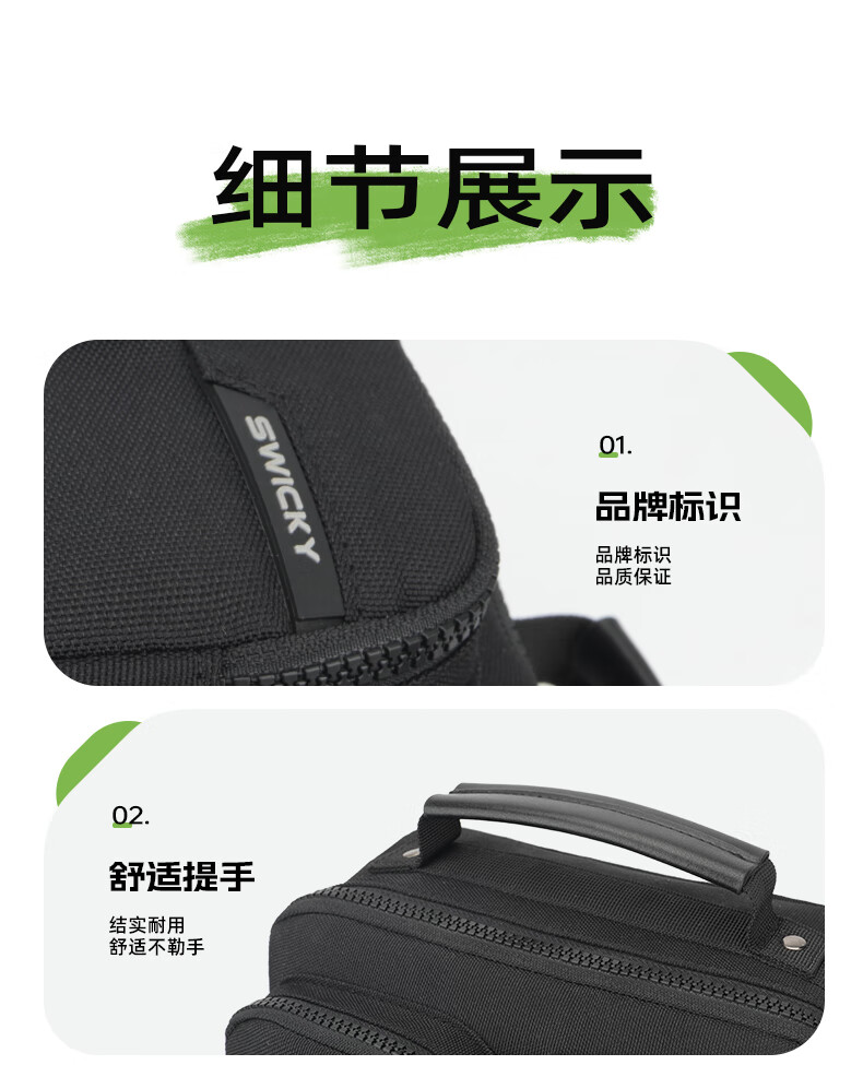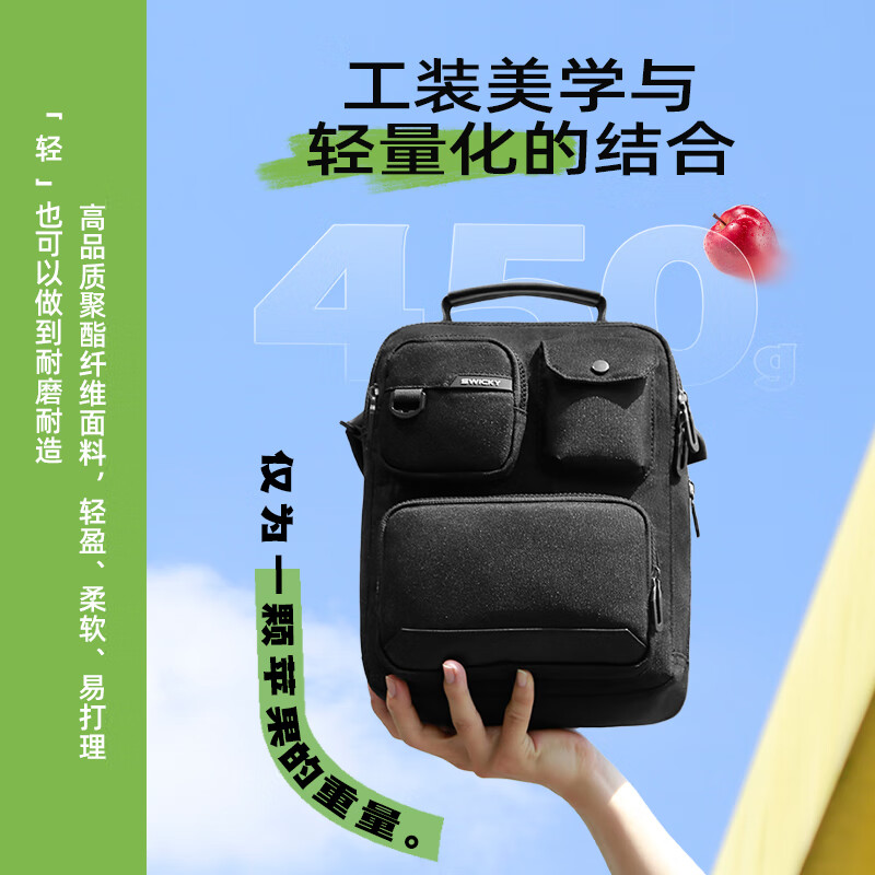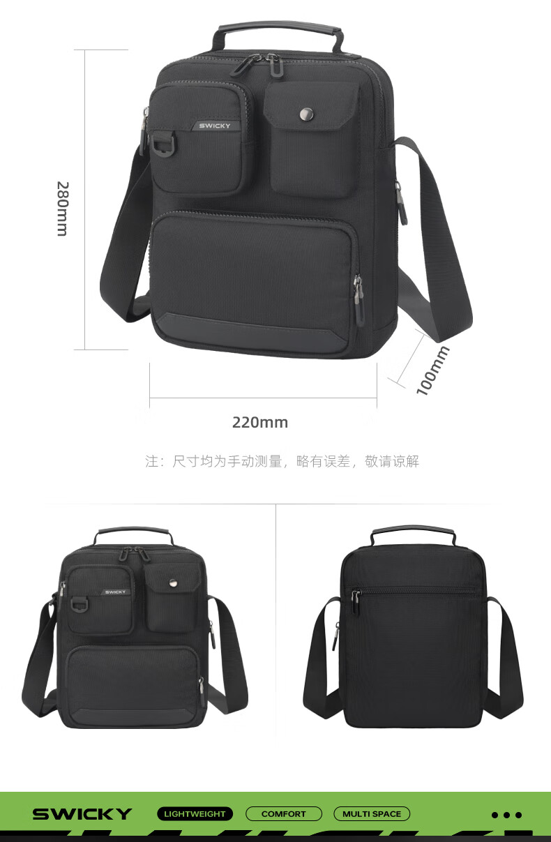 型 号:33020 新品 尺 寸:280*220*100(MM) 材 质:环保在生面料 颜 色:黑色 重 量:0.45kg 1.精炼能干商务搭档 2.分层明细取物更便捷; 4.可调节肩带,调节肩带不易滑落 5.舒适提手,结实耐用舒适不勒手 6.防泼水耐磨面料,增强透气程度与舒适度 7.高品质环保涤纶面料,具有良好的透气性与环保可持续性。身心更健康! 8.环保涤纶具有较高的强度与弹性恢复能力,具有毋庸置疑的耐磨特性