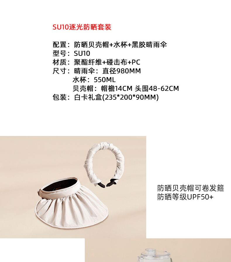配置:防晒贝壳帽+水杯+黑胶晴雨伞 型号:SU10 材质:聚酯纤维+碰击布+PC 尺寸:晴雨伞:直径980mm 水杯:550ml 贝壳帽:帽檐14cm 头围48-62cm 包装:白卡礼盒(235*200*90mm)