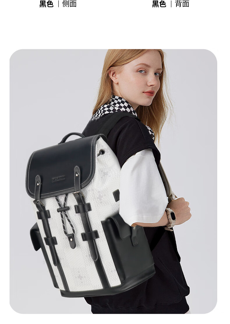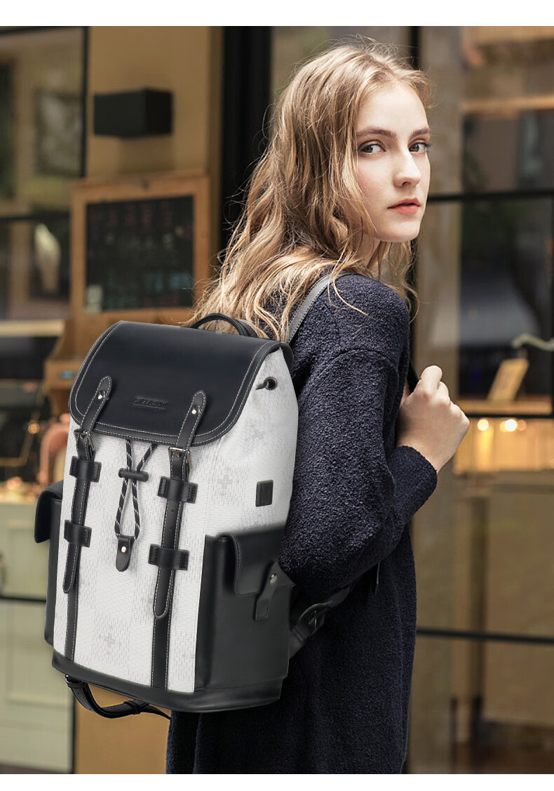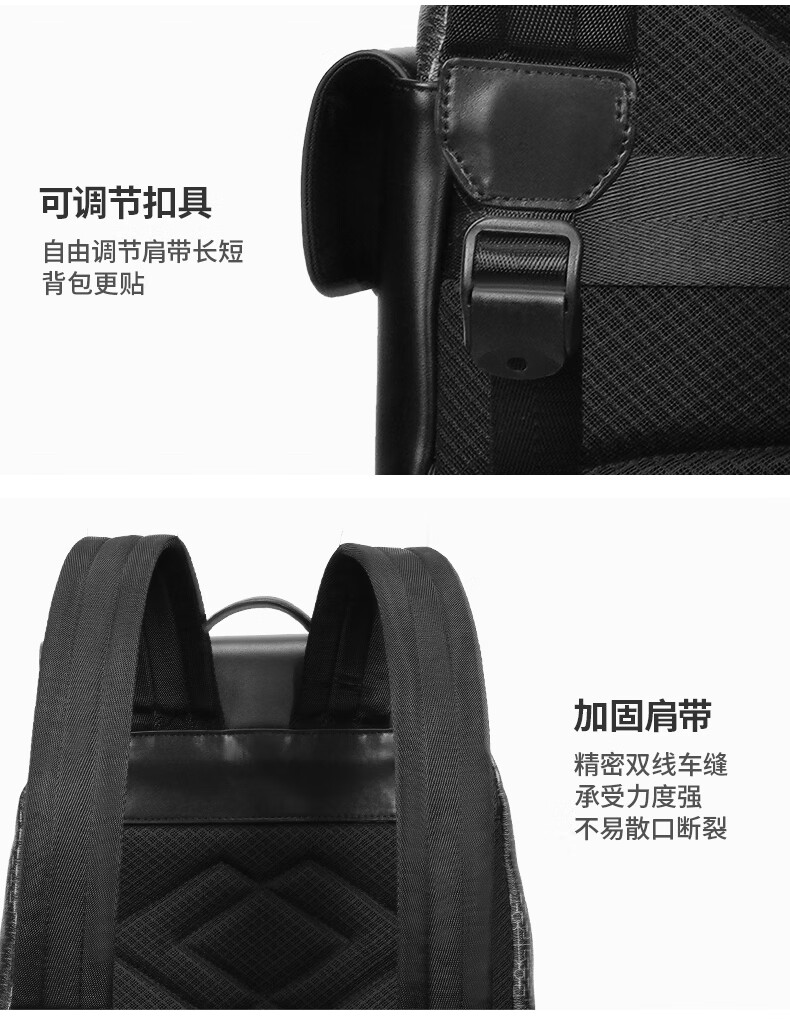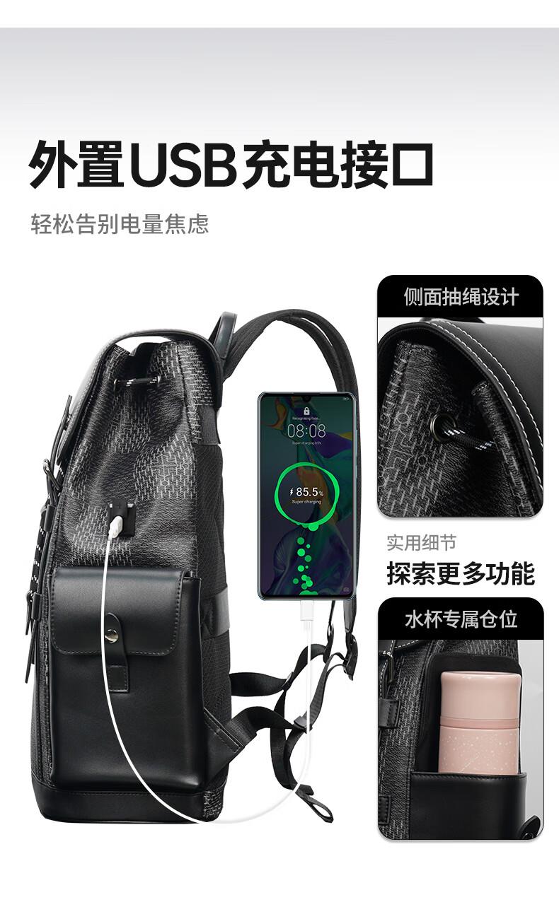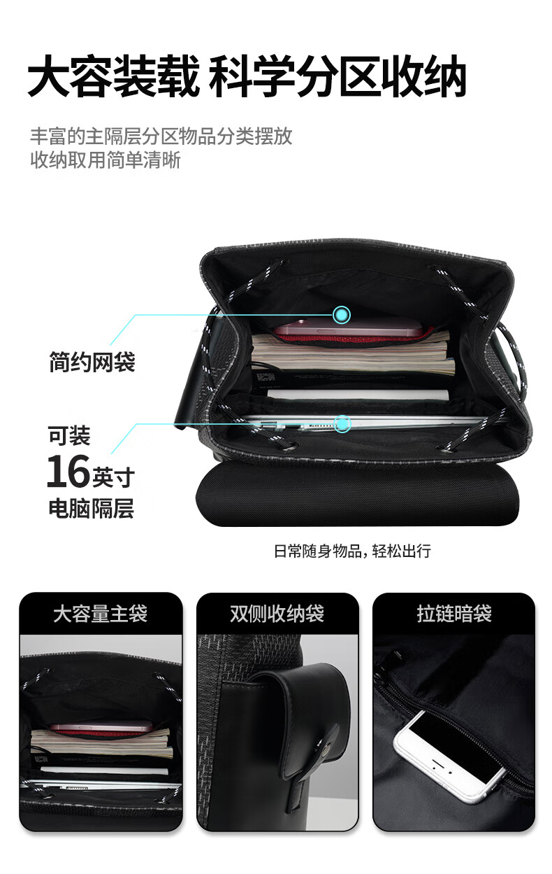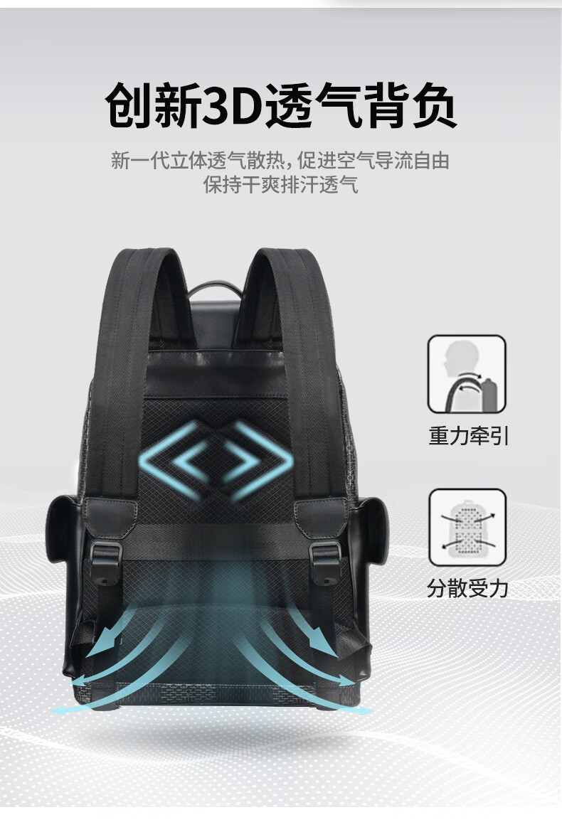 型 号:88174 尺 寸:160*320*430(MM) 材 质:织物 颜 色:黑色/白色 重 量:1.0KG 2.超大容量设计可放16寸电脑; 3.主袋内加厚电脑隔层; 4.创新3D透气背负; 5.外置USB充电接口 6.磁吸开合,方便快捷.